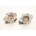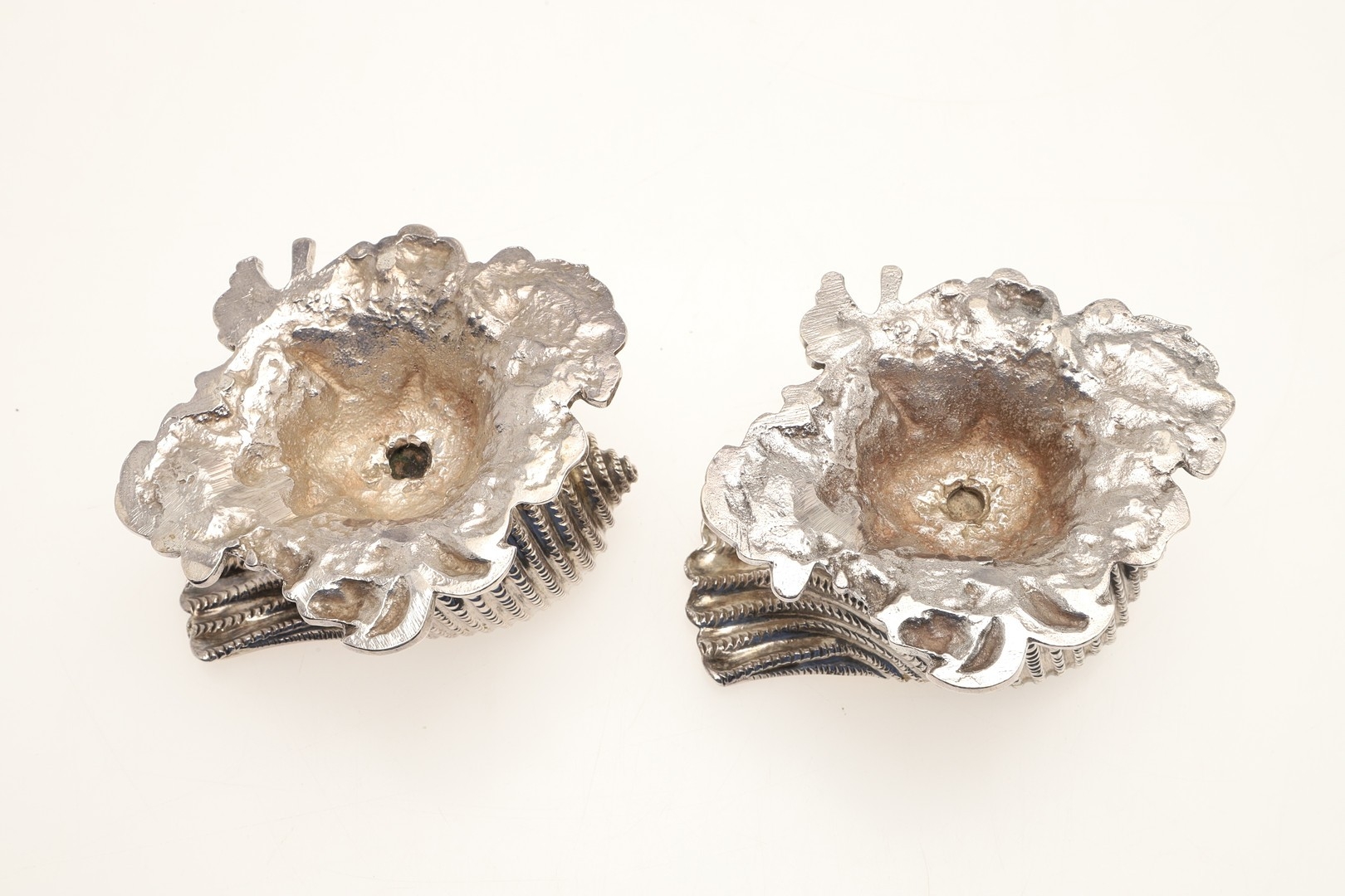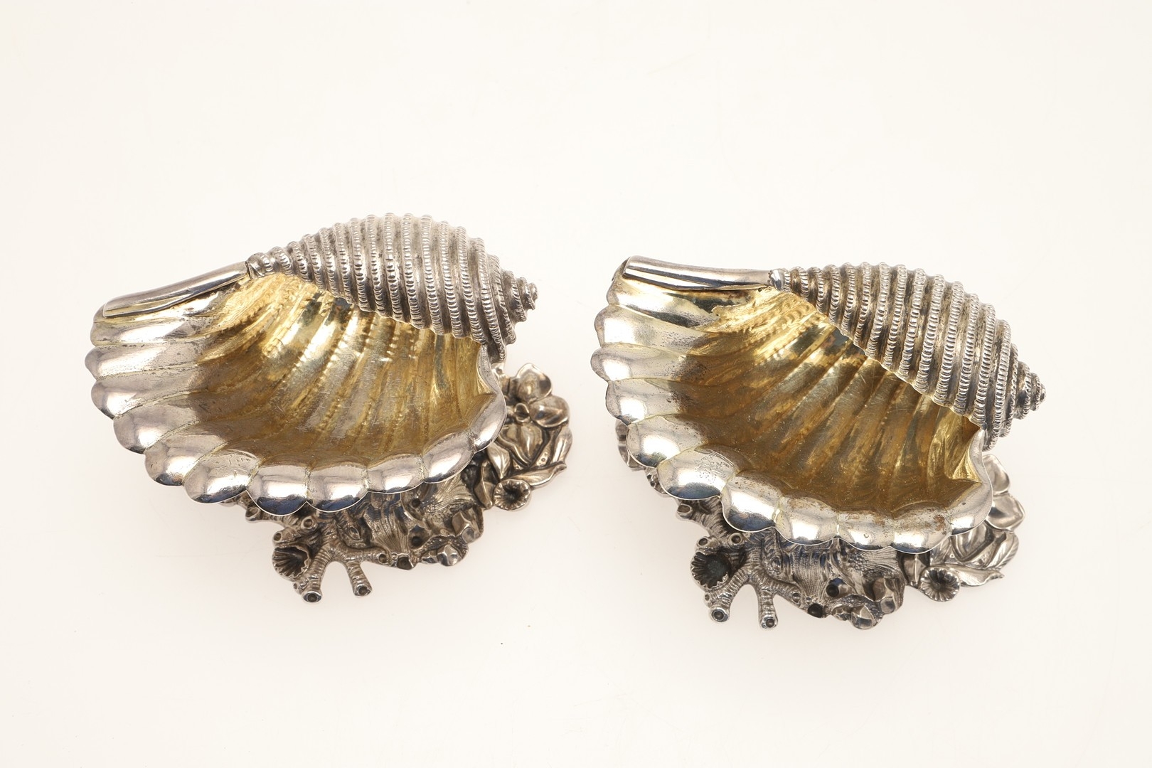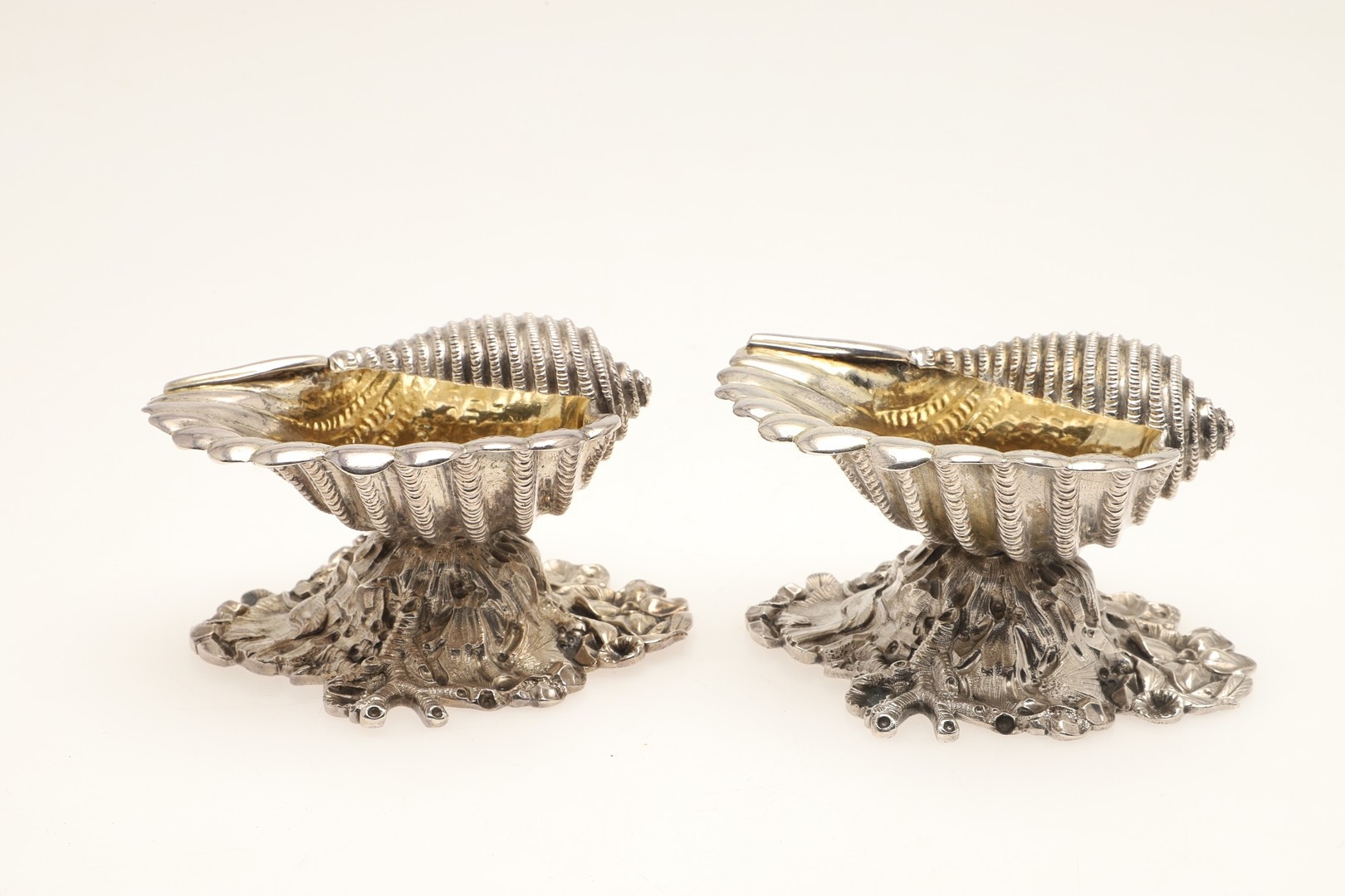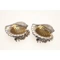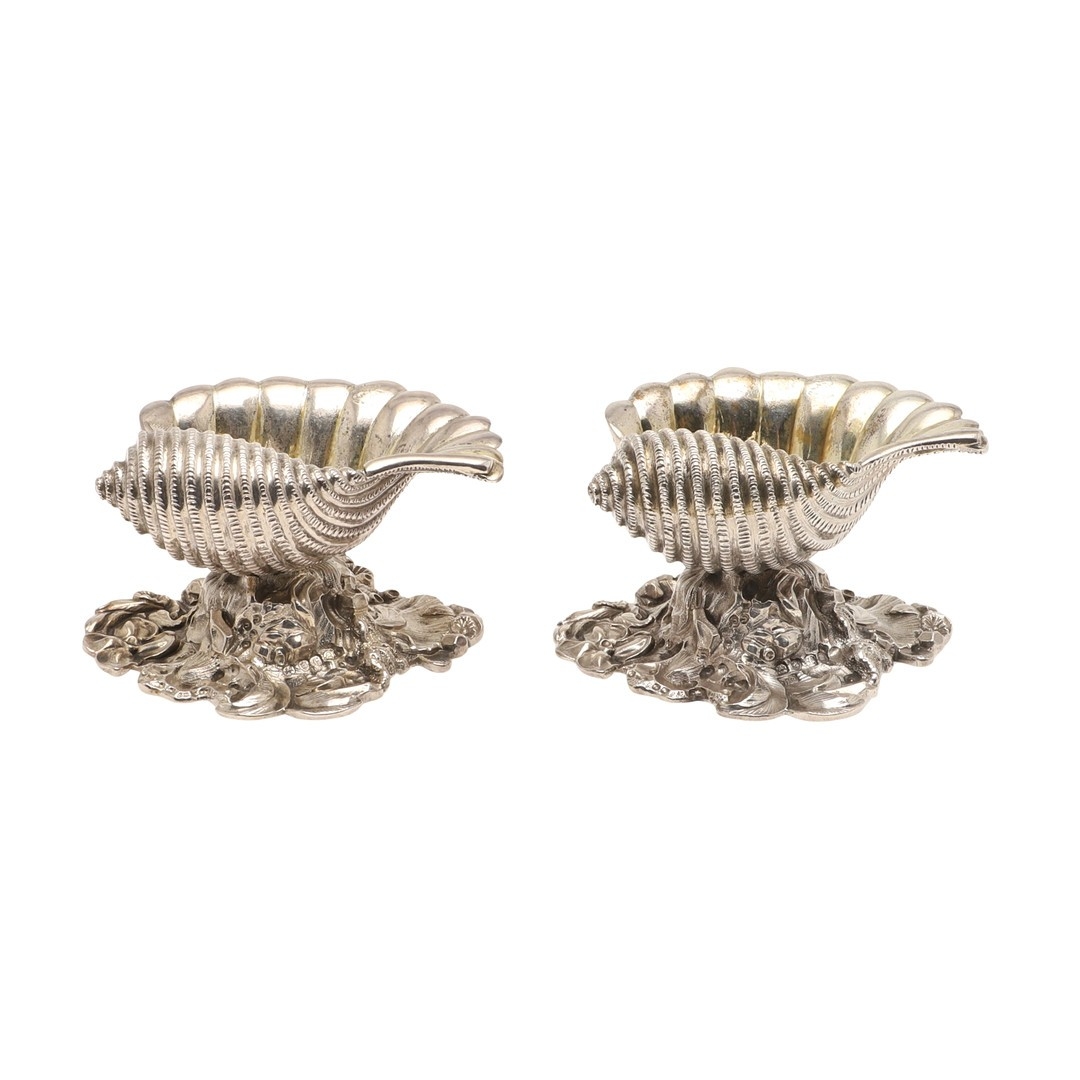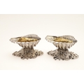 A PAIR OF EARLY GEORGE IV SILVER SALTS IN THE FORM OF SEA SHELLS. On a cast naturalistic base, hallmarked William Burwash, London, 1821. Height 6.5cm x Diameter 11cm. Total weight 21.4ozt. (2).