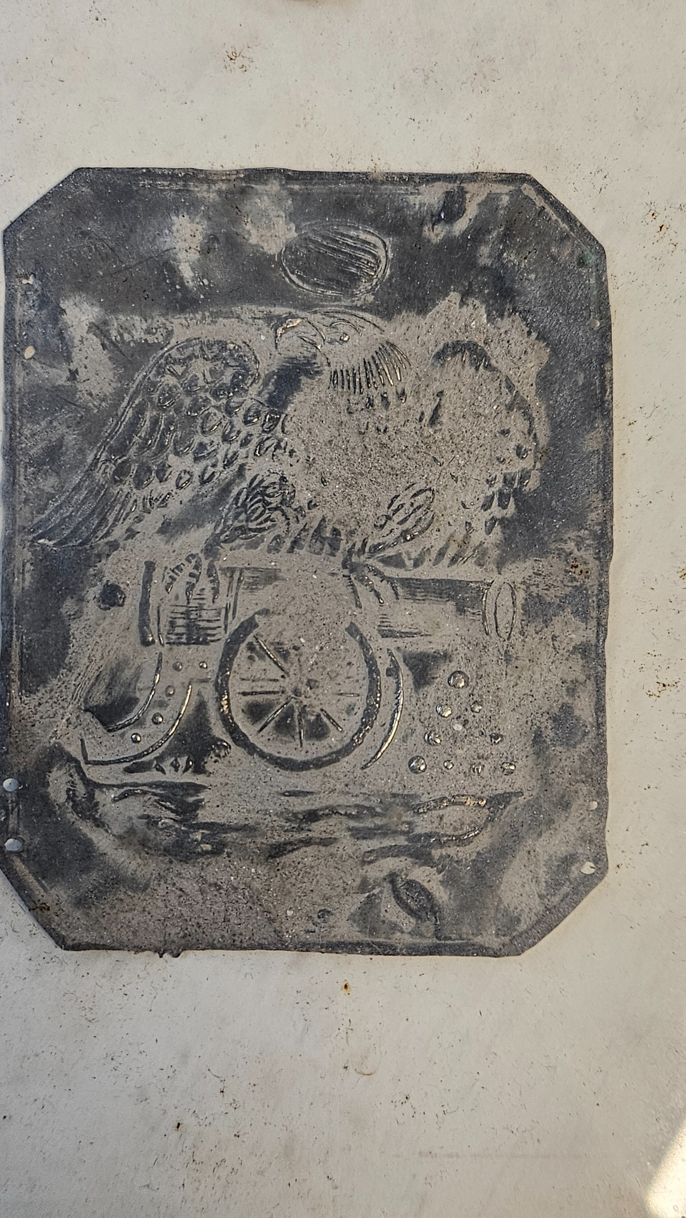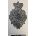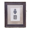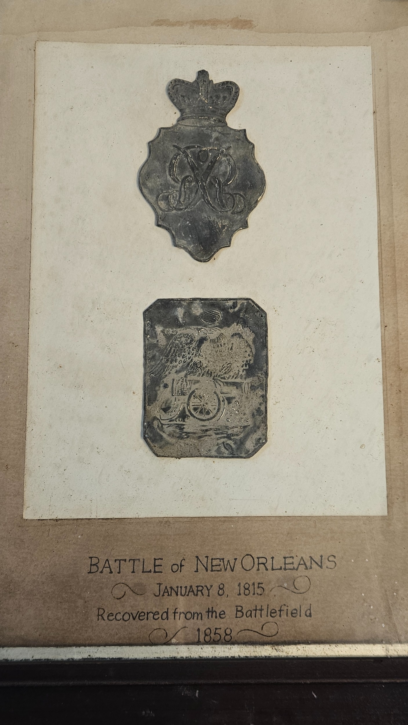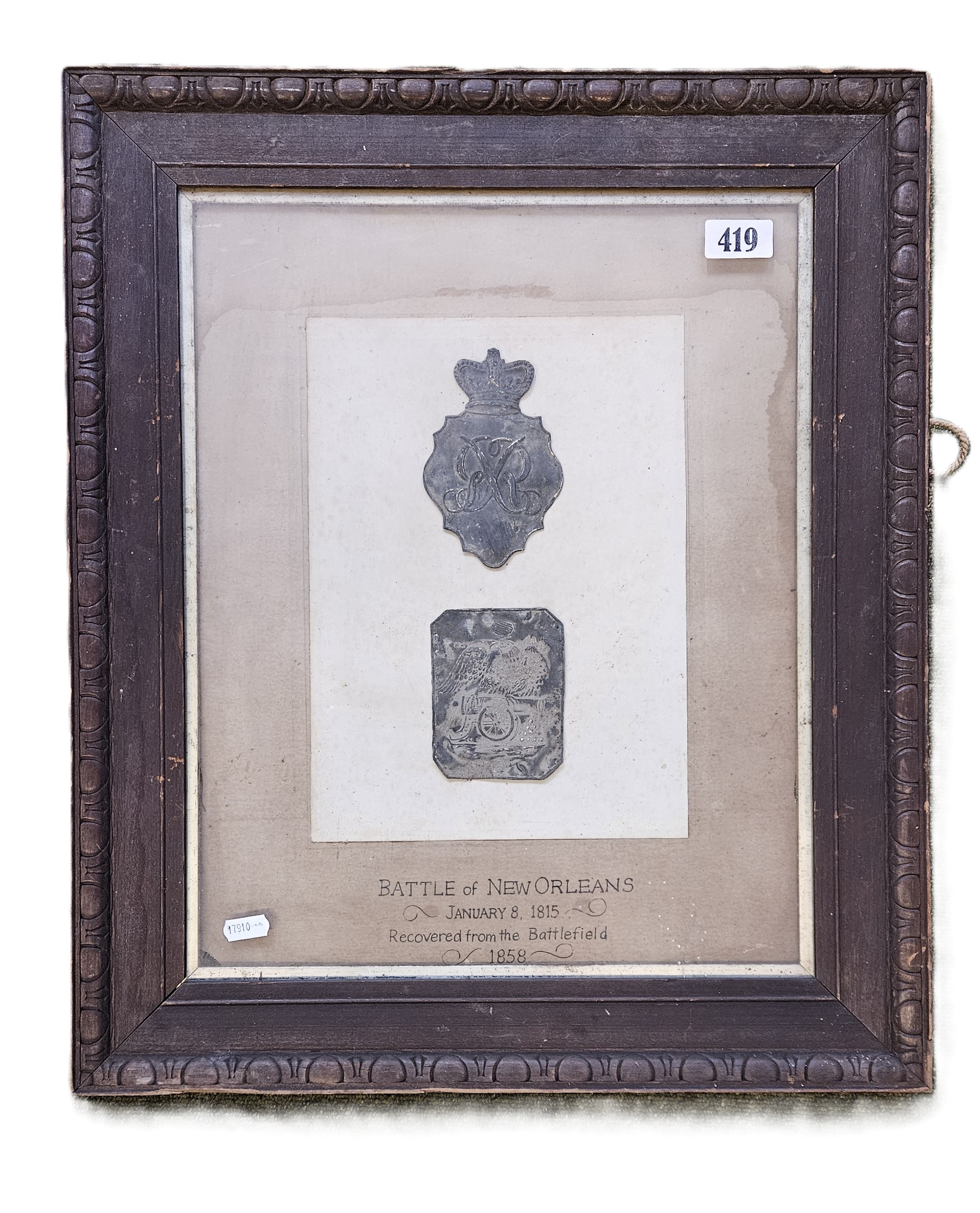 War of 1812 Battle of New Orleans Interest; British 1812 Shako plate and US Shako Plate Framed 'Battle of New Orleans January 8th 1815 Recovered from the Battlefield 1858' to reverse 'The Property of Gallier Hall New Orleans'