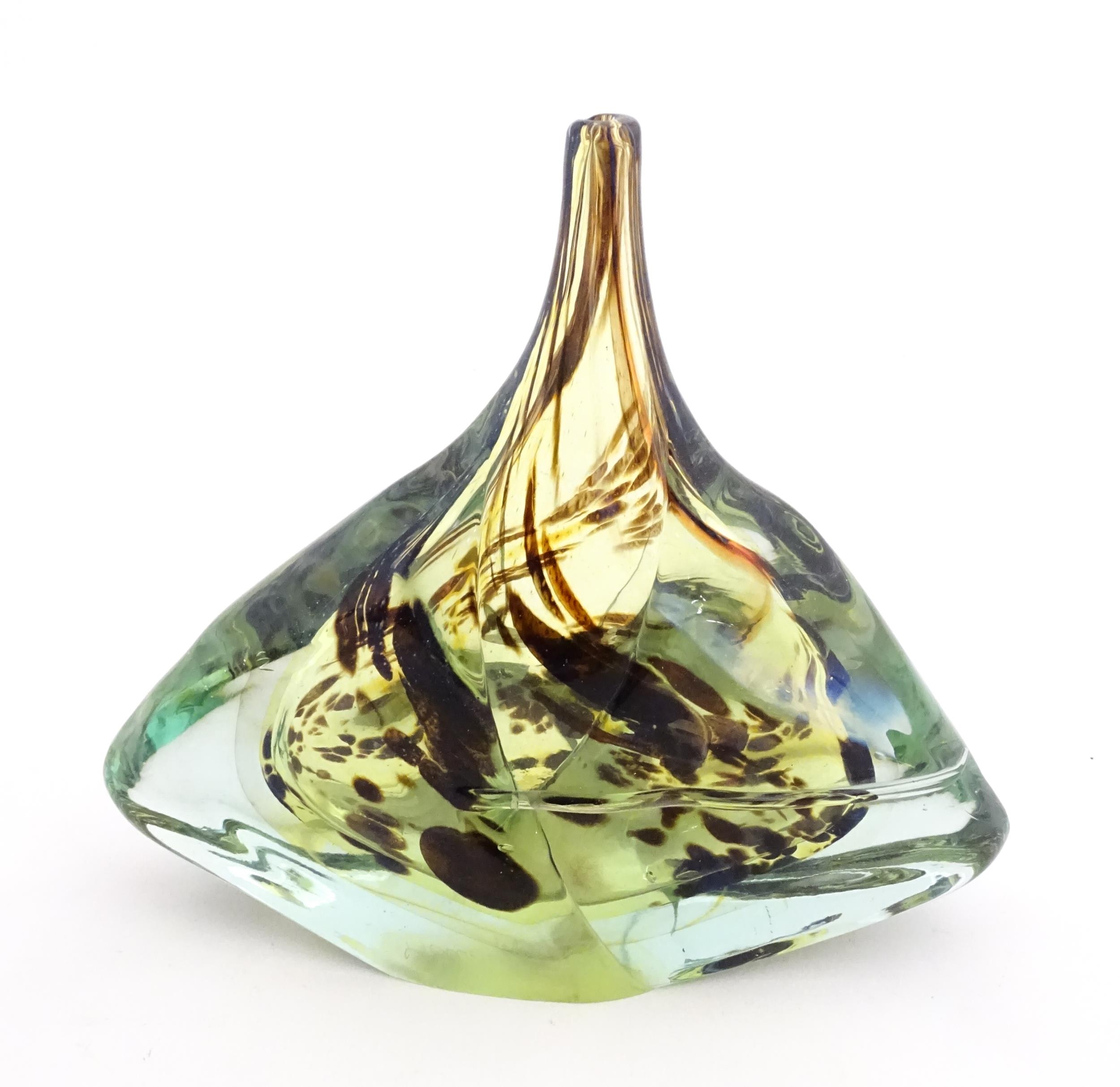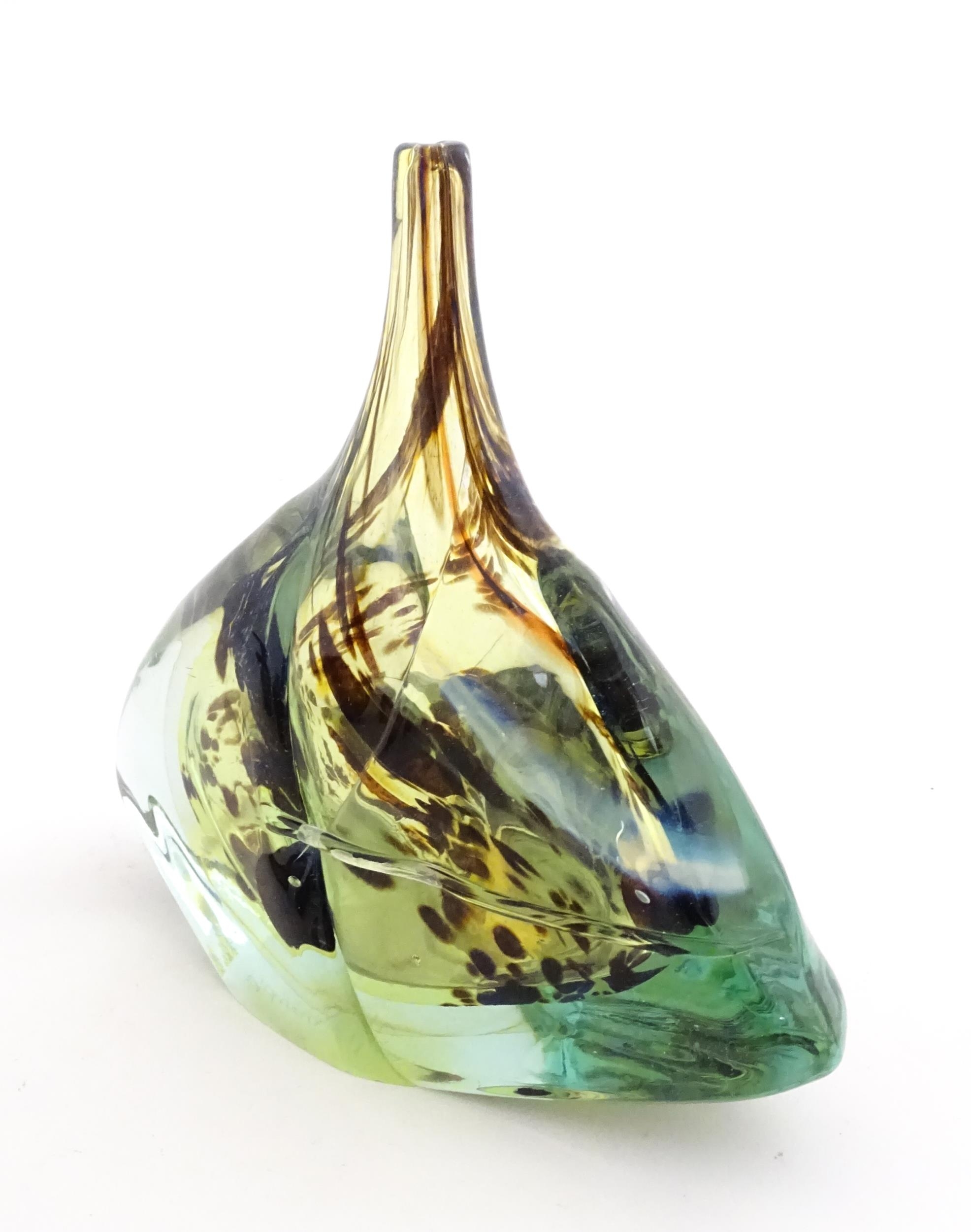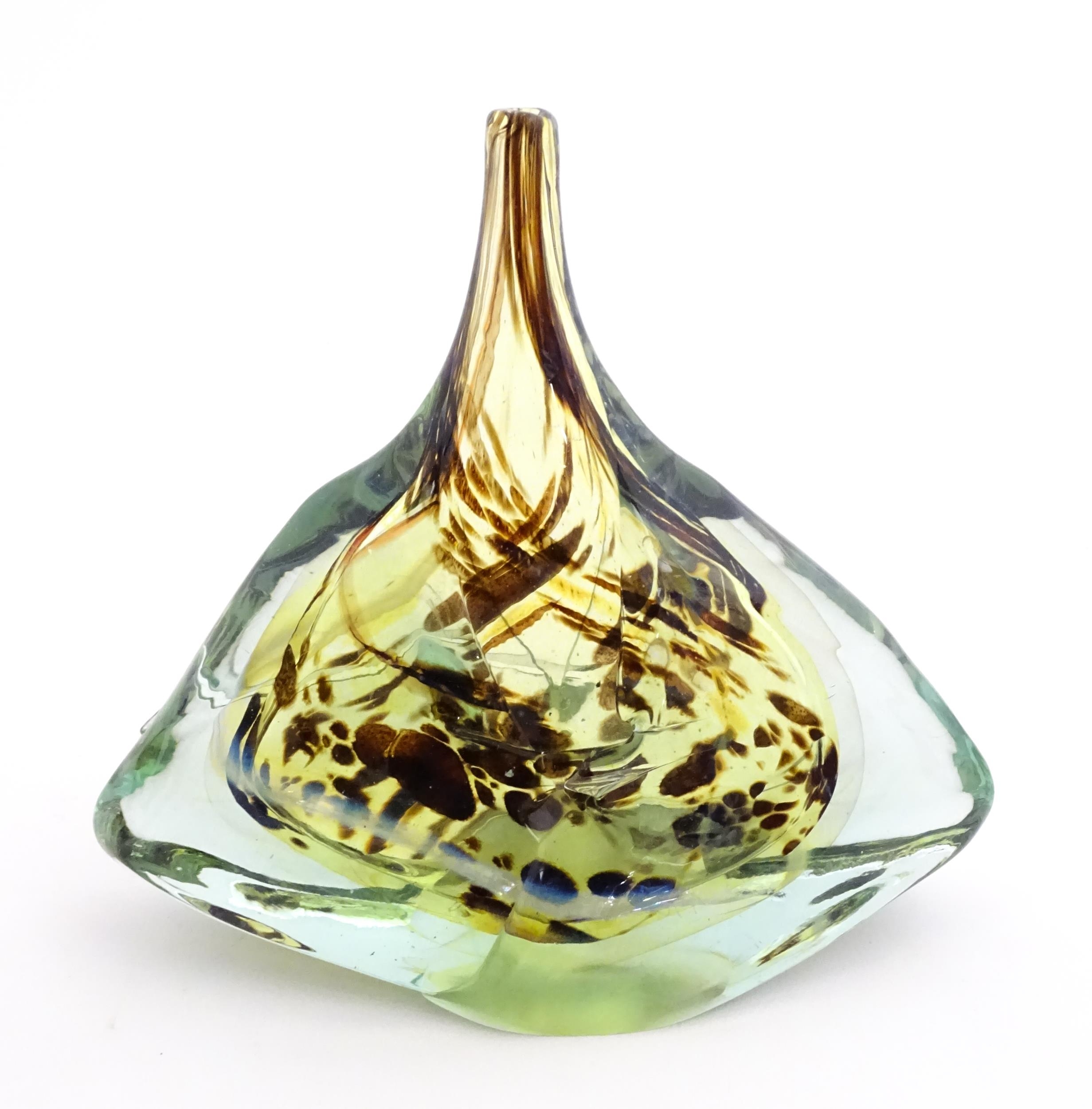 A Mdina glass axe head / fish head vase of angular form with elongated neck. Signed under Mdina Glass and dated 1976. Approx 7 3/4" high