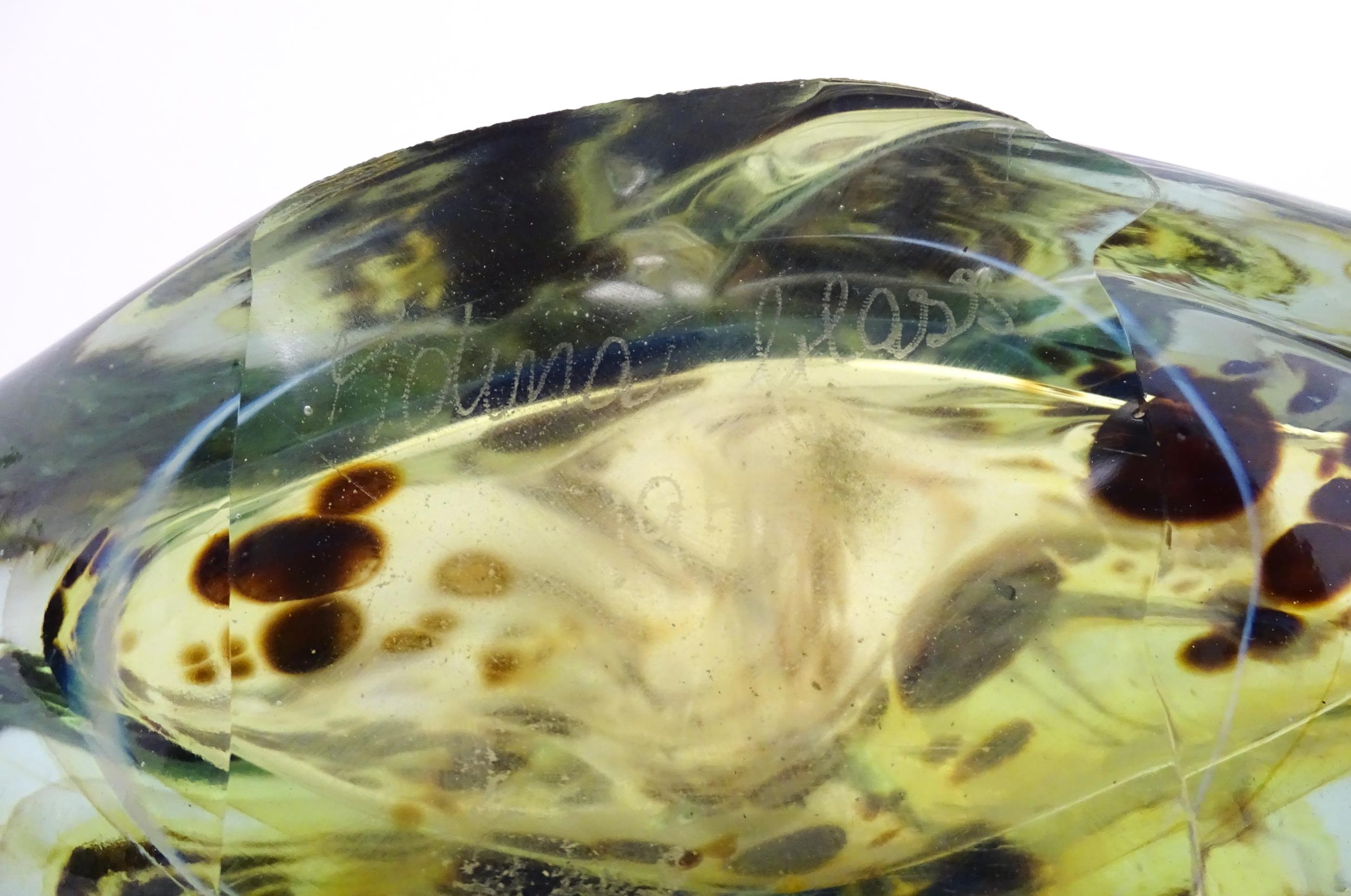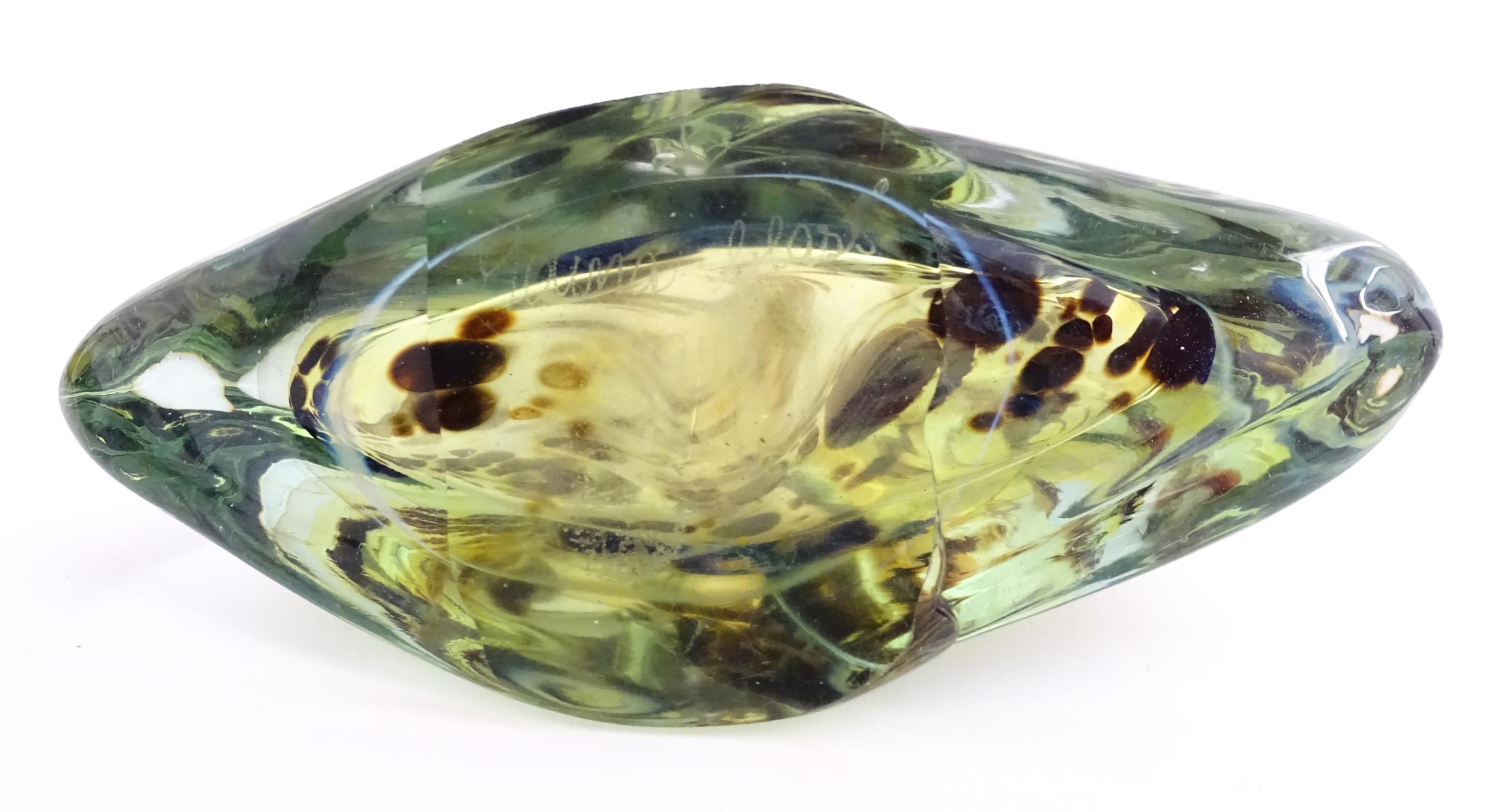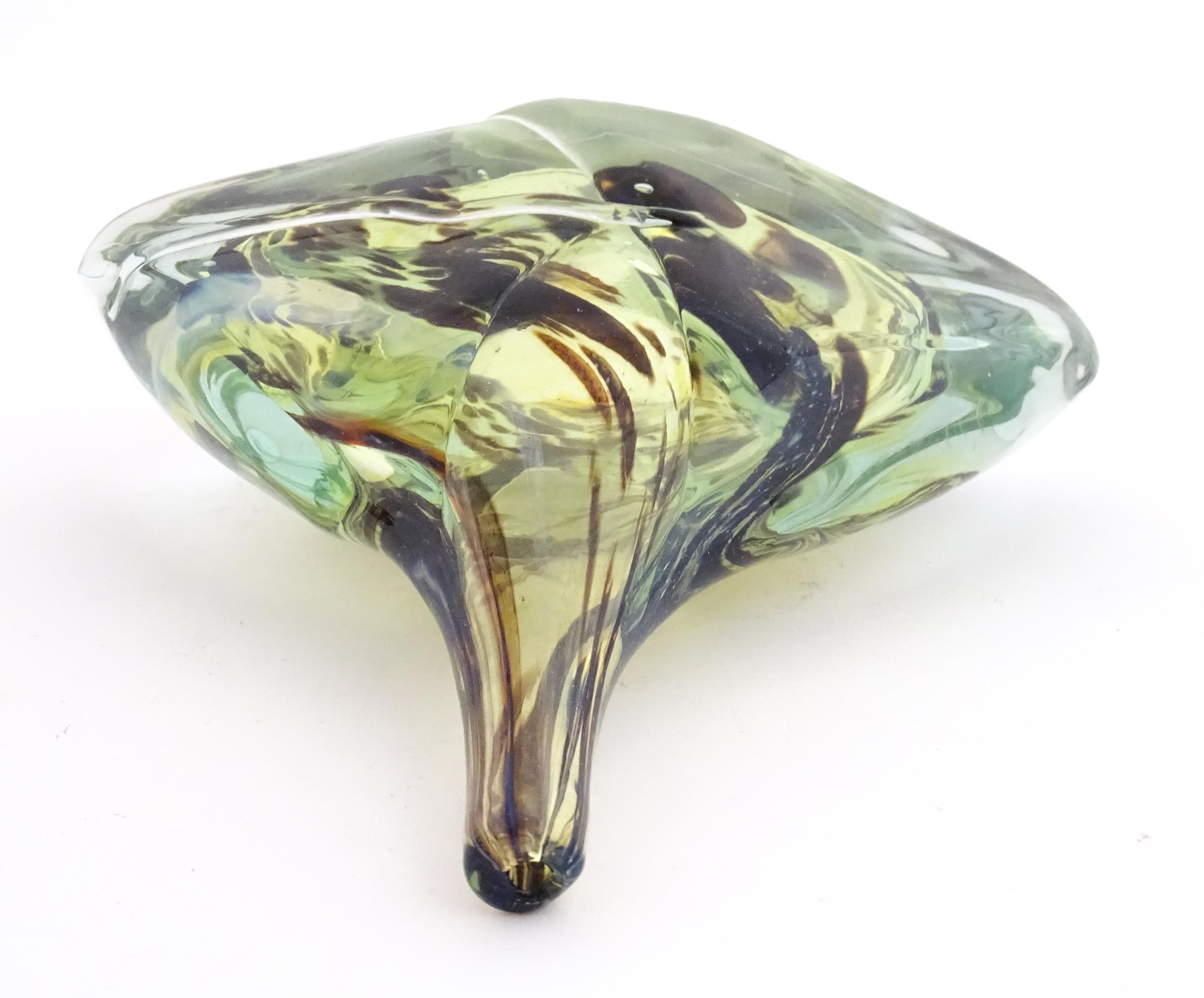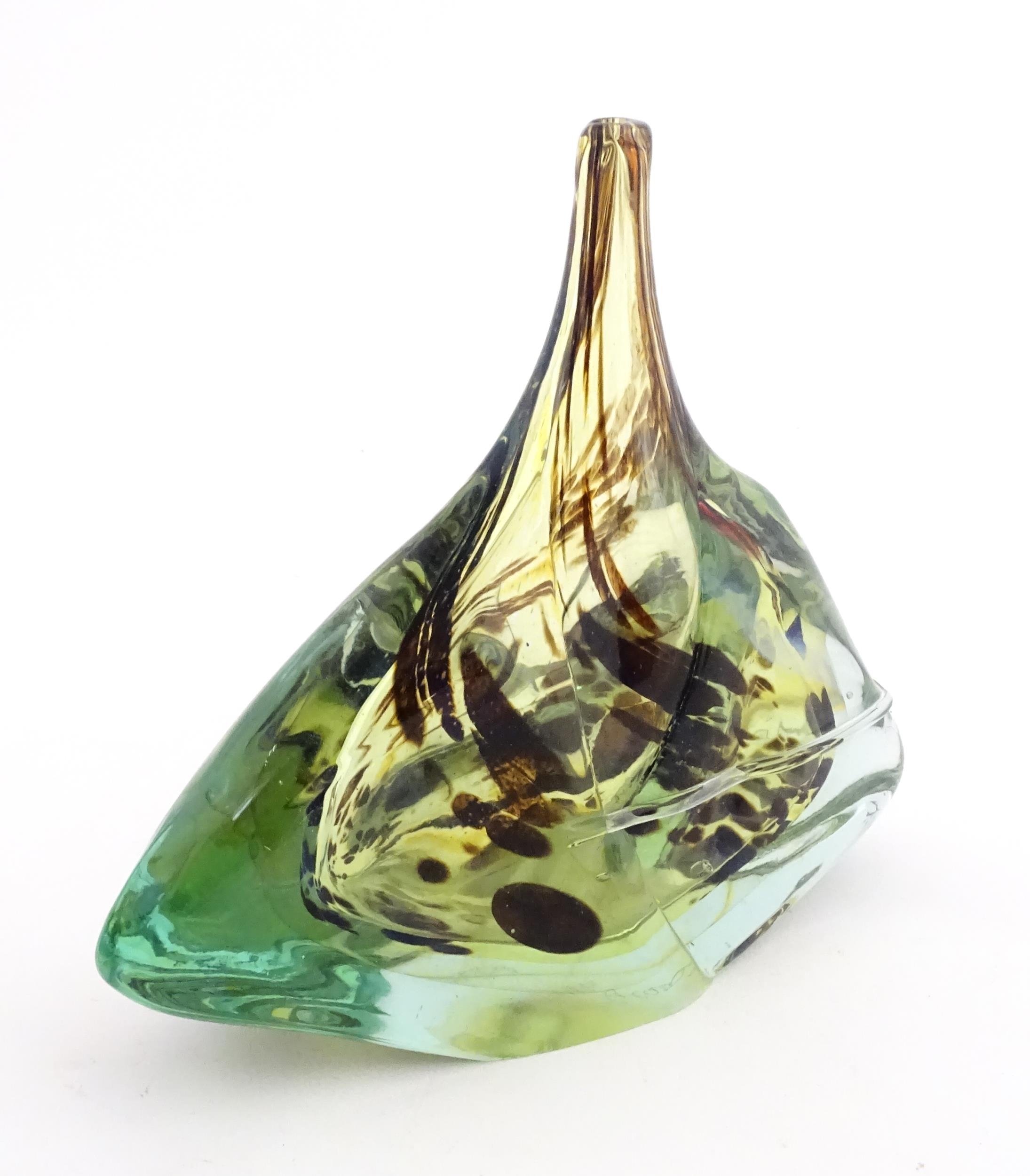 A Mdina glass axe head / fish head vase of angular form with elongated neck. Signed under Mdina Glass and dated 1976. Approx 7 3/4" high