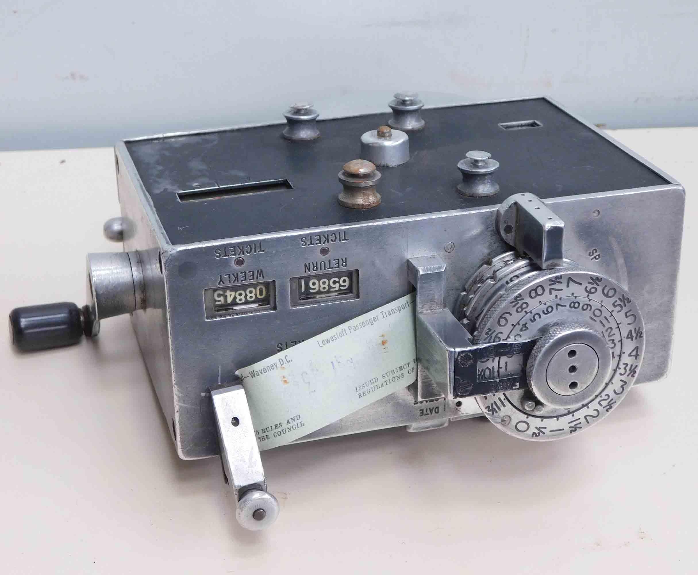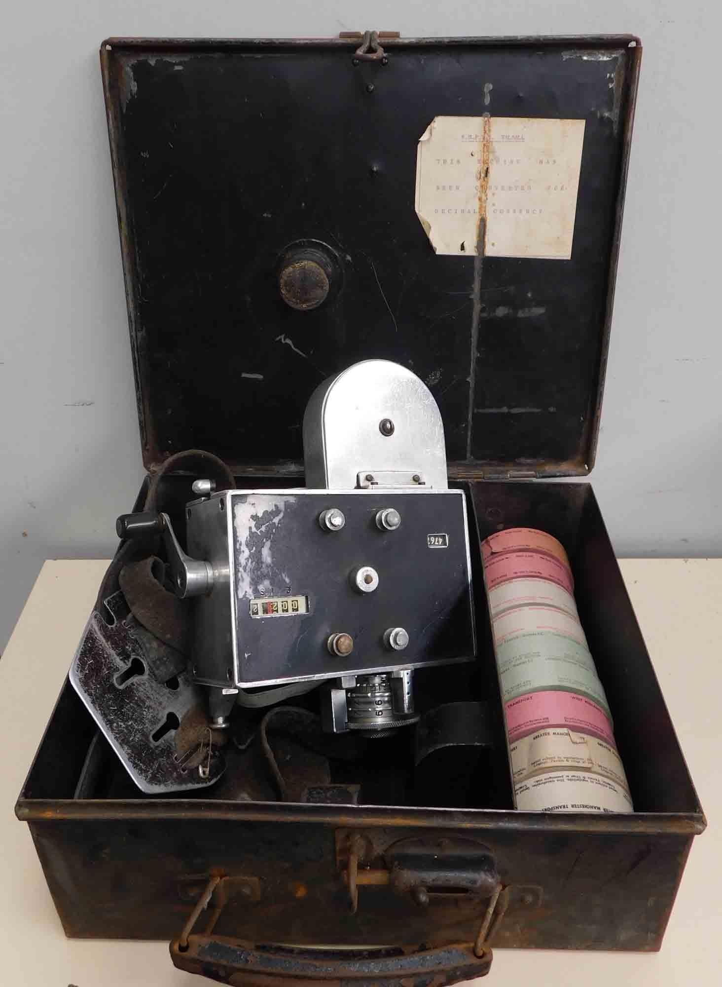 Vintage Setright ticket machine with tin, strap and ticket rolls