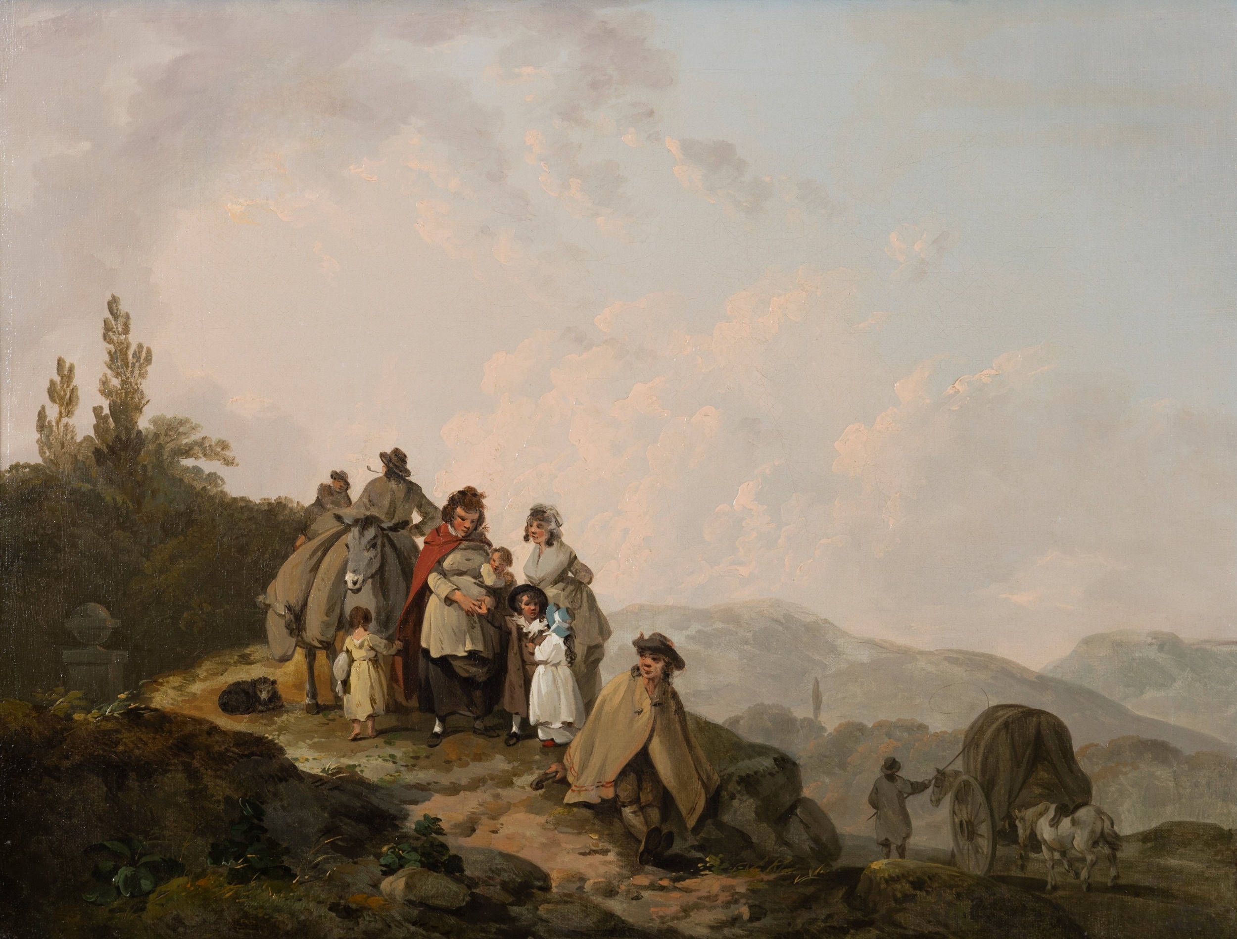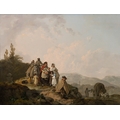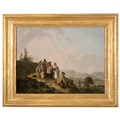 ***WITHDRAWN*** FRANCIS WHEATLEY RA (1747-1801) Travellers Resting on a Country Road Oil on canvas, 48.5 x 65cm Provenance: Miss Elizabeth Laidlaw, Castleknock, Co. Dublin, circa 1940's and thence by descent; Whytes Auctioneers, Dublin, 25th April 2006 lot no. 103; The Gorry Gallery, An Exhibition of 18th to 20th Century Irish Painting, March 2008, catalogue no. 5 Born in London, the son of a tailor, Francis Wheatley first trained at William Shipley’s academy. He may also have received some instruction from Richard Wilson, to whom Strickland attributes his later excellence in the field of landscape painting.1 At the age of fifteen he was awarded a prize for drawing by the Society of Artists; further prizes followed in 1763, ‘67 and ‘69. During these years he travelled to expand his artistic education. He appears to have first visited Ireland in 1767, for in the records of the Society of Artists for that year it is recorded that a half-share in the premium for views from nature went to “Francis Wheatley in Ireland”.2 His career progressed rapidly. After only a year at the Royal Academy Schools he was elected a fellow of the Royal Society of Artists, and by 1772 was made Director of that body. At this time his work consisted mostly of small, full-length portraits and conversation pieces in the manner of Johan Zoffany. He also undertook commissions to paint the interiors of certain noblemen’s homes, including Brocket Hall for Lord Melbourne. During these years he developed what was to be his signature style of clear, pale colour handled in a free and sensitive manner. Success however, led to profligacy. He accrued debts and had, in the words of Edward Edwards, “the folly to engage in an intrigue” with the wife of a fellow artist, John Alexander Gresse.3 In 1779 Wheatley fled to Ireland with Mrs Gresse, whom he passed off as his wife. Prior to this deception becoming known, Wheatley received several important portrait commissions in Ireland including The Macartney Family (Art Gallery, Ontario) and The Marquess and Marchioness of Antrim (NGI). He also executed some of the most important large-scale history paintings of his career whilst in Dublin. The best known of these are The Irish House of Commons in 1780 (the only contemporary painting of the interior of the House of Commons) and A View of College Green with the meeting of the Volunteers on the 4th November 1779 (NGI). This last named work was first exhibited at the Society of Artists in William Street, Dublin, in 1880, along with four others by Wheatley – two portraits and two landscapes of Clontarf and Kingstown (Dun Laoghaire) respectively. This was to be his only public exhibition in Ireland. In addition to official portraits and history paintings, Wheatley toured Ireland painting delicate watercolour landscapes and studies of the Irish peasantry. Crookshank and Glin note that ”Wheatley’s Irish work is especially interesting for a number of genre subjects in the Wouverman manner of Irish fairs, fisherfolk and gipsy encampments” and comment that they “capture the late eighteenth century Irish scene better than most artists because of their fluency, clarity and gaiety”.4 According to Mary Webster, Wheatley owned a number of drawings by the Dutch master Phillip Wouvermans and was a great admirer of his depictions of travellers and country fairs.5 Both artists evidently empathised with their subjects; in the words of Gandon and Mulvany, Wheatley “succeeded in delineating the characters of the peasantry, in perfect accordance with the humours he met with on these subjects”.6 It was this empathy that led James Kelly to rate Wheatley’s Irish genre scenes as “one of the most rewarding and appealing vistas on to the daily life of the common people of late eighteenth century Ireland”.7 Among Wheatley’s Irish genre scenes are a number of watercolours in the National Gallery of Donnybrook Fair, which were the basis of a large oil of that subject exhibited at the RA in 1784 (no. 91). These share many attributes in common with the present oil, including the artfully arranged groupings of people and animals, the play of light and shade with some groups seen in silhouette from behind, and the use of a narrow device such as a staff or in this case a horse-whip to lead the eye from figure to figure. In Scene at a Fair (reproduced in Webster, op. cit., page 51), a small figure in a travelling cloak is seated in the foreground, echoing the placing of the man with his roughly pinned cloak in the Travellers Resting on a Country Road. In both the watercolours and the present oil Wheatley displays his command of animal painting by depicting horses and donkeys from every conceivable view-point, invariably placing them in such a way as to again direct the eye into the main focal point of the composition. Horses feature in another oil painting, A Gypsy Encampment in Ireland, integrated into the main grouping of figures (Colonel Grant collection, see Webster, page 133). The somewhat malevolent stare of a mongrel dog accosts the viewer, a device that reoccurs in Riot in Broad Street (engraved 1790, fig. 61 in Webster). Wheatley returned to London early in 1784. In that year’s RA exhibition he showed four Irish works. His depictions of Irish fair scenes and country folk proved popular in England, and he continued to produce them long after he returned from Ireland. These Irish peasants also gradually evolved into general rustic ‘types’, which likewise found a ready market among English audiences. Wheatley went on to specialise in this genre, with his Cries of London becoming one of best-selling series of eighteenth century prints. In 1791 he was elected a Royal Academician, but his final years were plagued by gout and debts. 1 Walter Strickland, A Dictionary of Irish Artists, Vol. II, Maunsel & Co., Dublin, 1913, page 519. The most comprehensive source of information on Wheatley is the monograph on him by Mary Webster