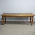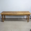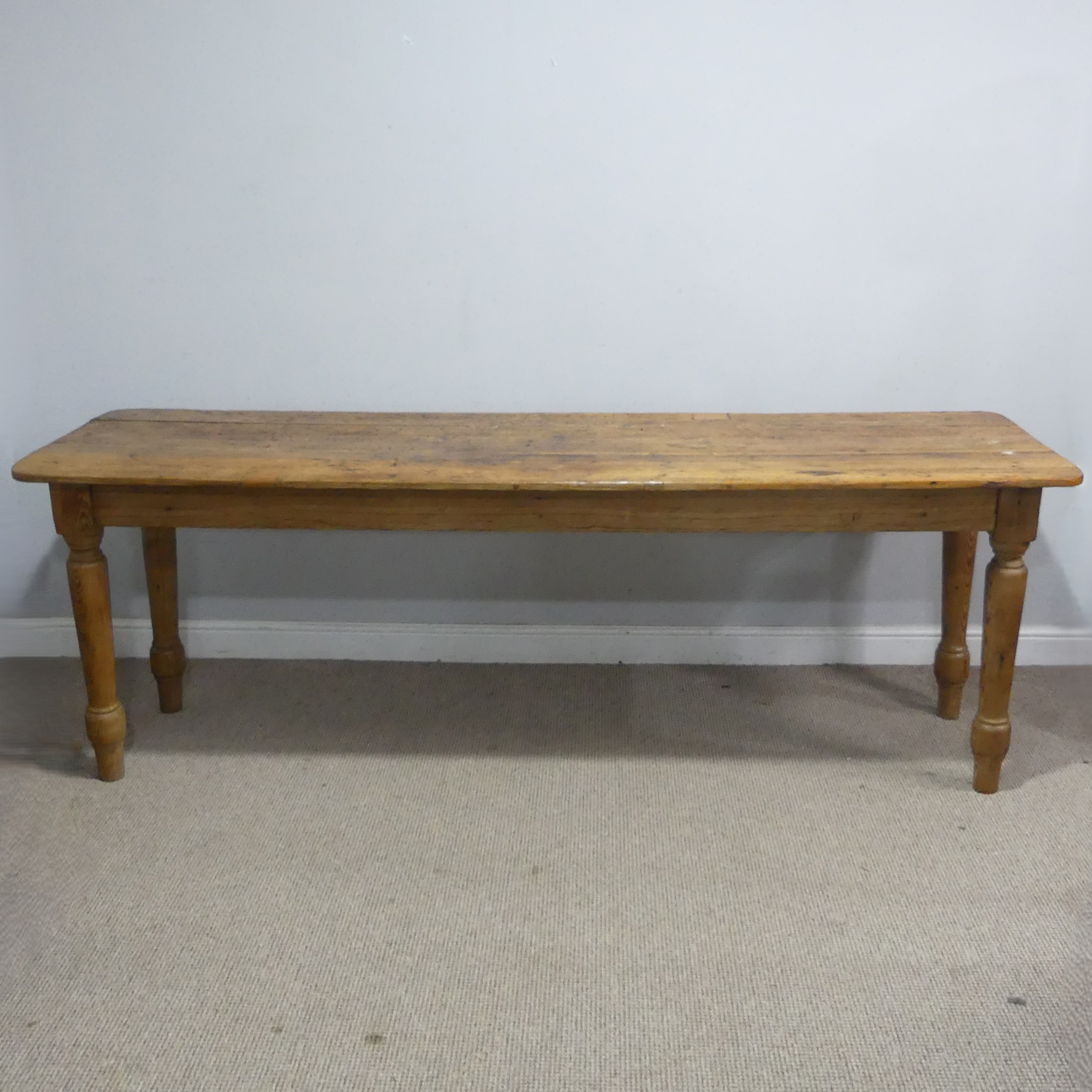 An early 19th century pine wake Table, of long and narrow proportions, stamped 'E.R' to the front left support, W 220 cm x H 75 cm x D 63 cm. Note, this item is structurally sound however does not have particularly stable supports.