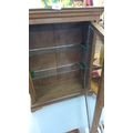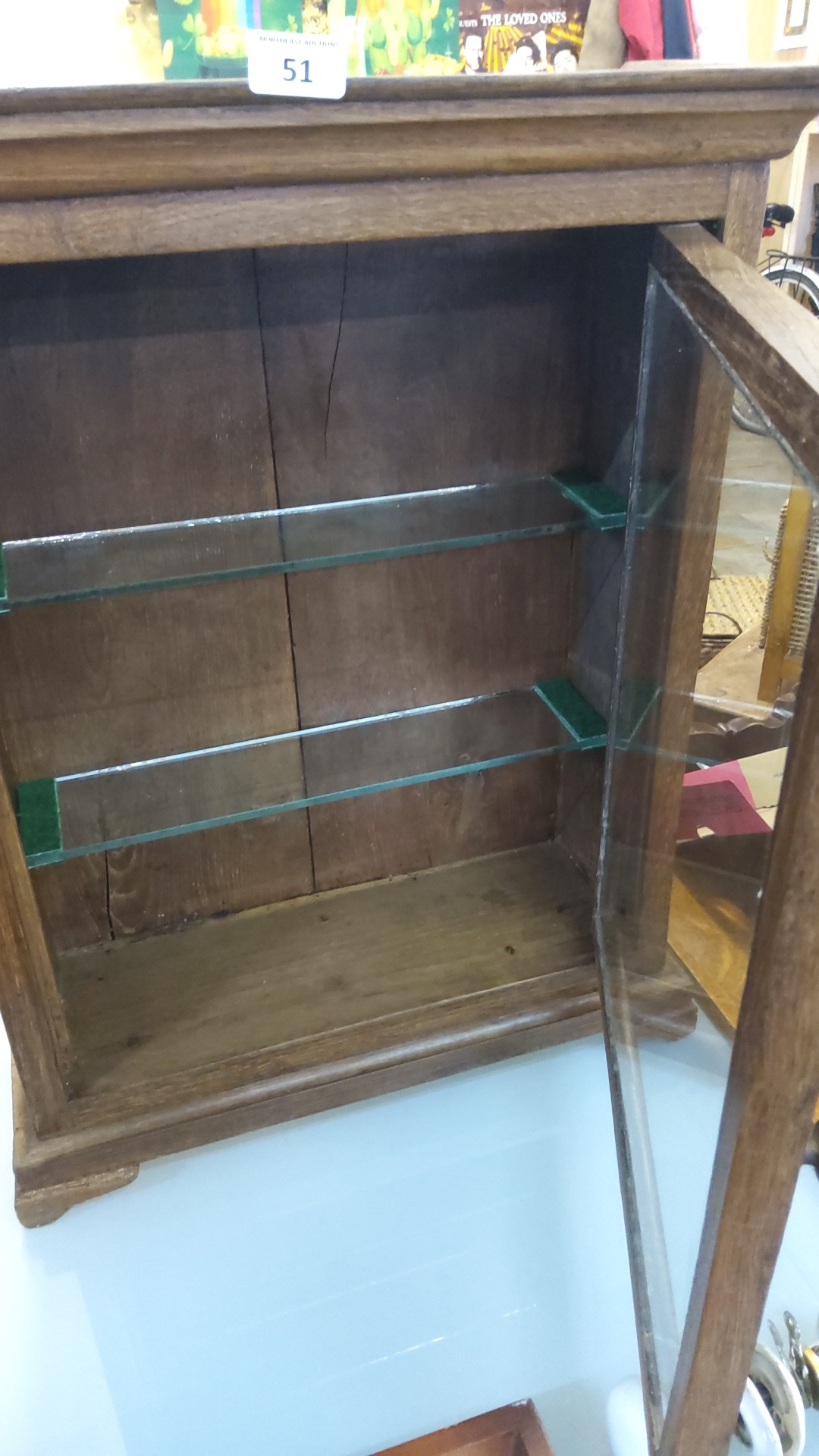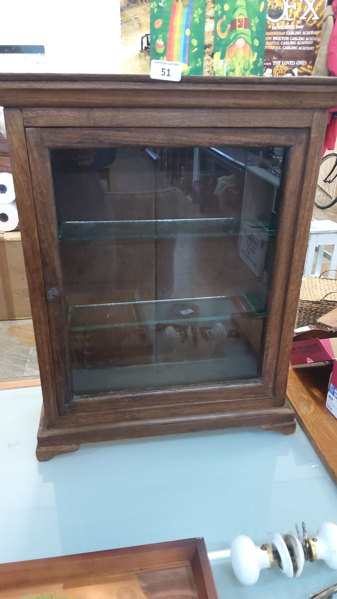 Vintage glazed heavy oak counter top shop cabinet, the moulded cornice above a single hinged glass door opening to an interior fitted with two glass shelves, raised on a shallow plinth base.