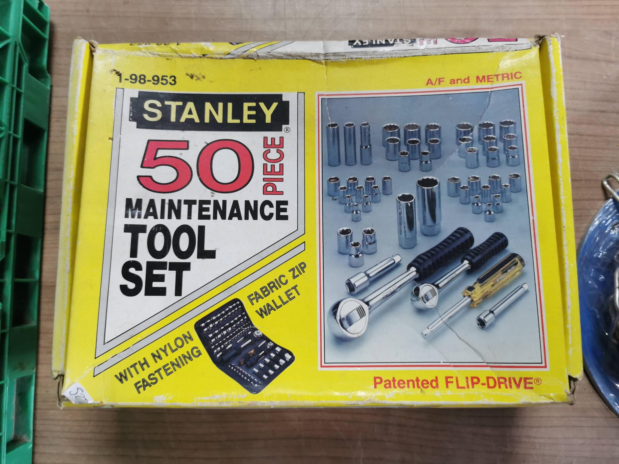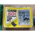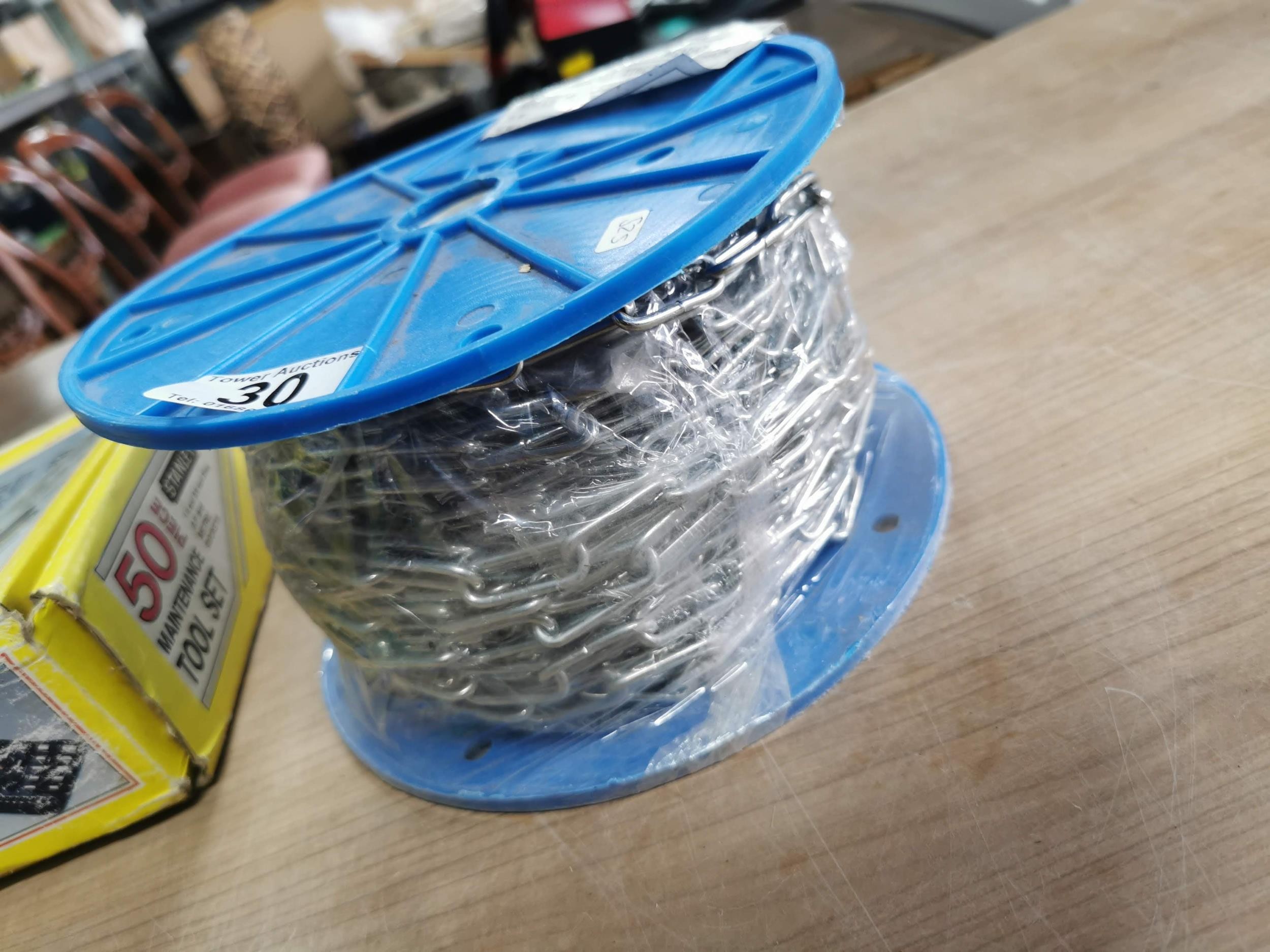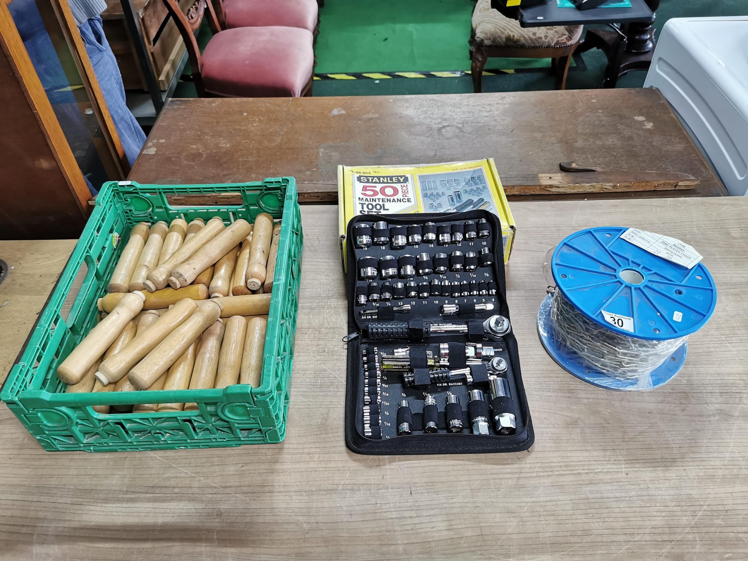 Tray of tool handles a great 50 piece Stanley tool set new in box and a new reel of zinc plated chain 30meter 3mm x 26mm.