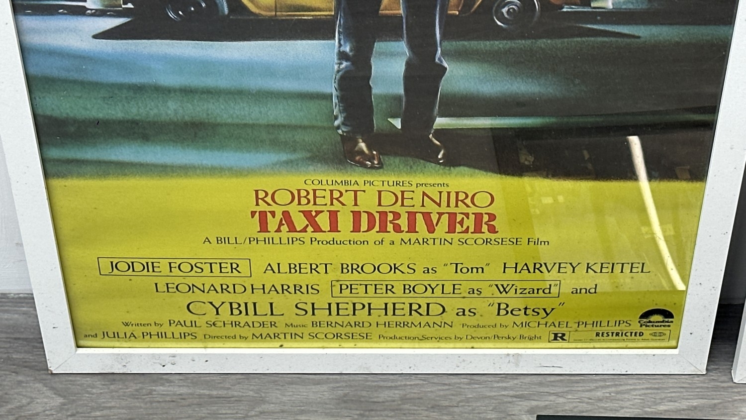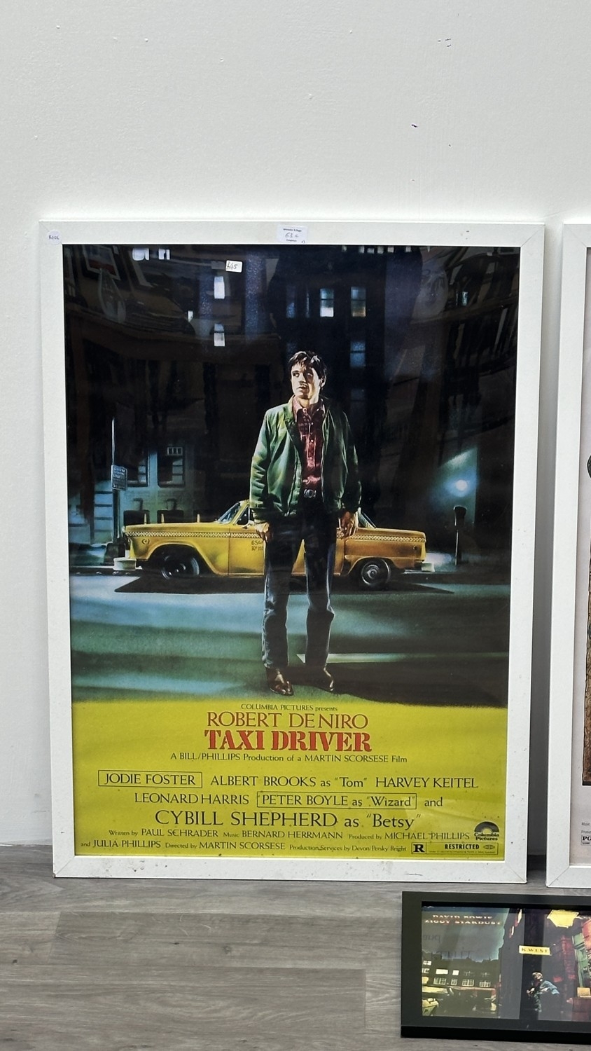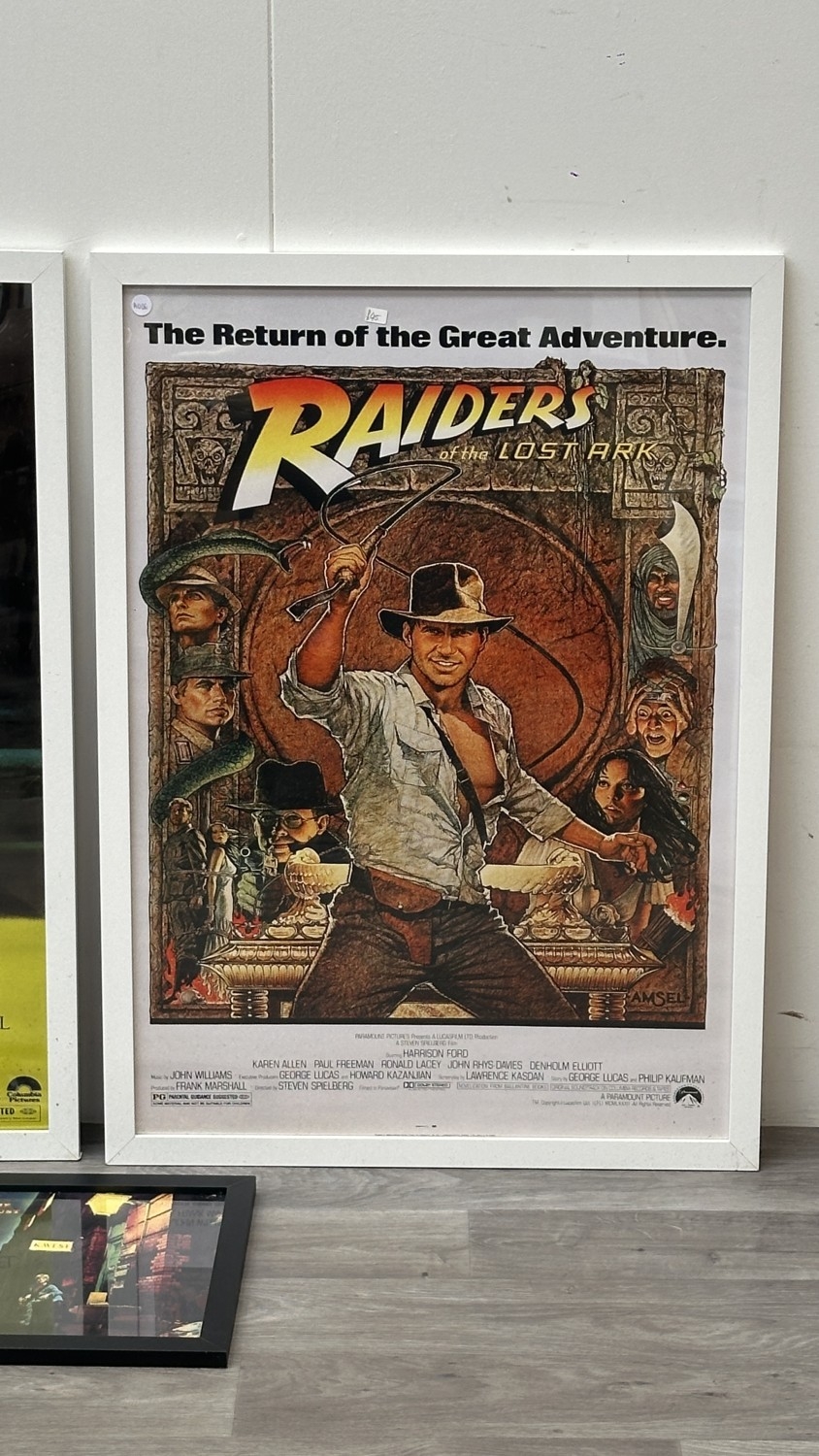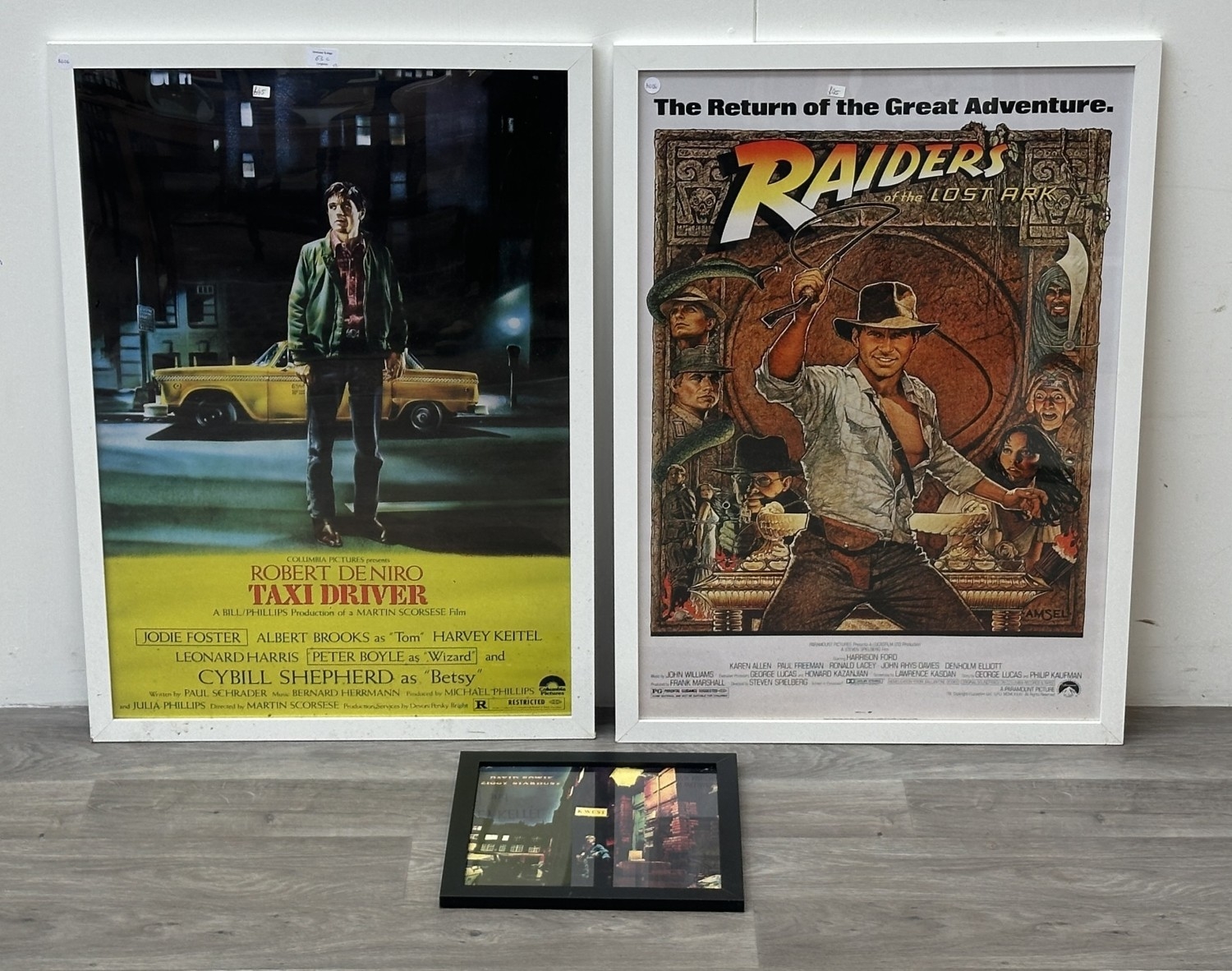 Three framed reproduction prints, one Robert De Niro Taxi Driver, one Raiders of the Lost Ark and one David Bowie The Rise and Fall of Ziggy Stardust and The Spiders from Mars - largest approx. 89cm high x 64cm wide