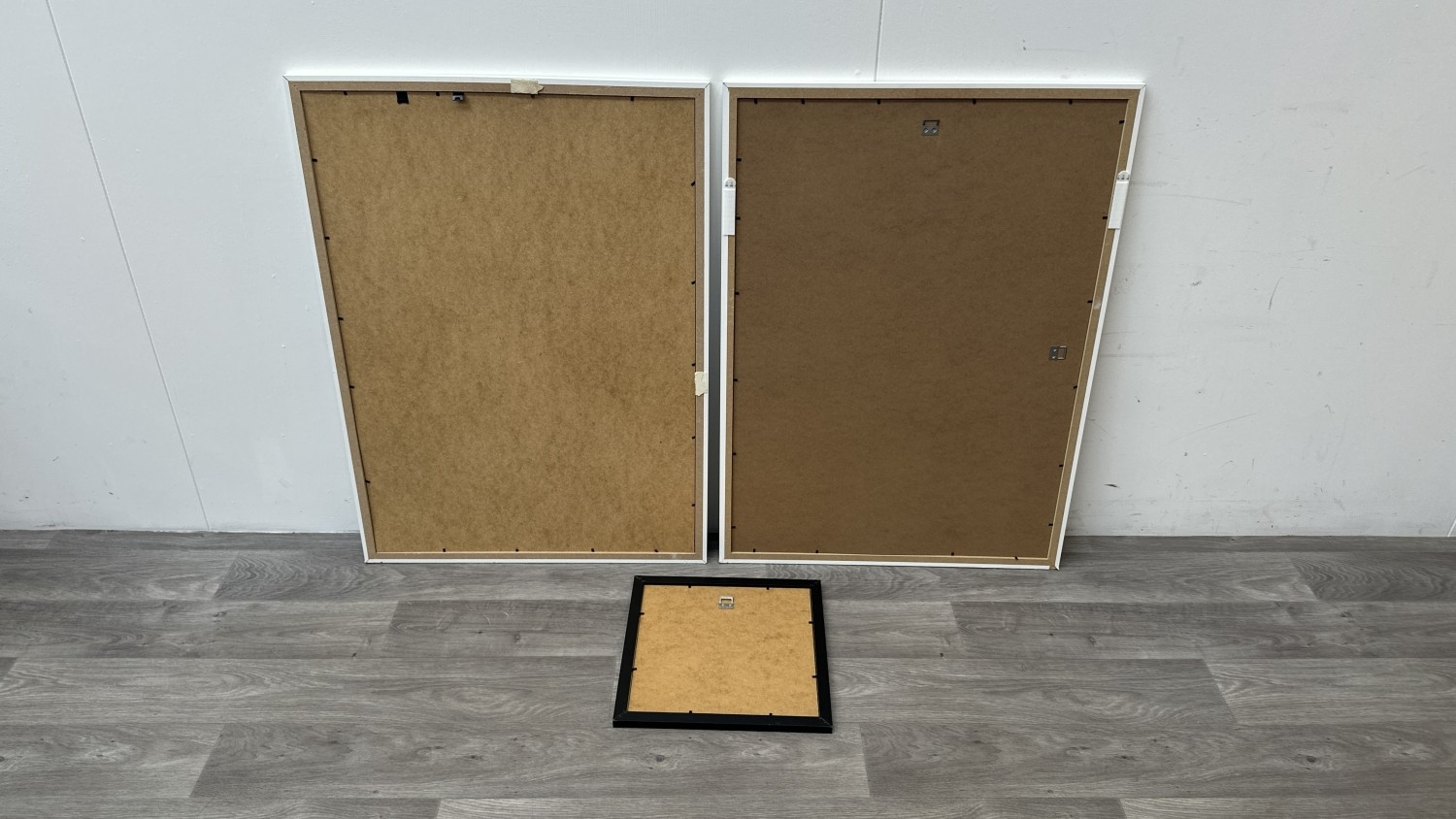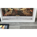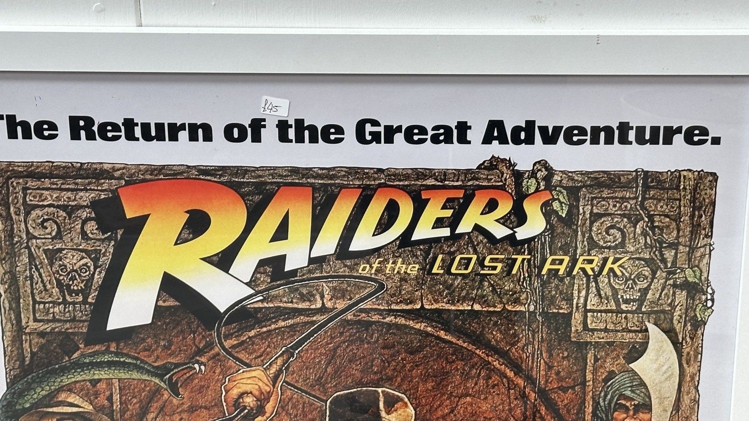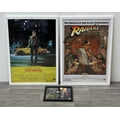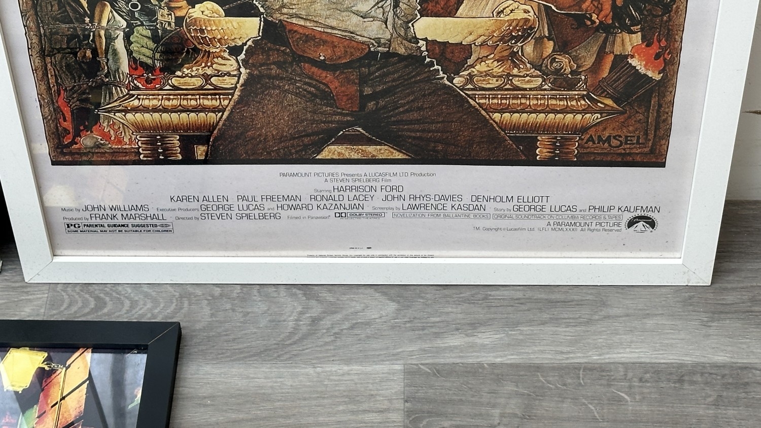 Three framed reproduction prints, one Robert De Niro Taxi Driver, one Raiders of the Lost Ark and one David Bowie The Rise and Fall of Ziggy Stardust and The Spiders from Mars - largest approx. 89cm high x 64cm wide