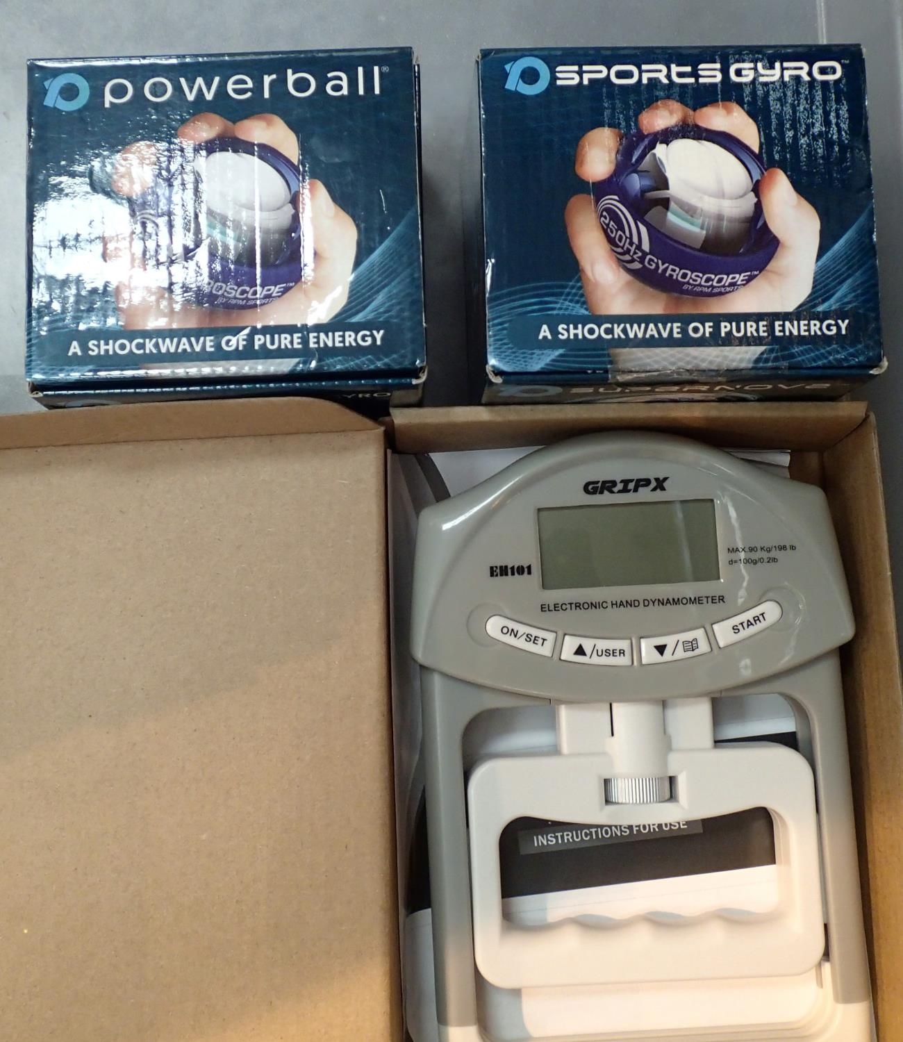 Mixed electronic items exerciser to include two gyroscopes and gripz. Not available for in-house P&P, contact Paul O'Hea at Mailboxes on 01925 659133