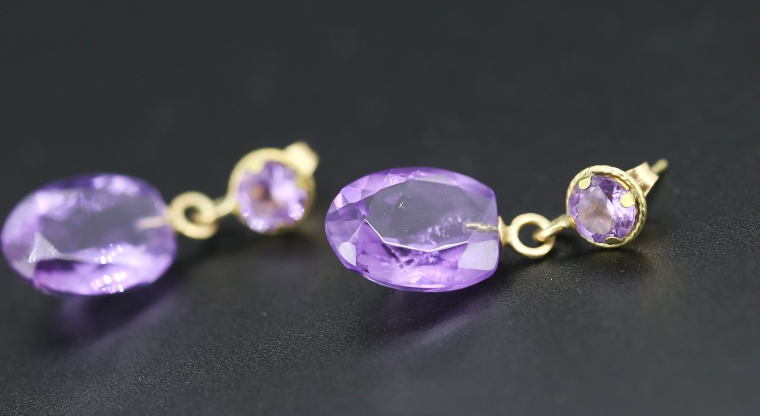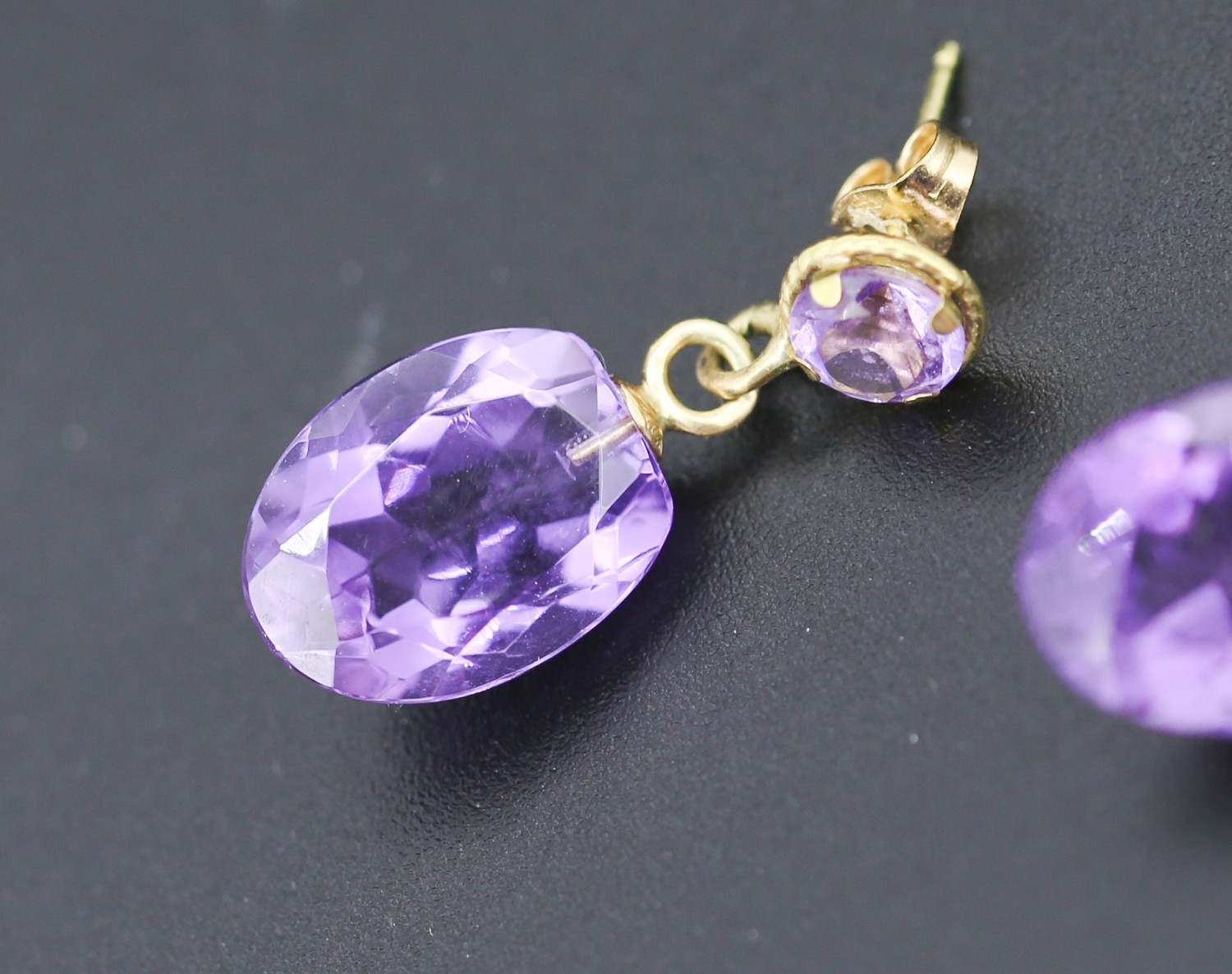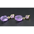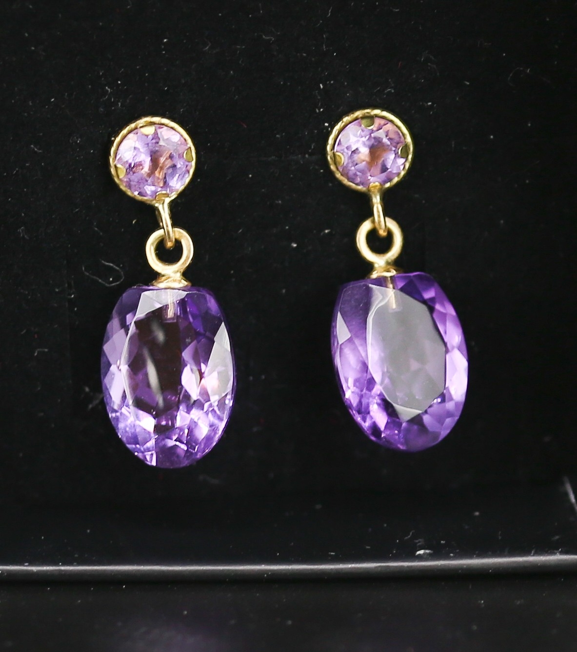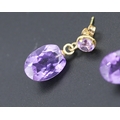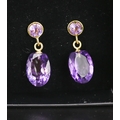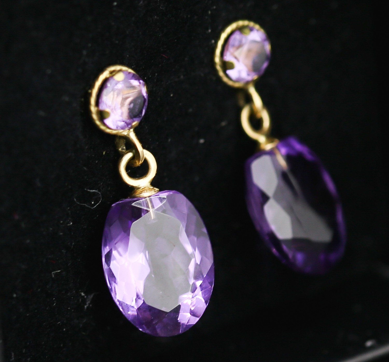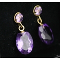 Matching Pair of Amethyst Set Drop Earrings Mounted in 18 Carat Yellow Gold Each 2cm Drop Total 11 Carat of Amethyst