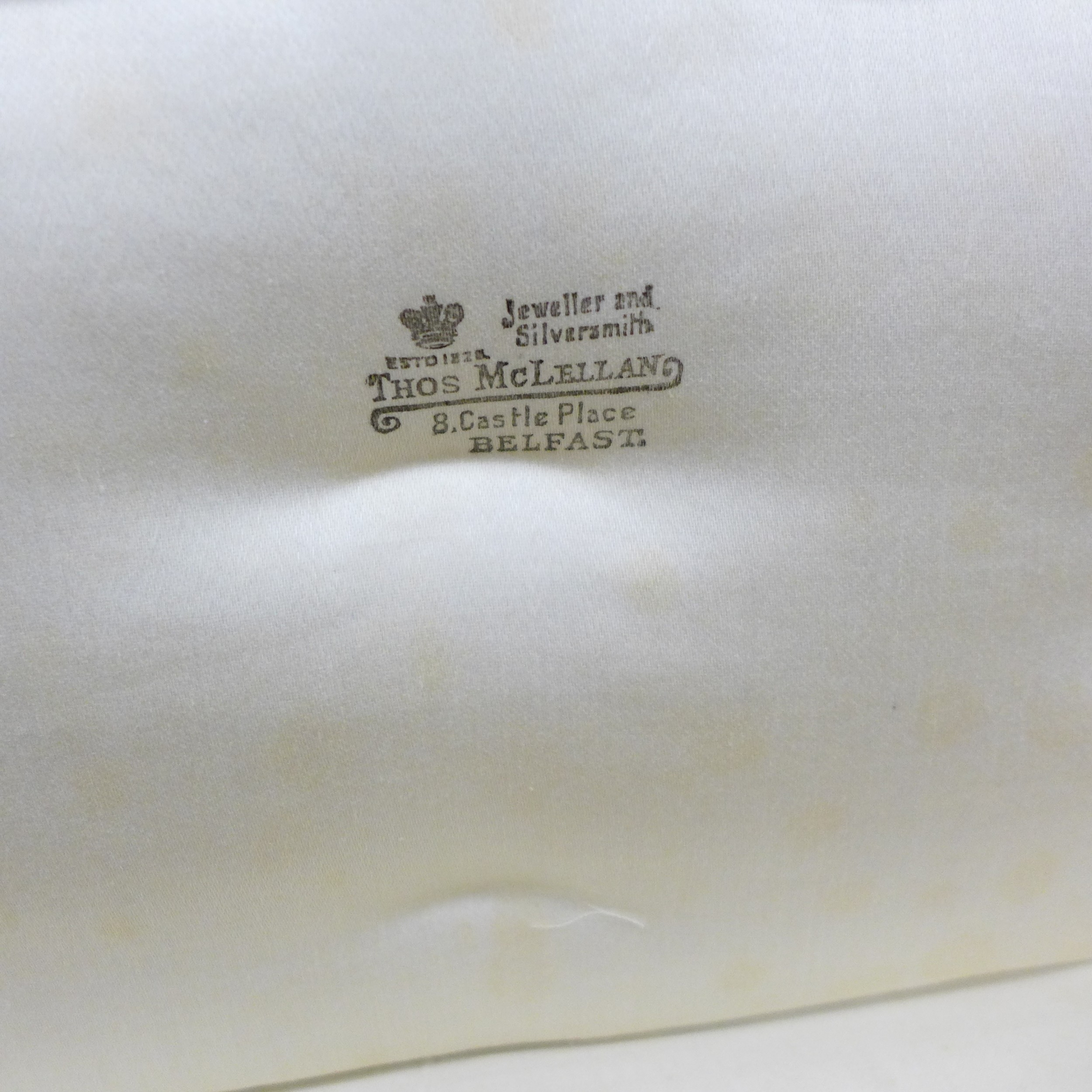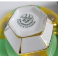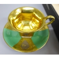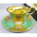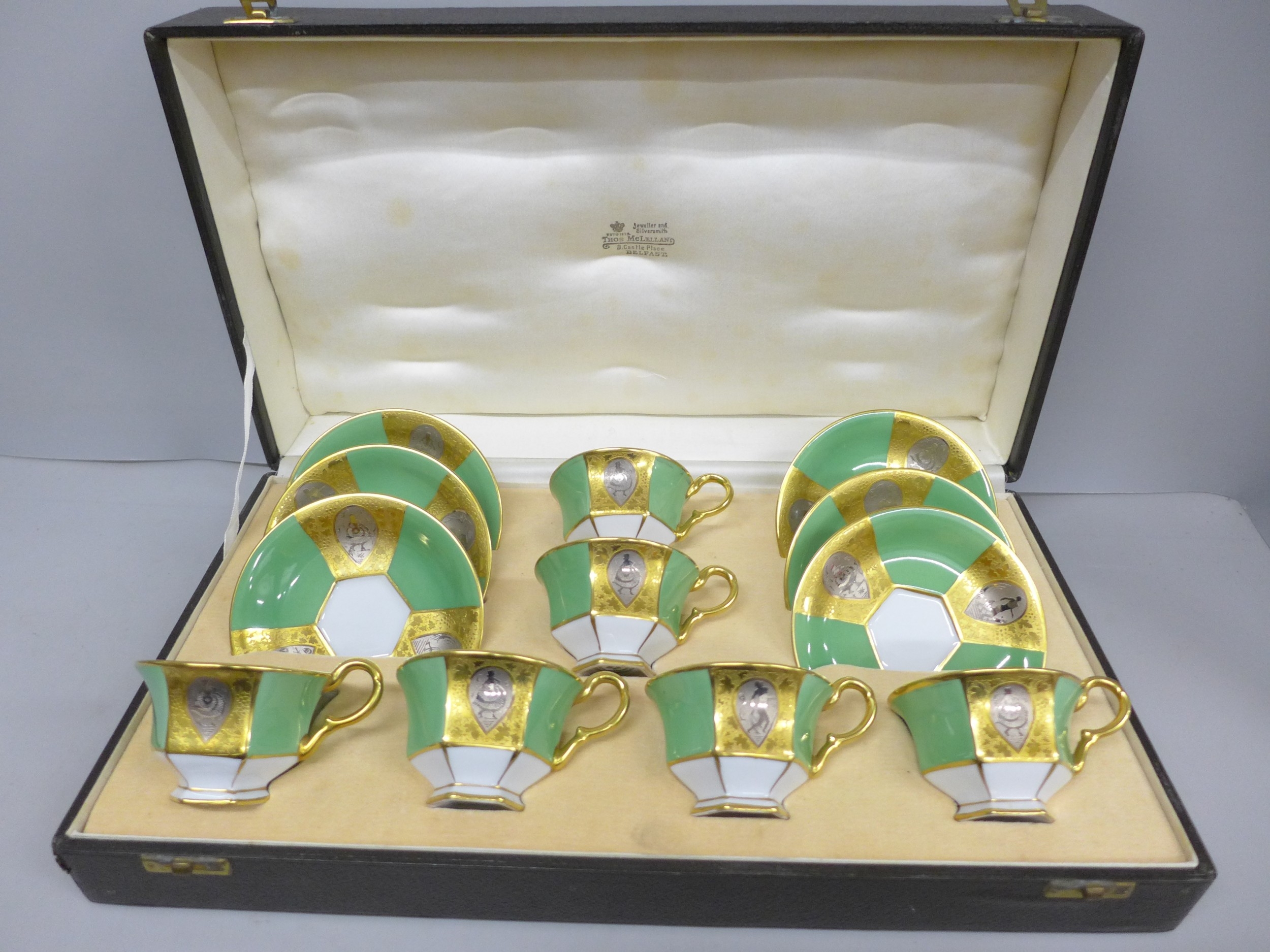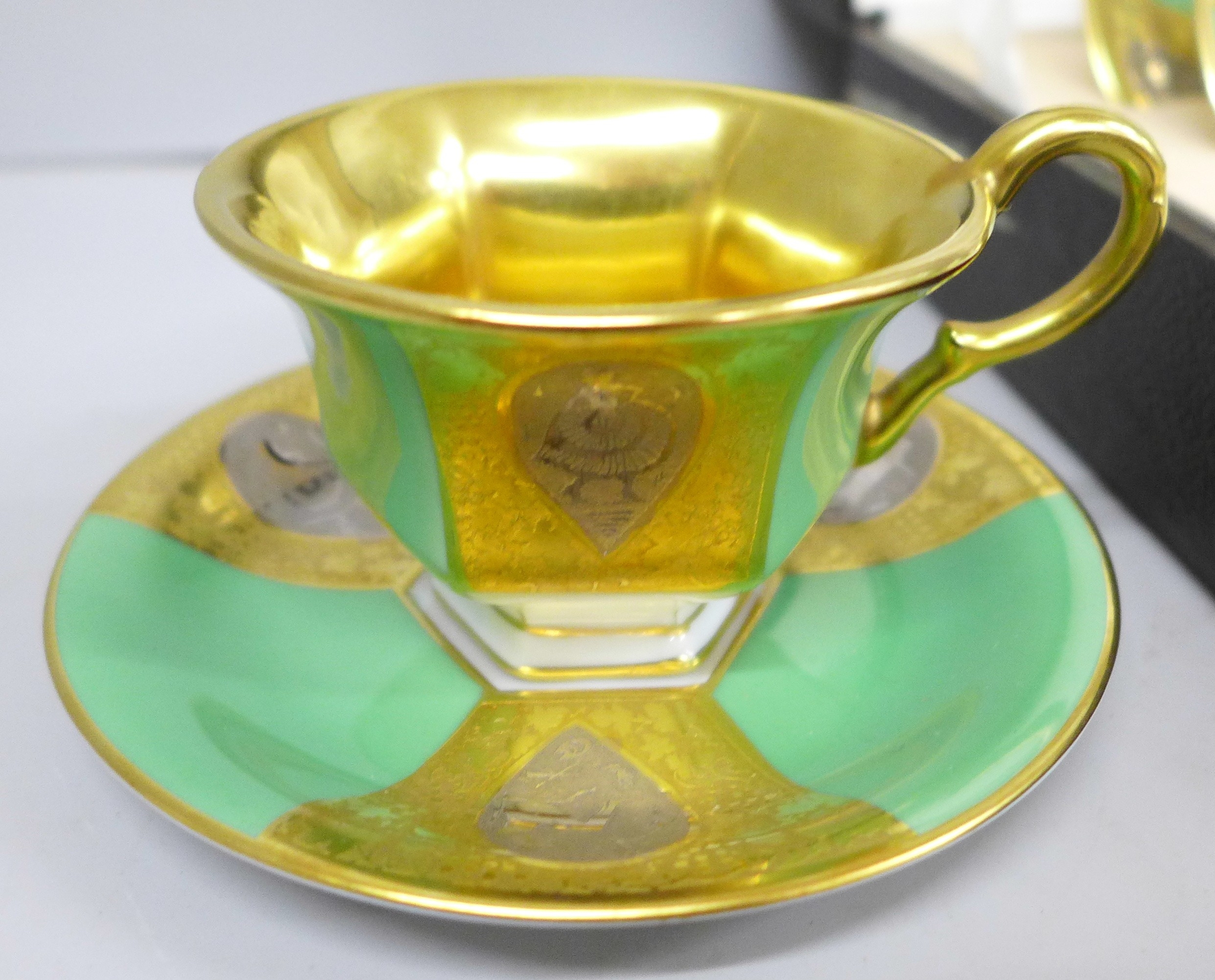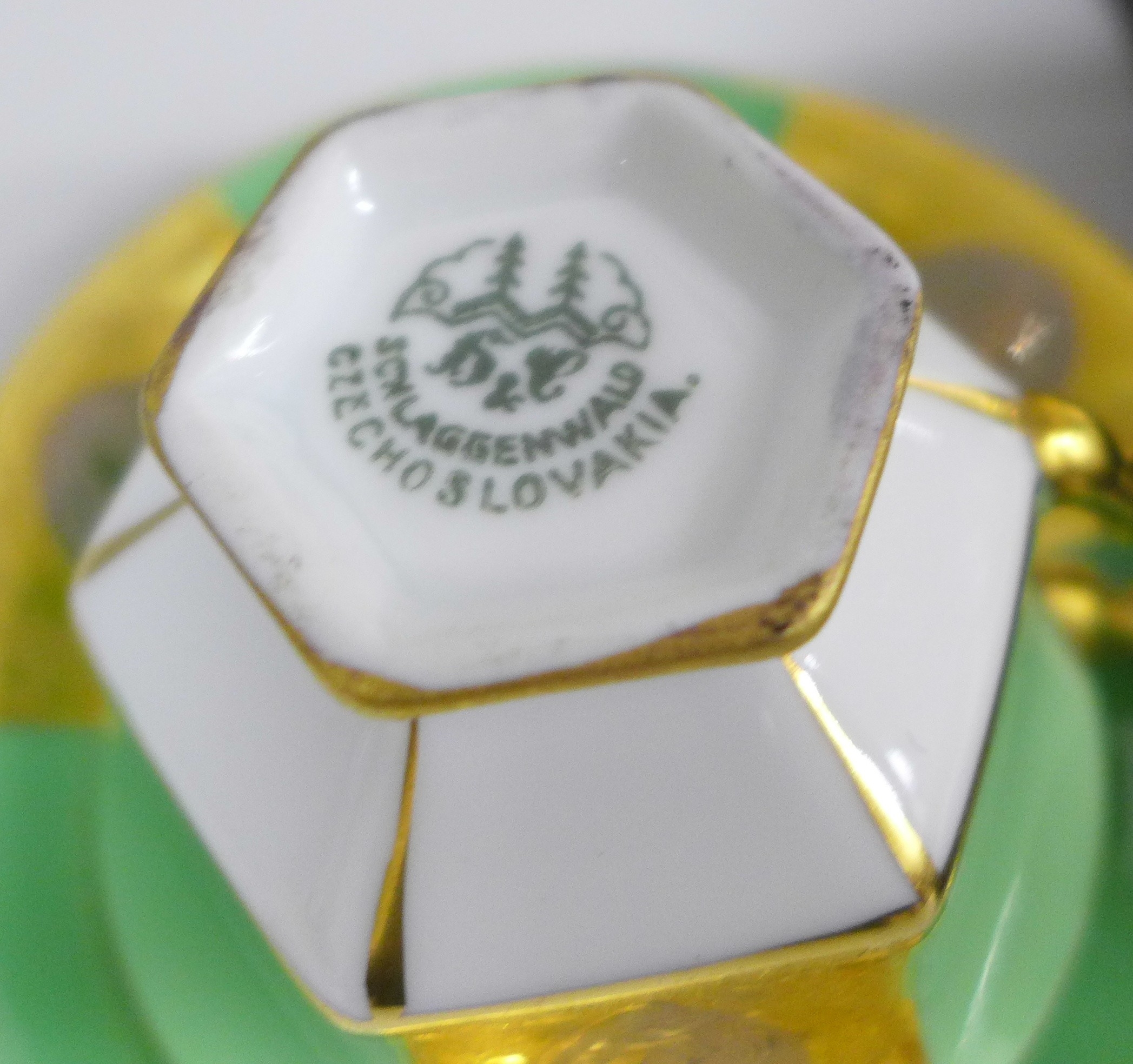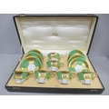 A Czechoslovakian Schlaggenwald six piece coffee set in green with gilt detail, case marked Thomas McLennan, Belfast