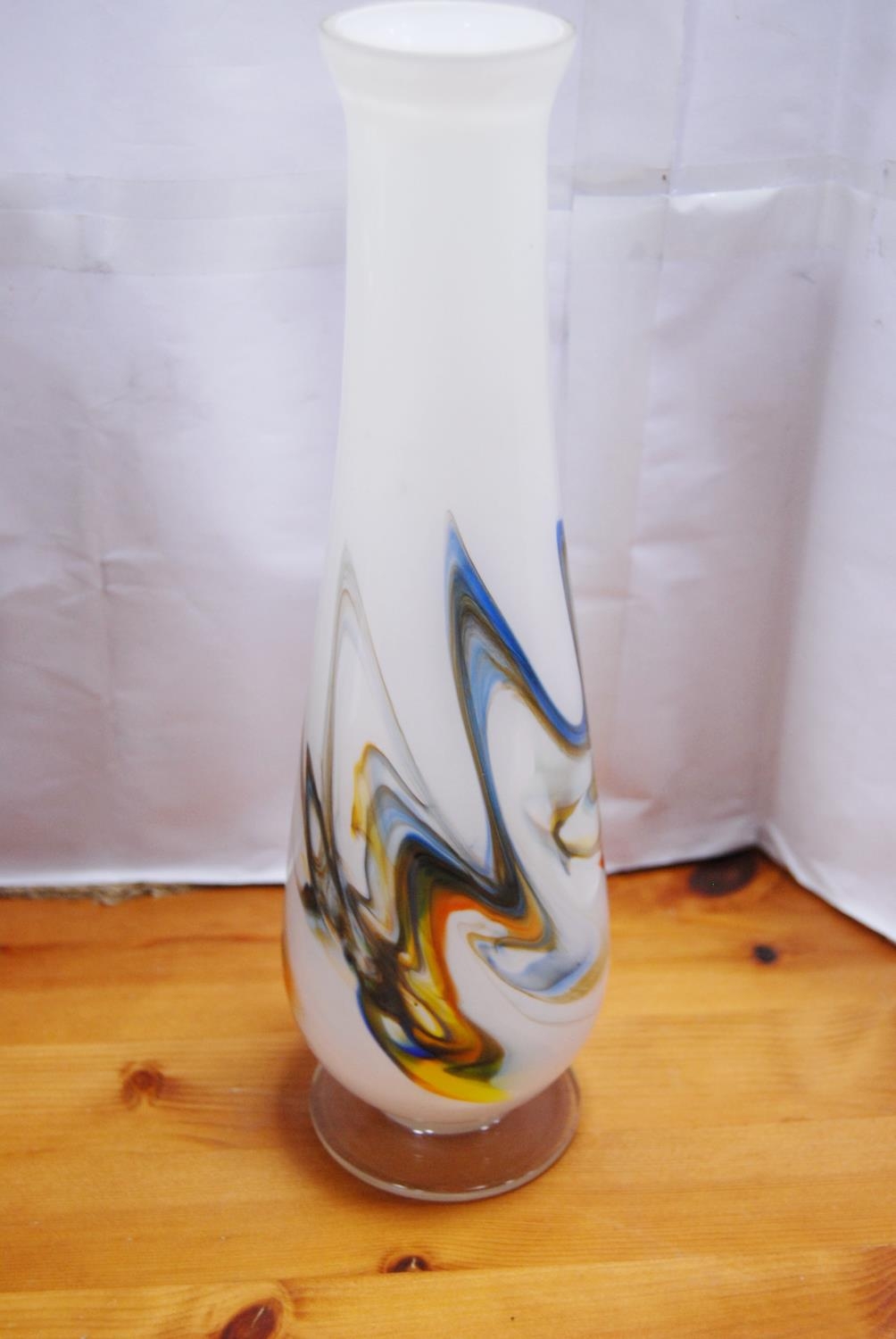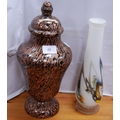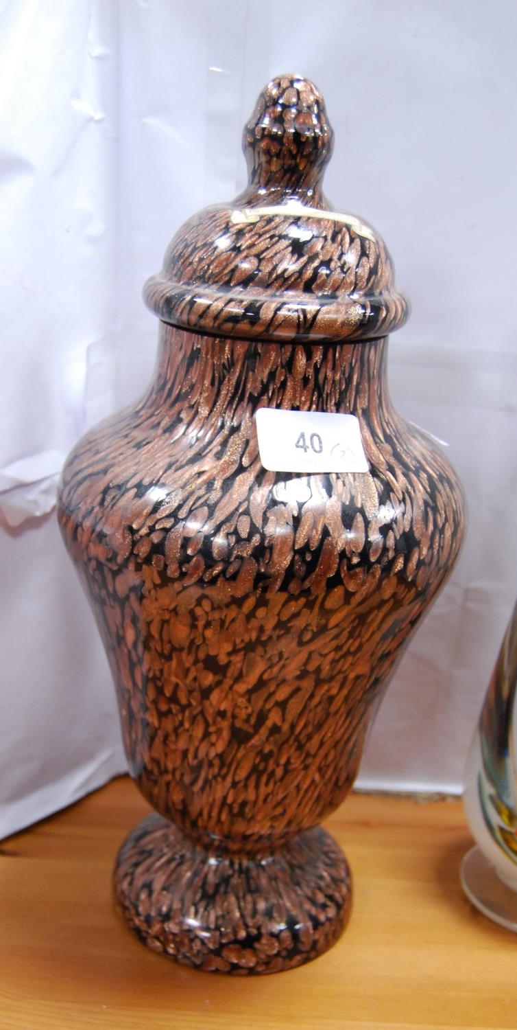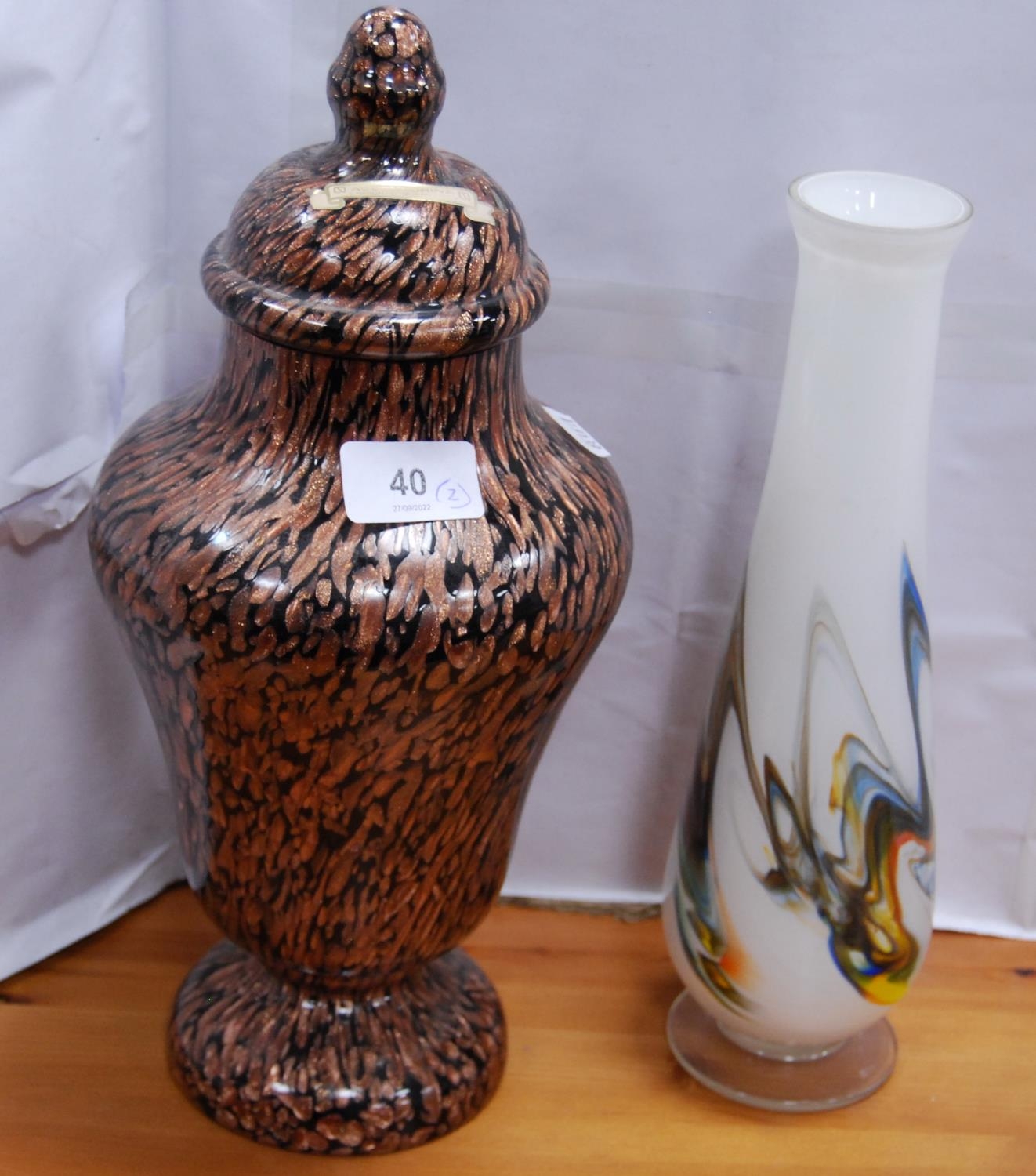 Murano mottled glass baluster-shaped vase and cover, and an opaque white art glass vase. (2)