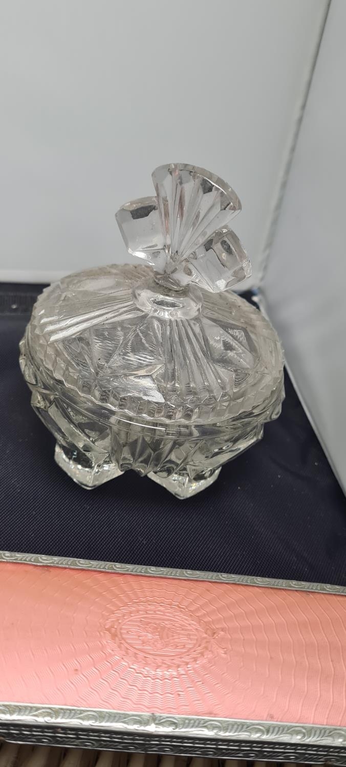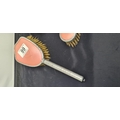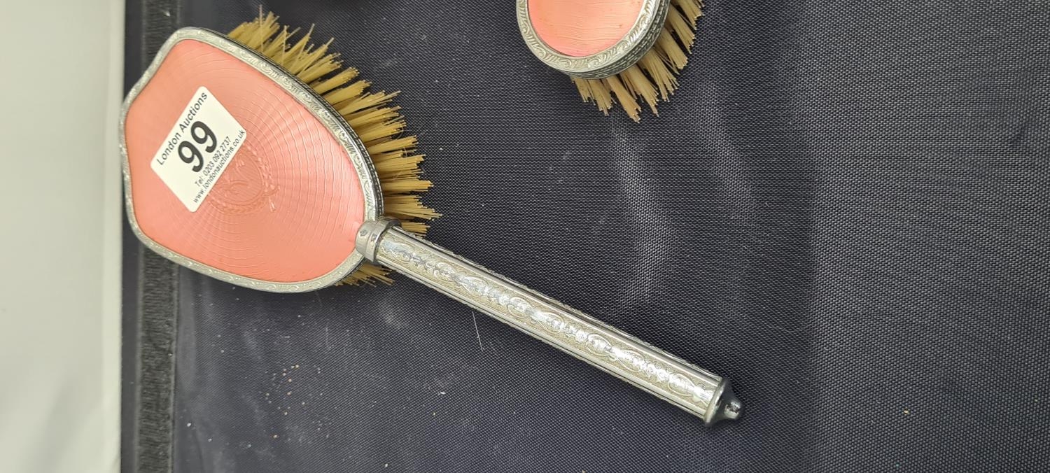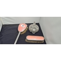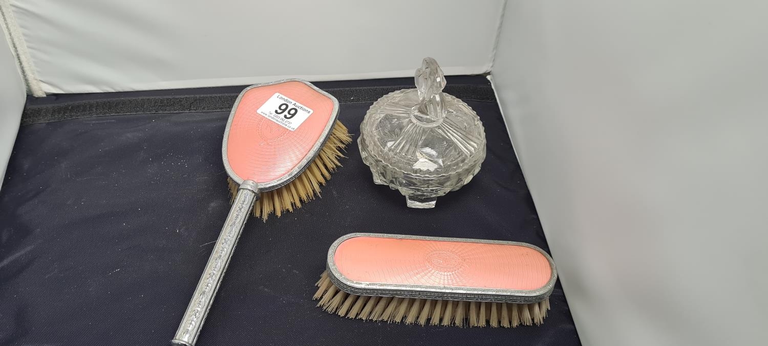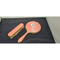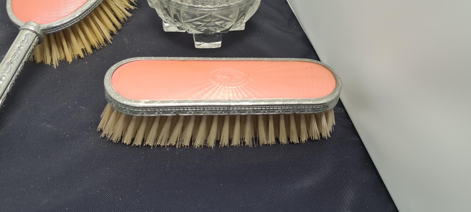 Vintage 1950s Pink Guilloche Enamel Hand Mirror and Brush Set with a Crystal Trinket Pot