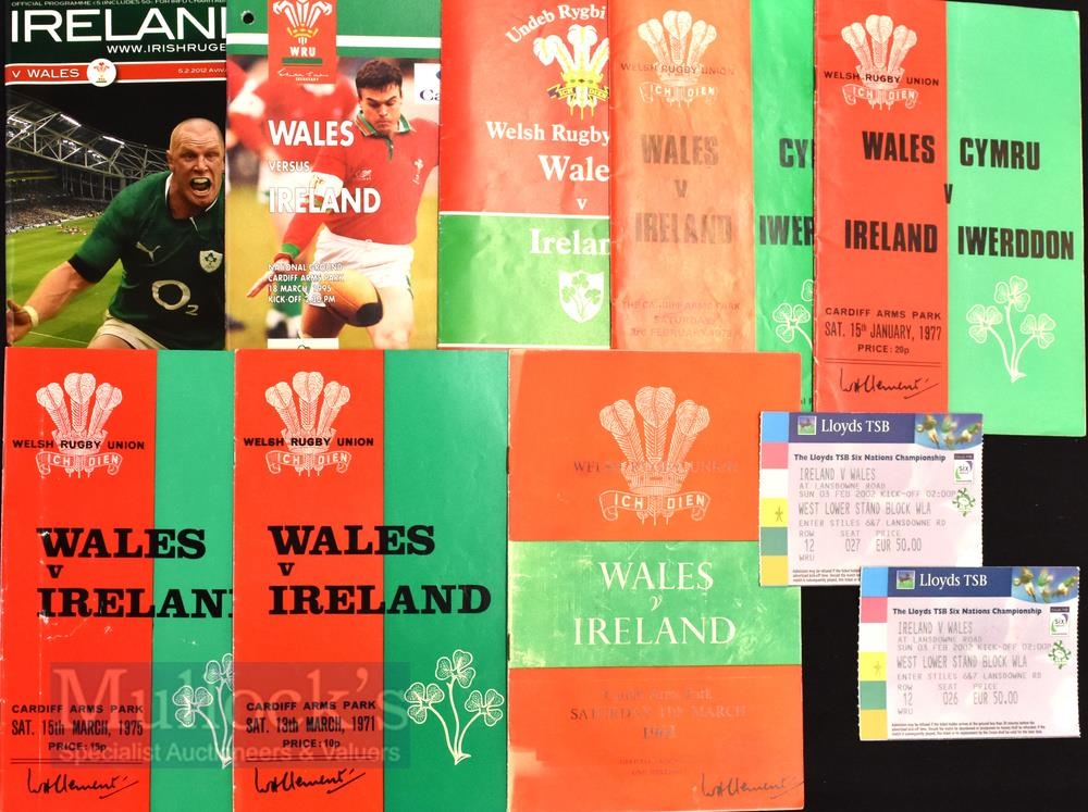 Wales v Ireland Doublers Rugby Programmes etc (10): Two tickets (for 2002) and spare copies of those listed in earlier lots, the issues at home v Ireland 1961, 1971 (G Slam), 1975, 1977, 1979, 1983 & 1995, and away 2012. VG