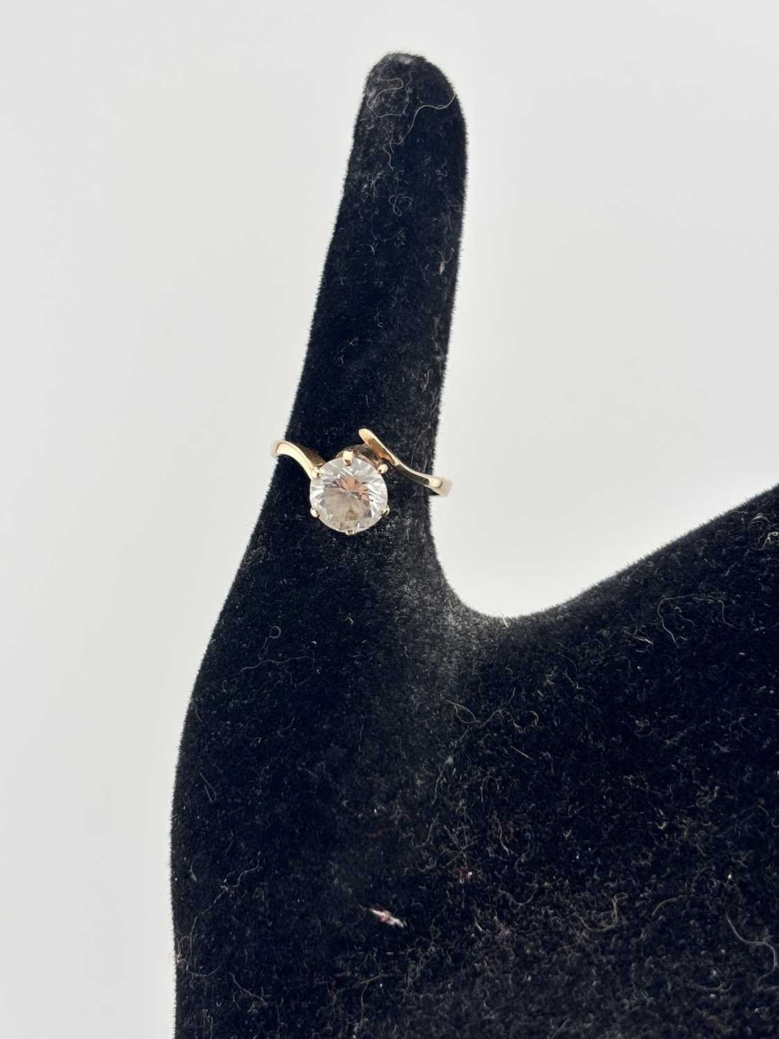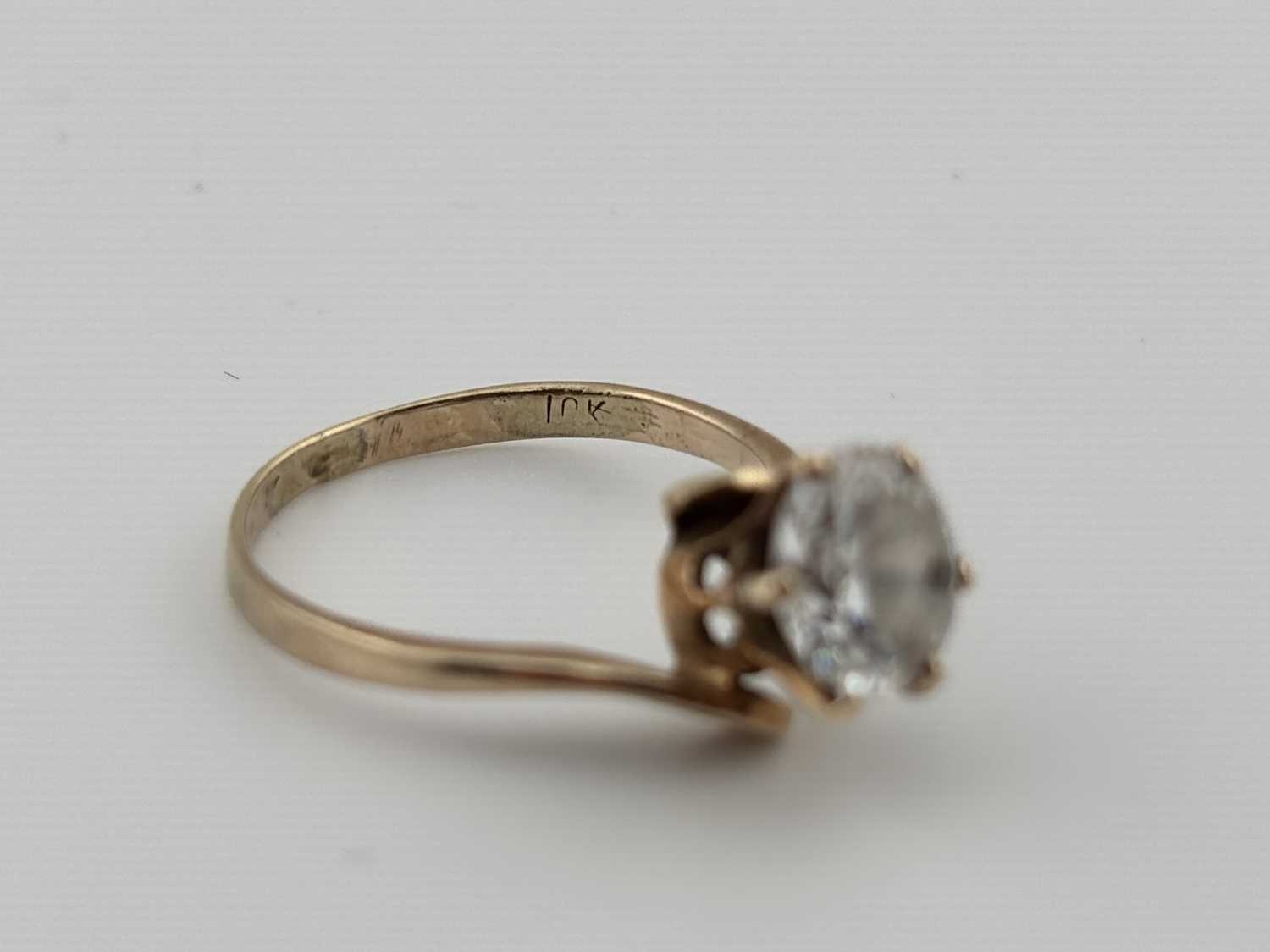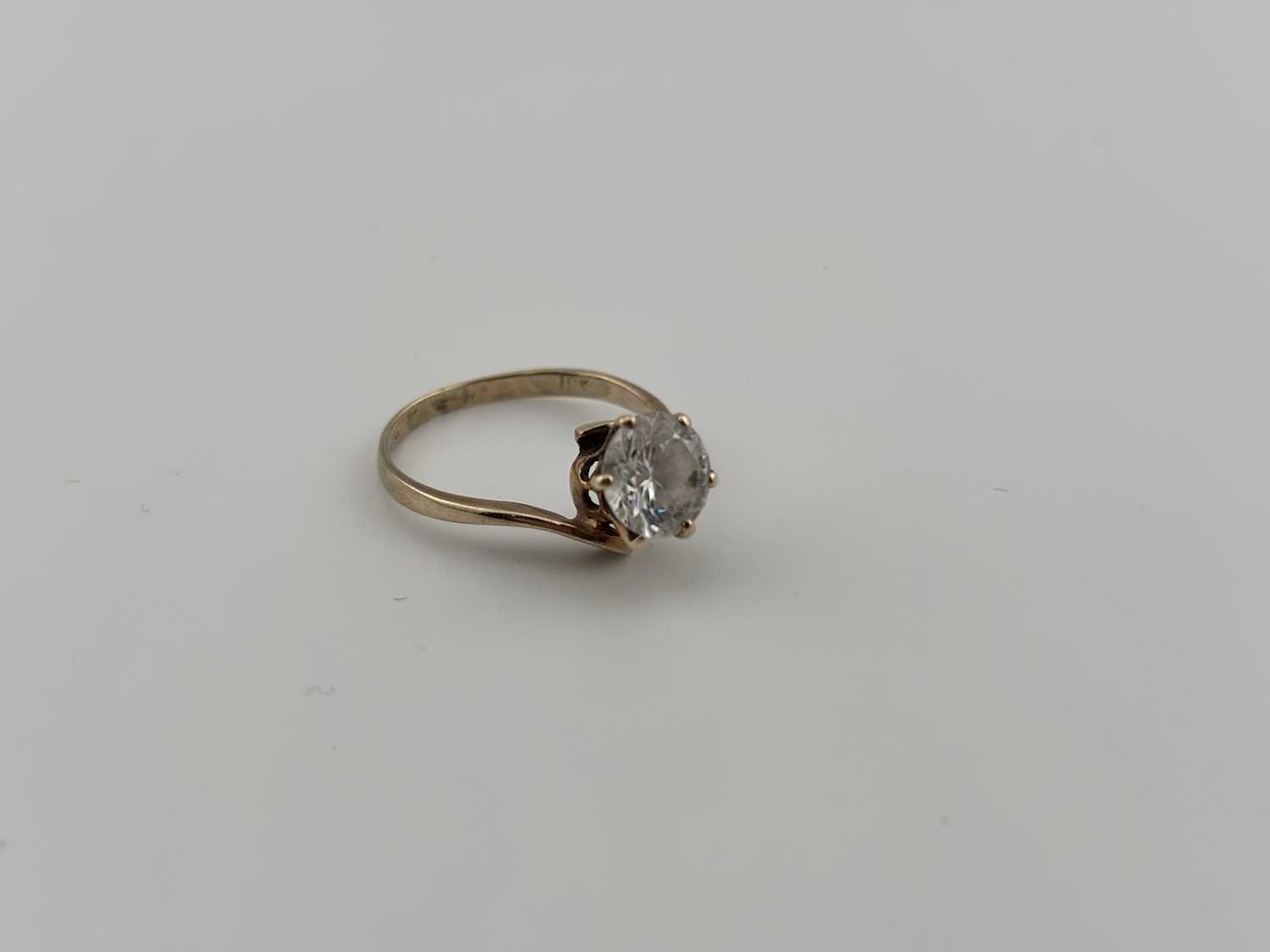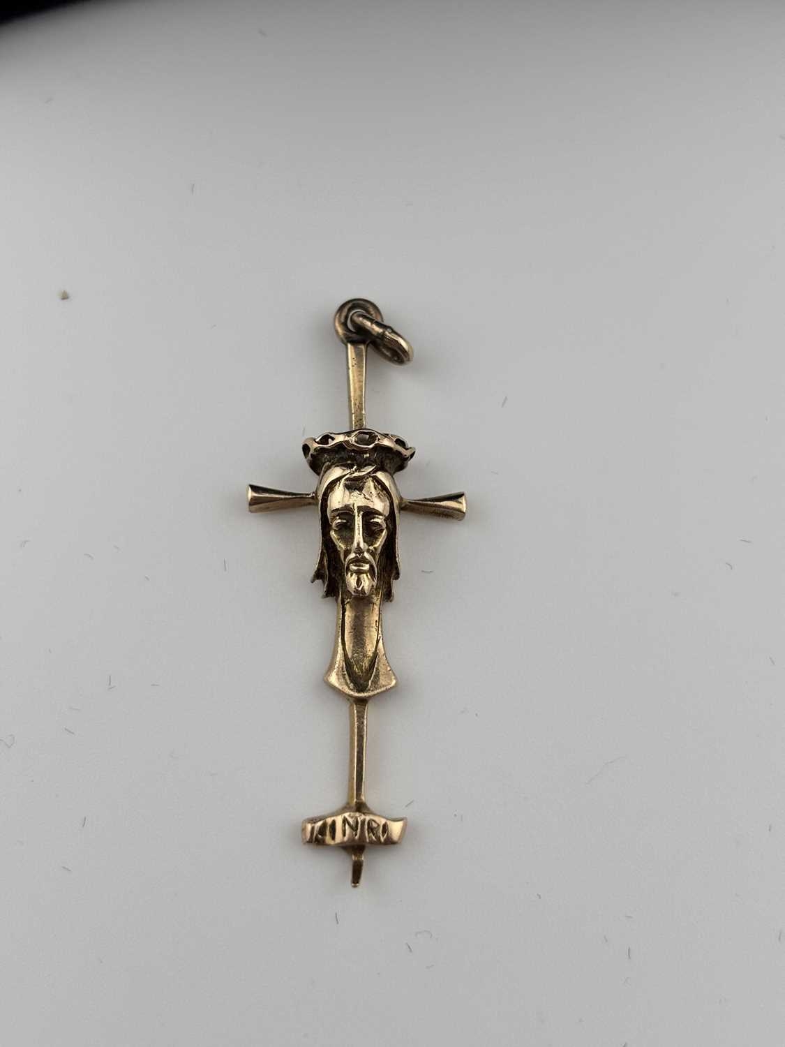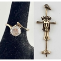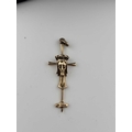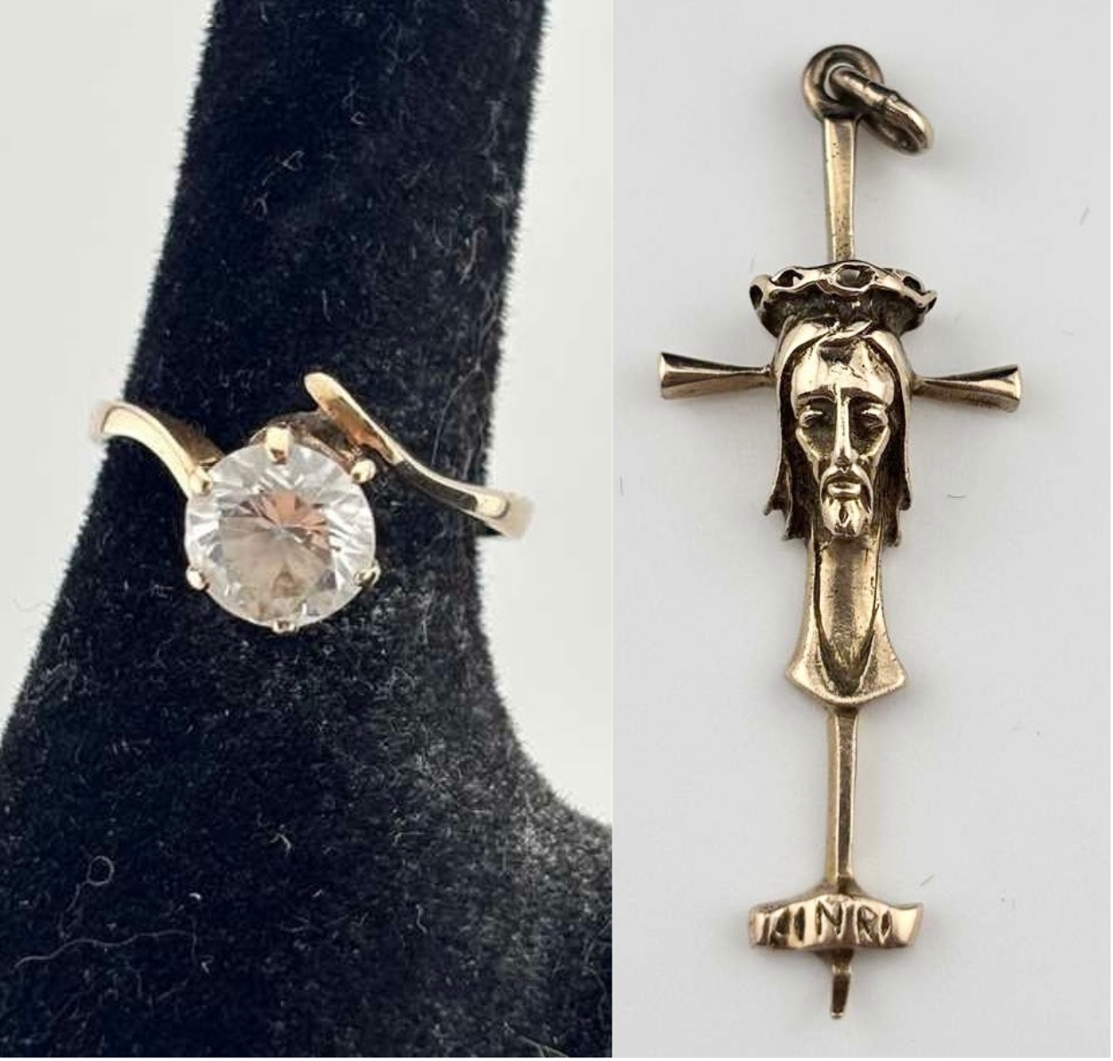 A crucifix cross pendant and a cubic zirconia single-stone ring, pendant stamped 14K, ring stamped 10K, length of pendant 5cm, ring size M, total weight 7.6g.