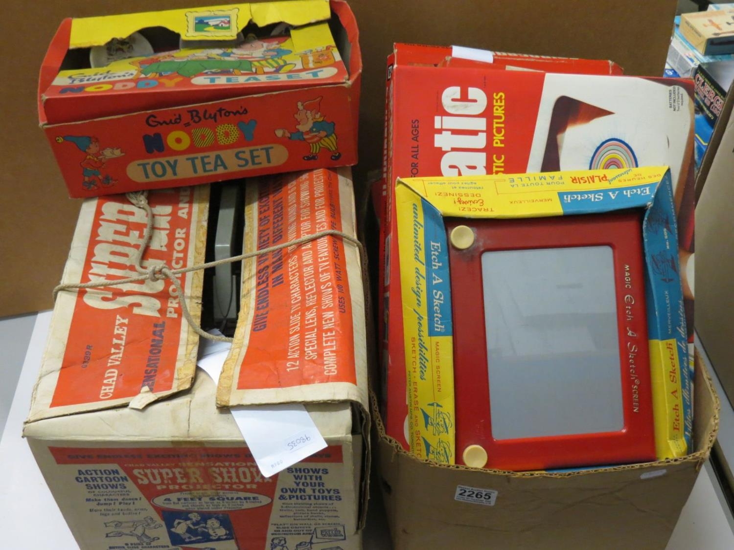Group of vintage toys and games to include boxed Denys Fisher Spiro-Matic, boxed Enid Blyton Noddy Teaset, boxed Chad Valley Super Show Projector, original boxed Etch a Sketch etc