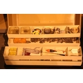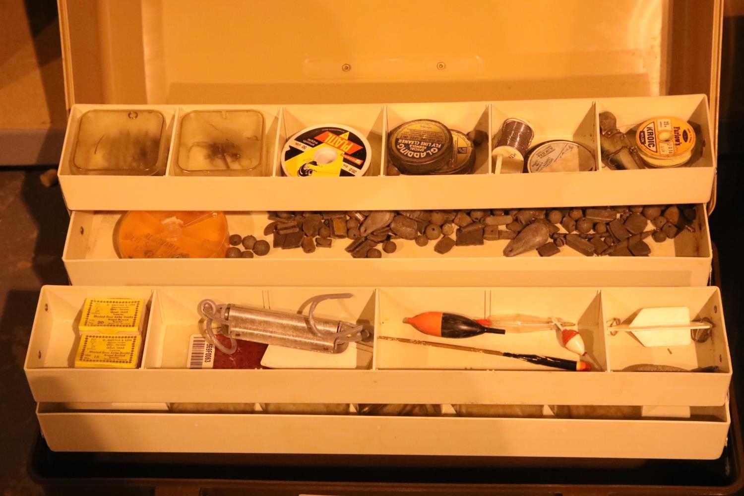 Plastic cantilever toolbox of fishing items including hooks, weights etc. Not available for in-house P&P