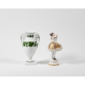 A Meissen porcelain two-handled vase, 20th century, blue crossed swords, of baluster form with scrolling handles, painted in green with bands of leaves to the neck, body, and socle base, with further green highlights, 21.8cm high, together with a Volkstedt porcelain crinoline figure of a ballerina, blue underglaze mark, with richly gilt and floral painted dress, 20.5cm high (A/F) (2)