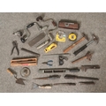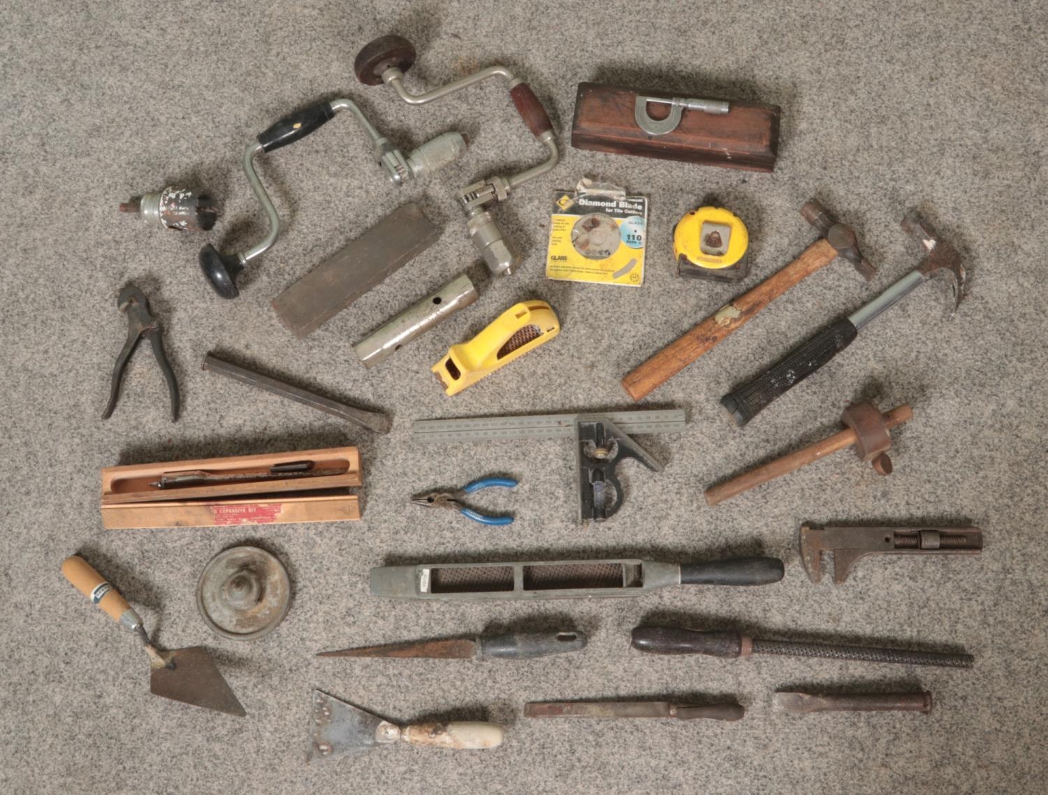 A box of assorted tools, to include Brown & Sharpe micrometer, chisels, hammers, files and hand drills.