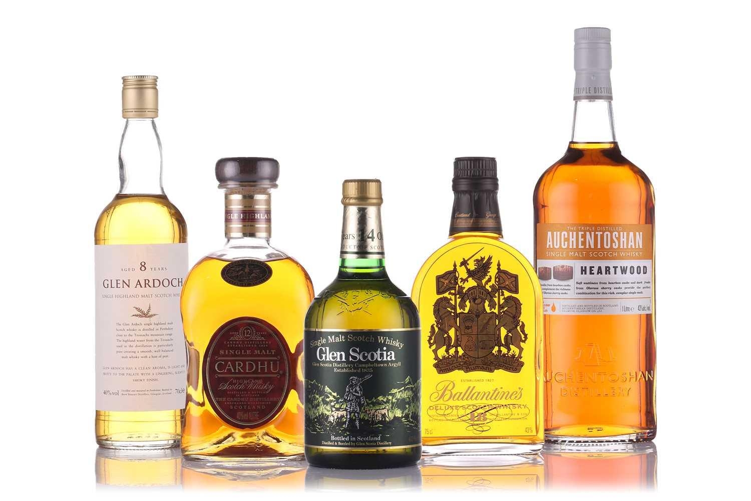 A litre bottle of Auchentoshan Heartwood Single Malt Scotch Whisky, 43 % Vol, together with a litre bottle of Cardhu Single Malt Scotch Whisky, 12 Years, 40% Vol, a bottle of Glen Scotia Single Malt Scotch Whisky, 14 Years, 70 cl, 40% Vol, a bottle of Glen Ardoch Single Malt Scotch Whisky, 8 Years, 70 cl, 40% Vol and a Ballantine's Deluxe Scotch Whisky, 18 Years, 75 cl, 43% Vol.