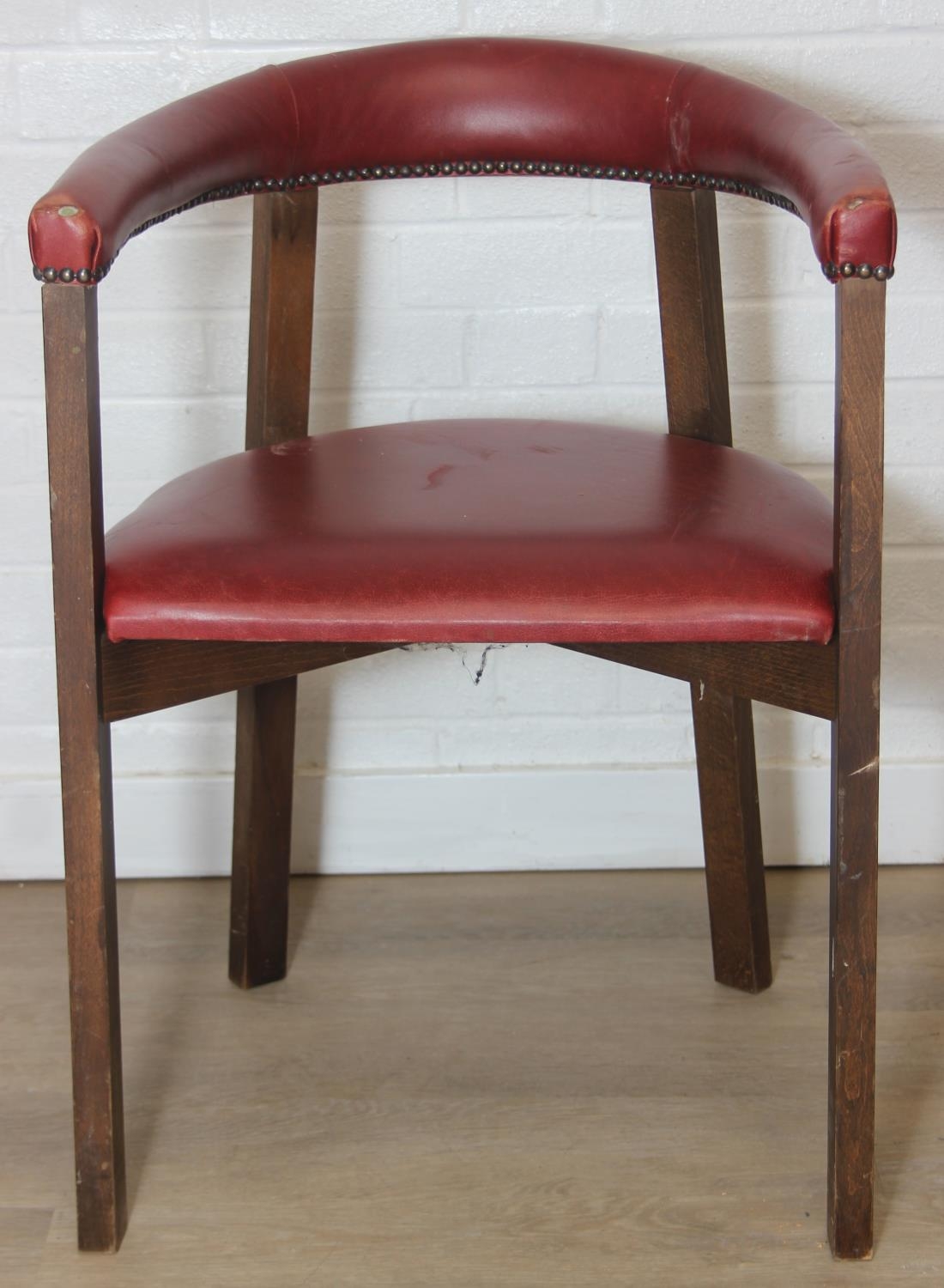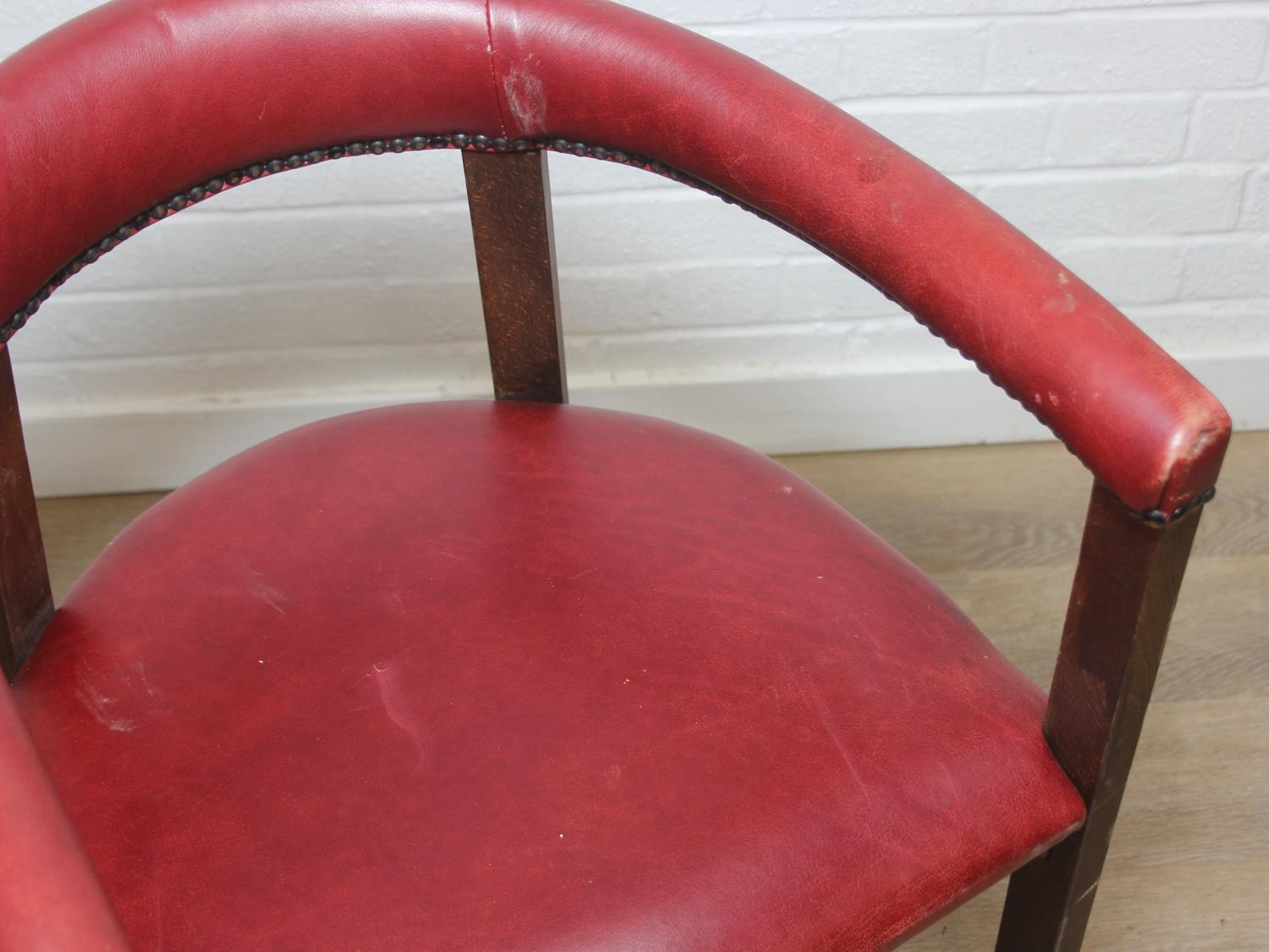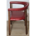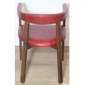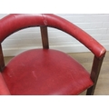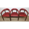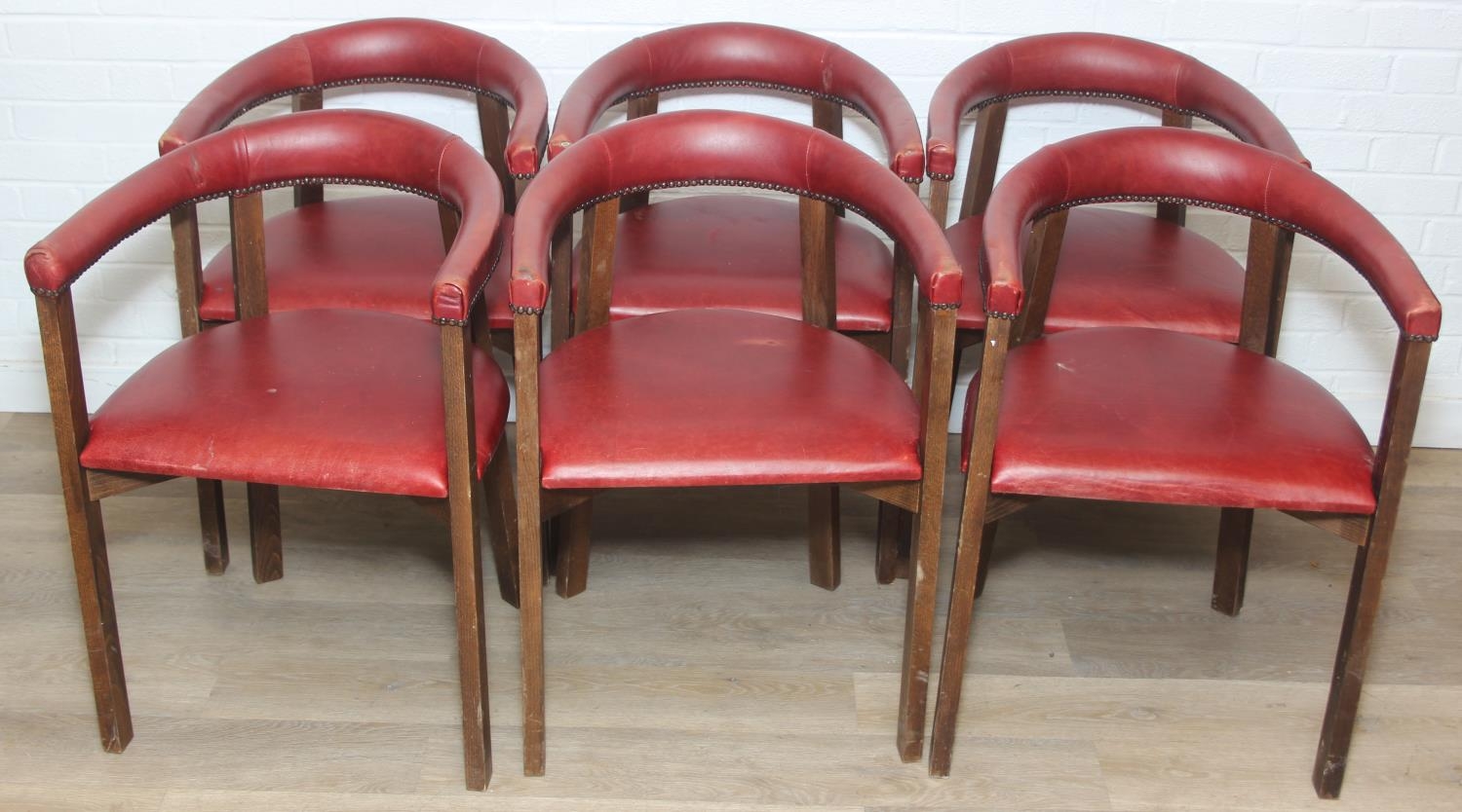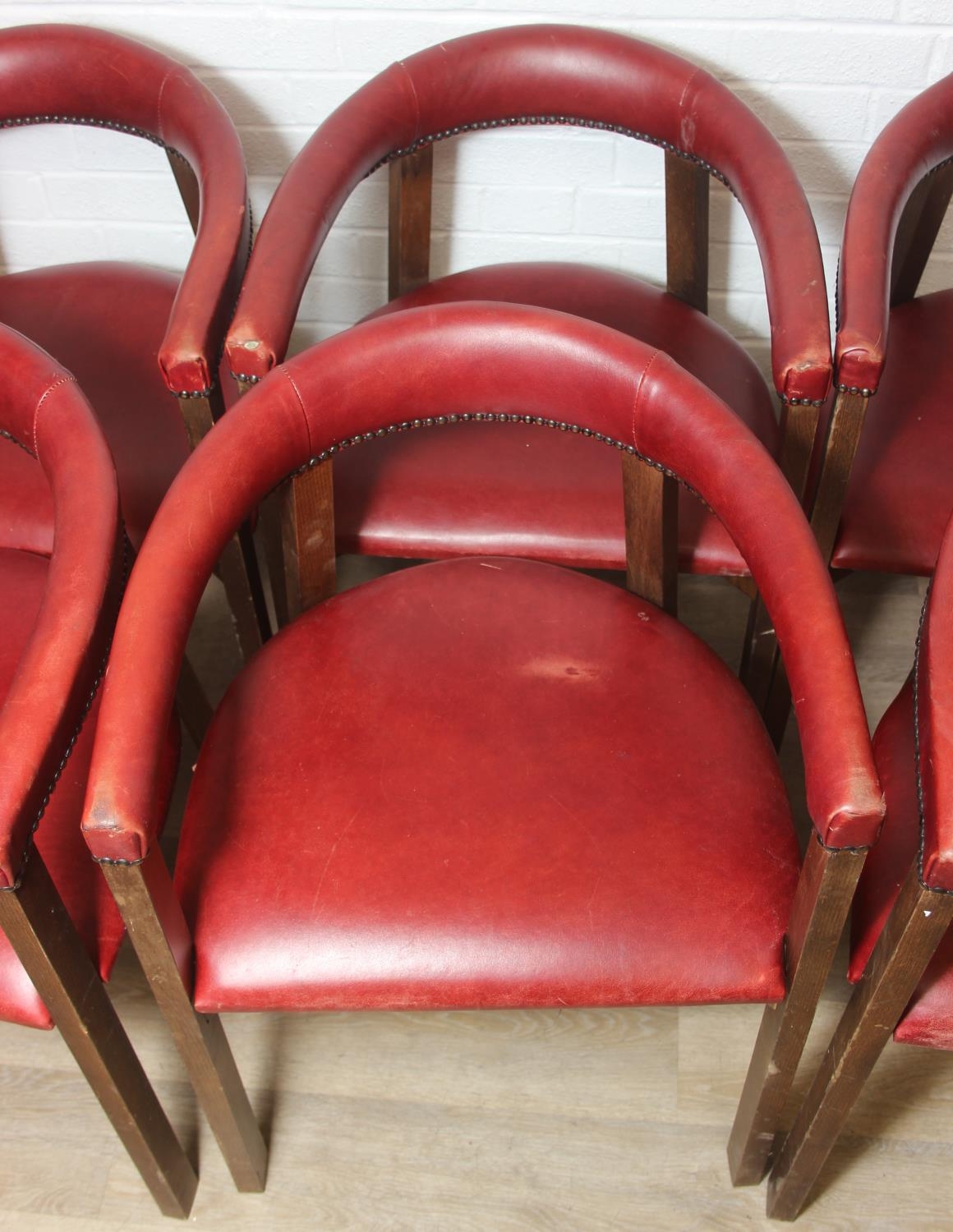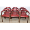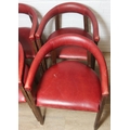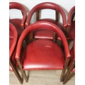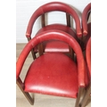 A set of six vintage horseshoe chairs with wooden legs and red leather or leatherette upholstery, each 55cm wide x 77cm tall [6]