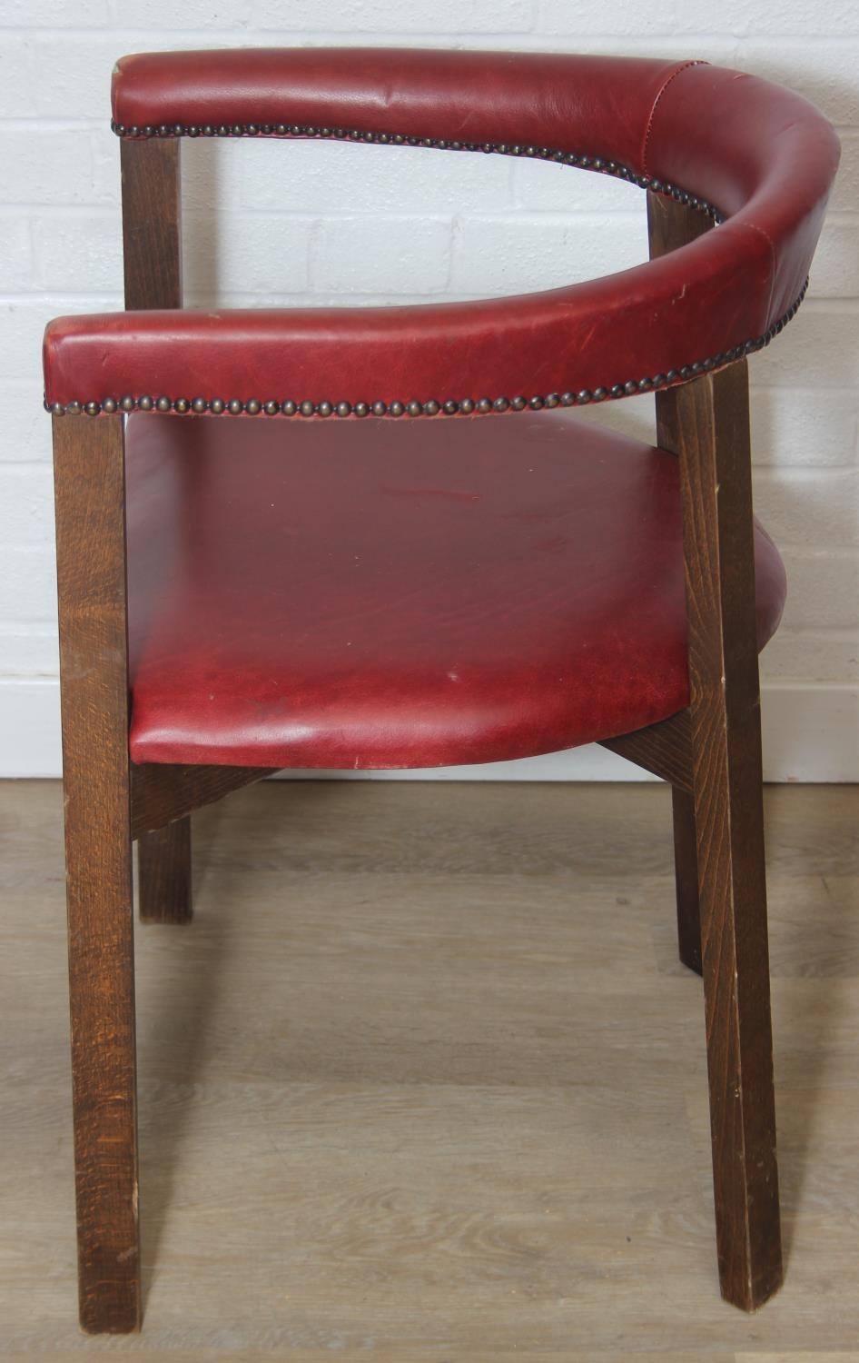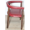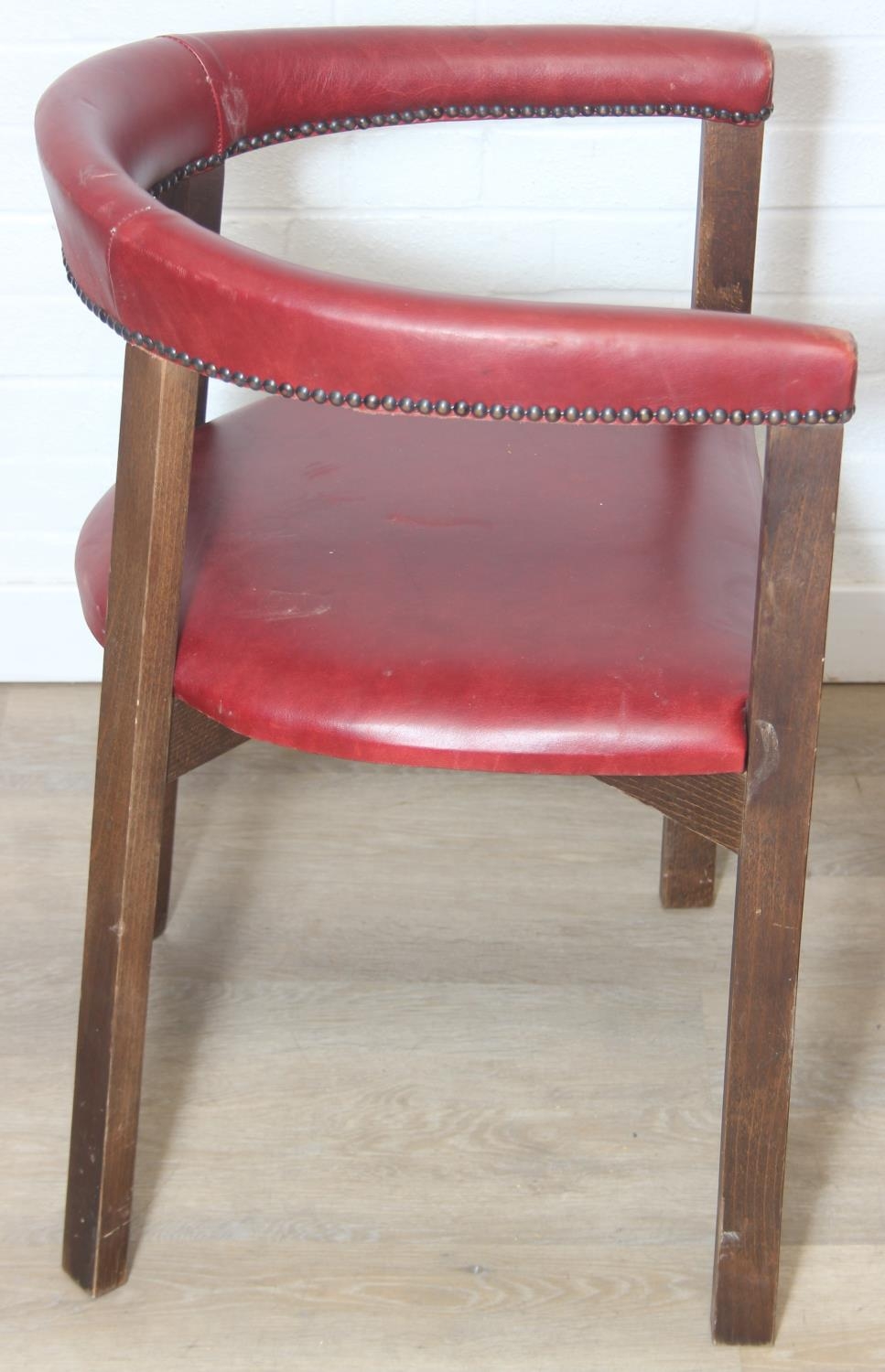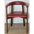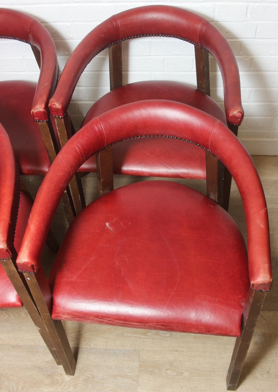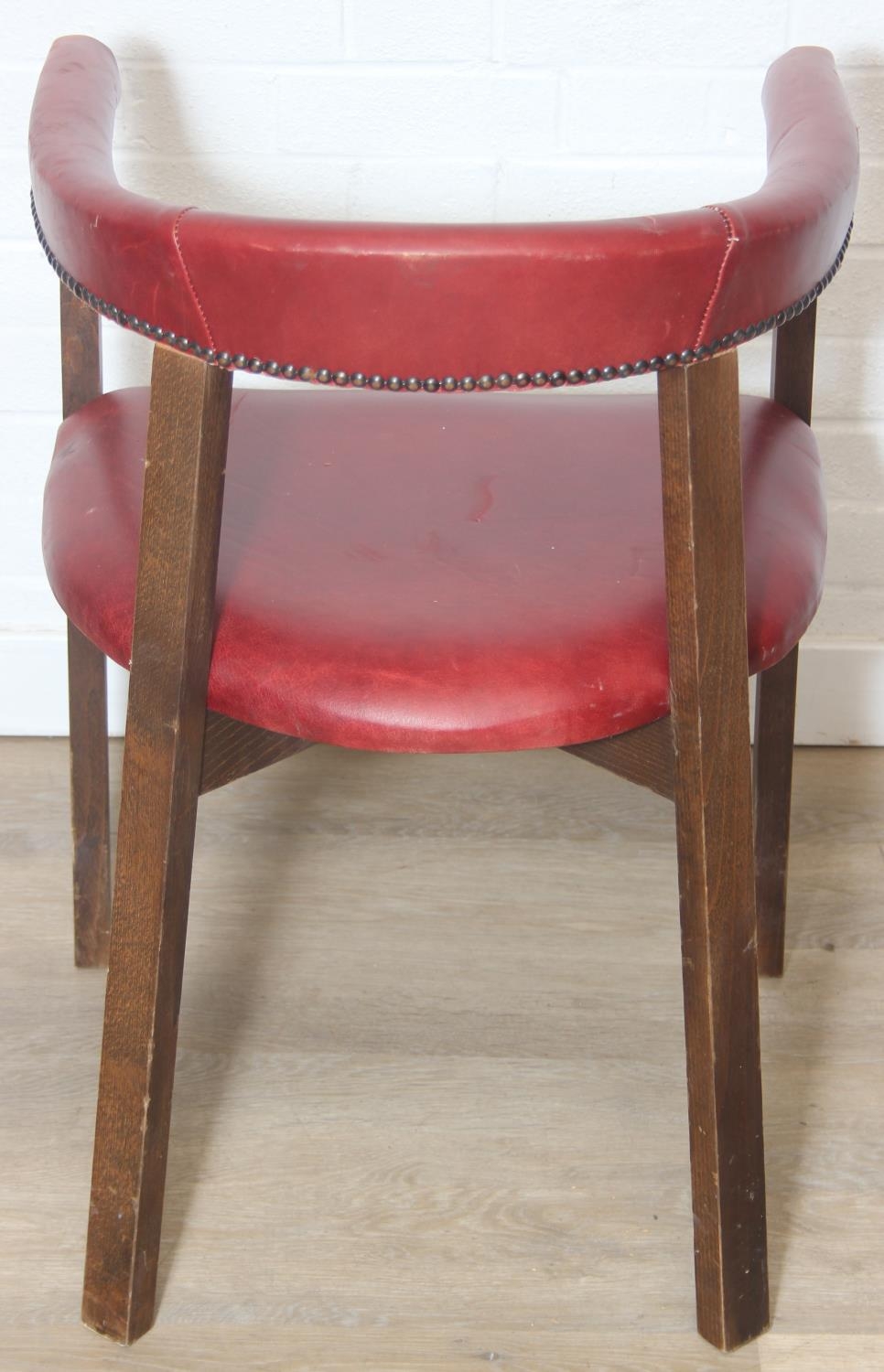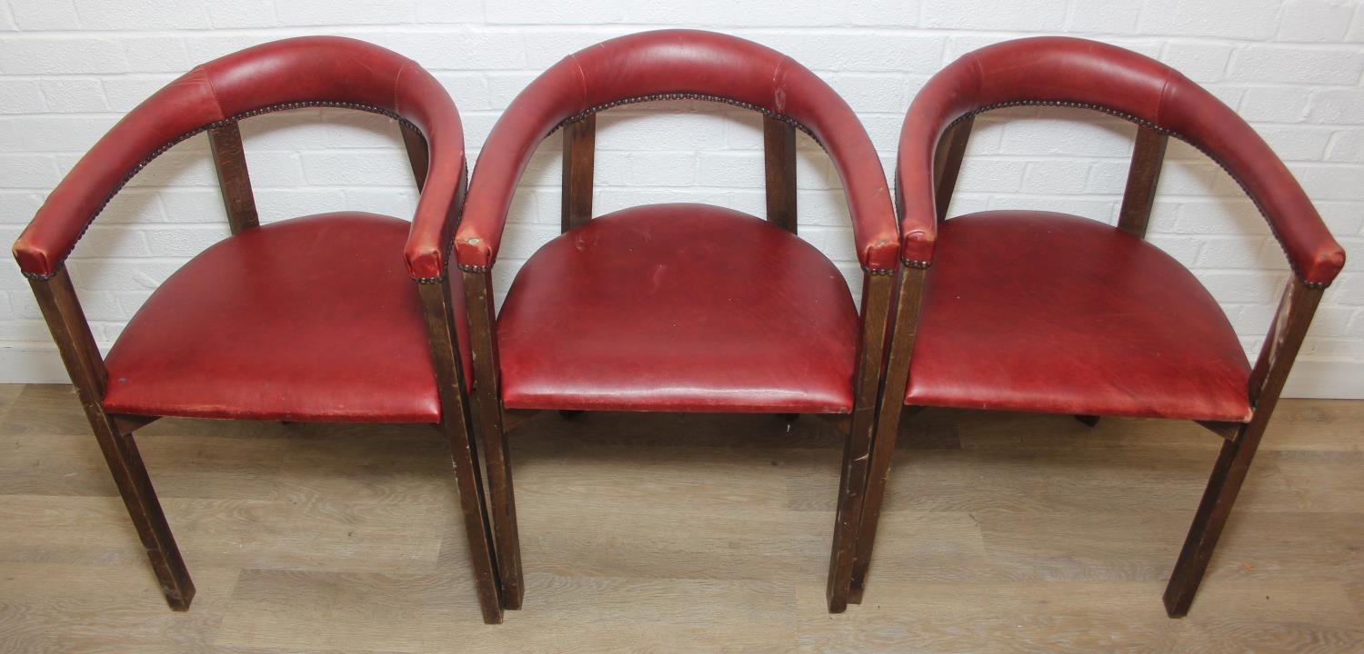 A set of six vintage horseshoe chairs with wooden legs and red leather or leatherette upholstery, each 55cm wide x 77cm tall [6]