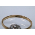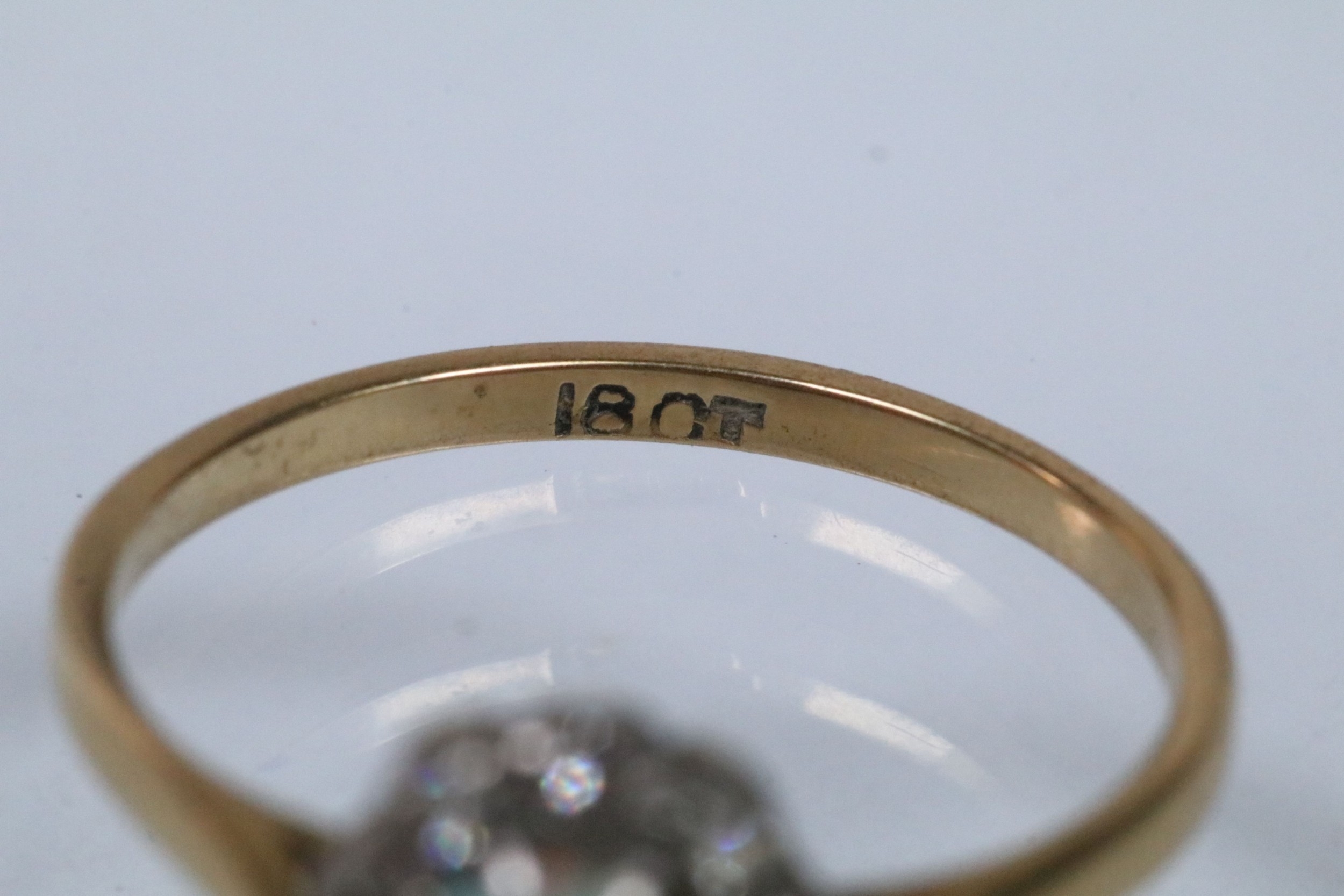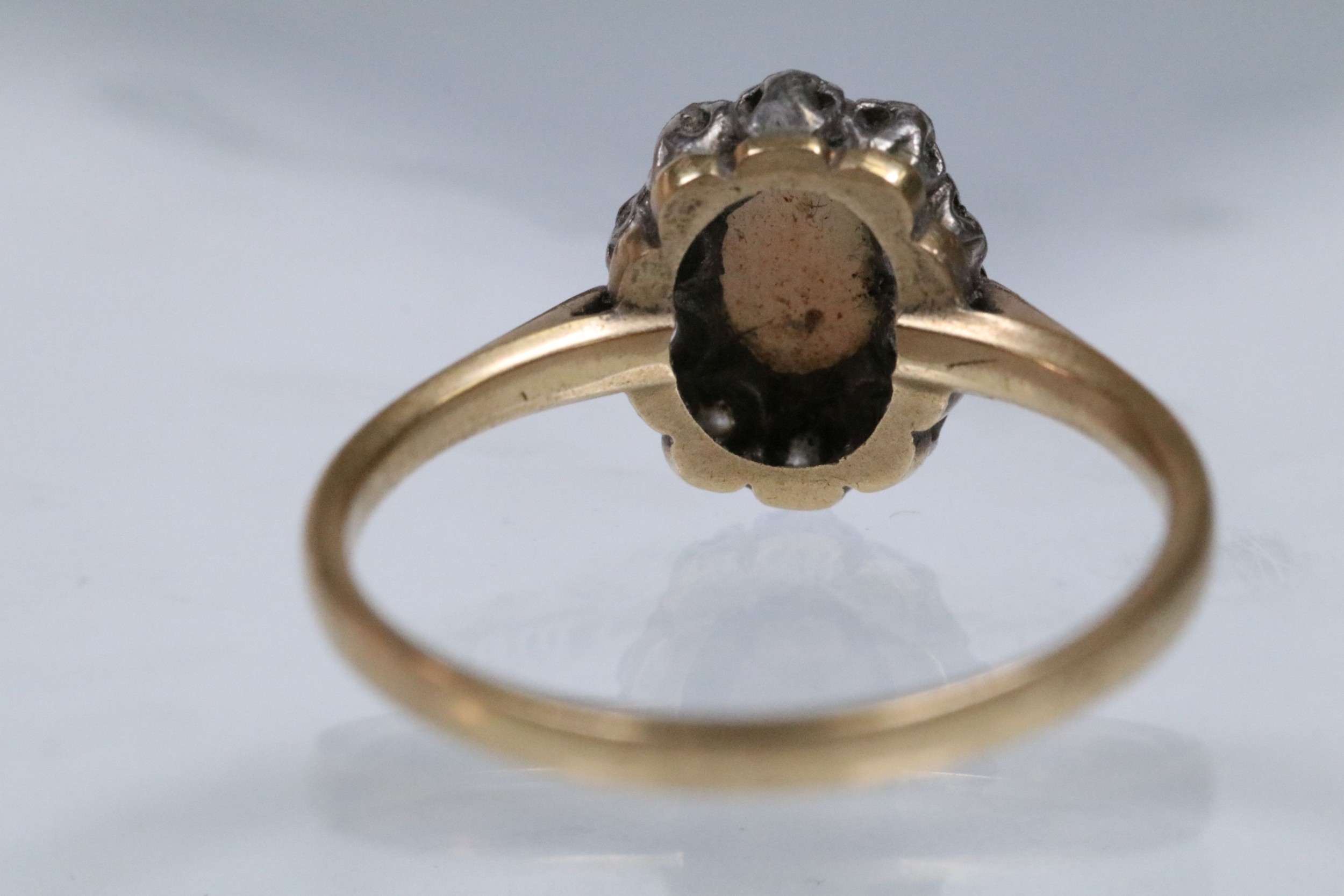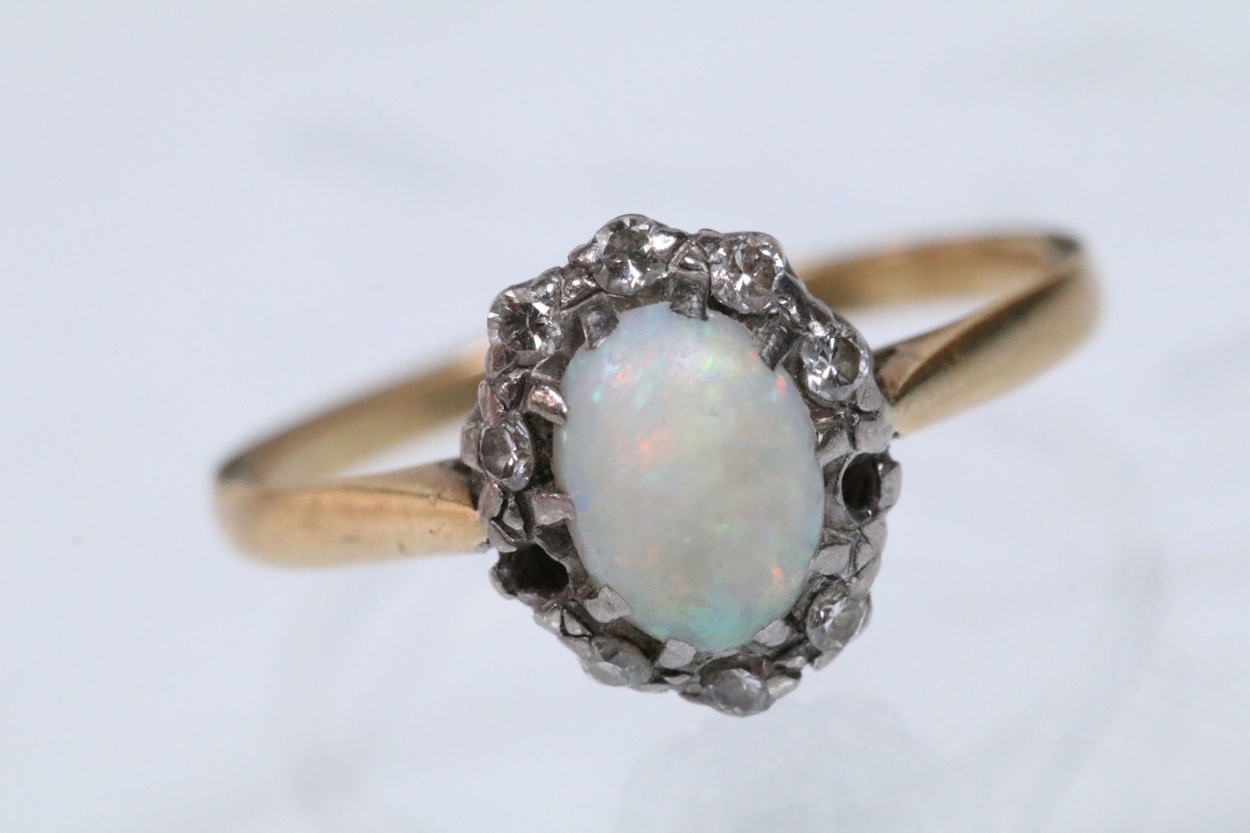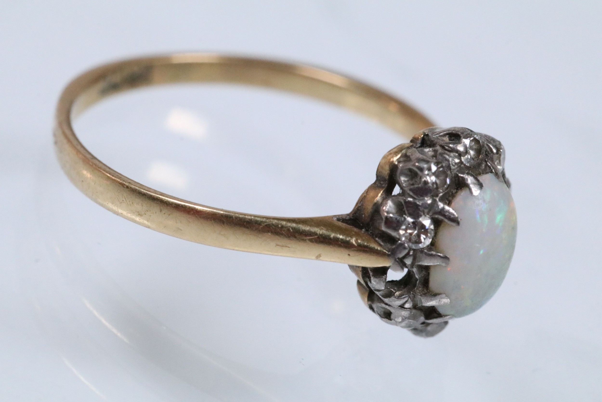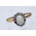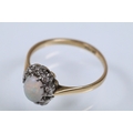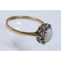 18ct opal and diamond halo ring having an opal cabochon to the centre with a halo of round cut diamonds. Ring marked 18ct. Size M.5. AF two stones missing.