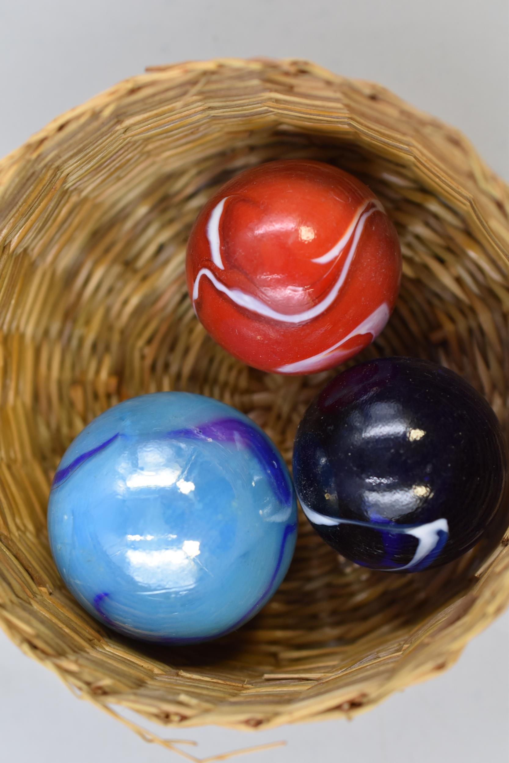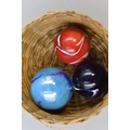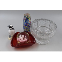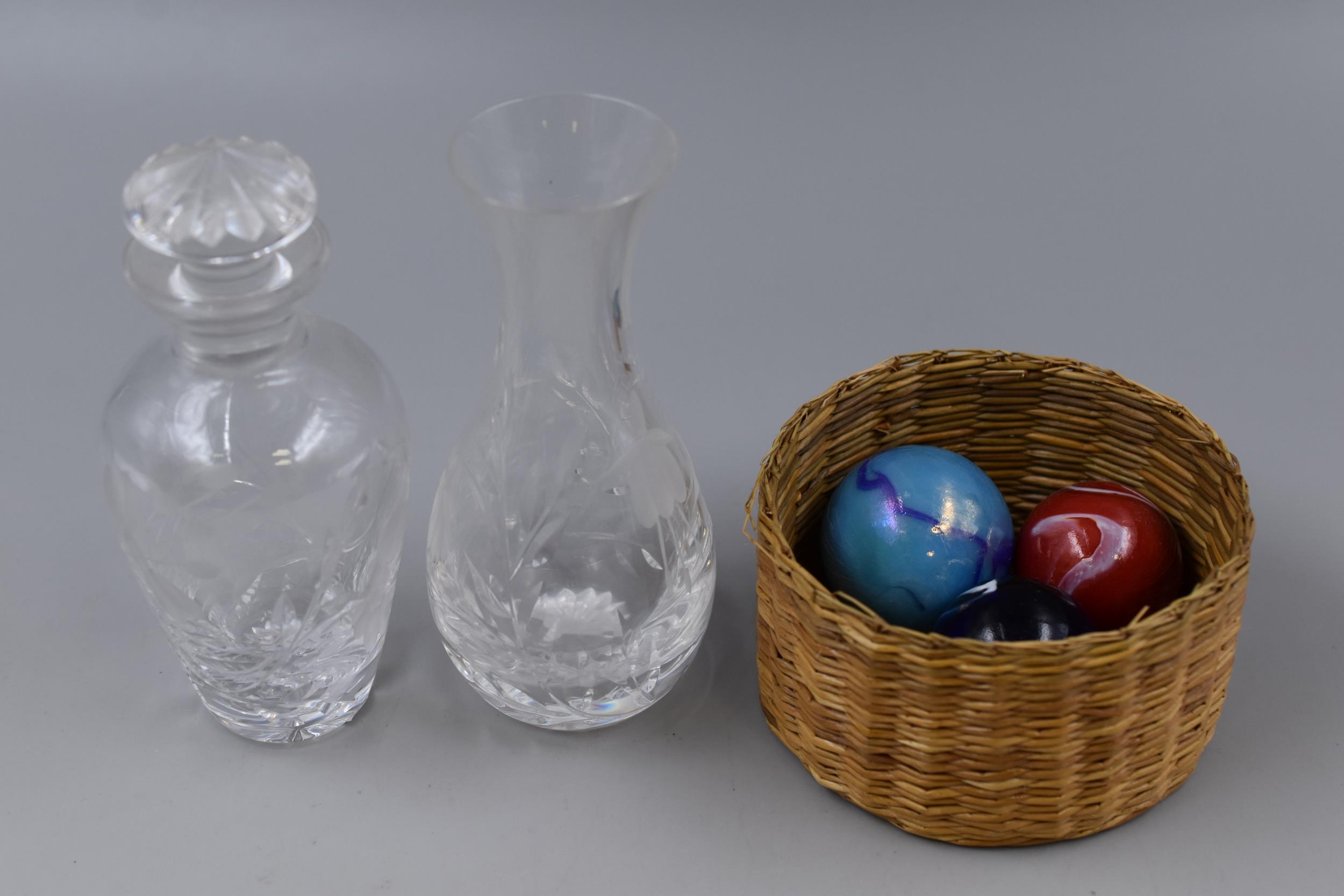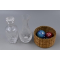 Three Bollies in a Basket and two small eteched Glass Items