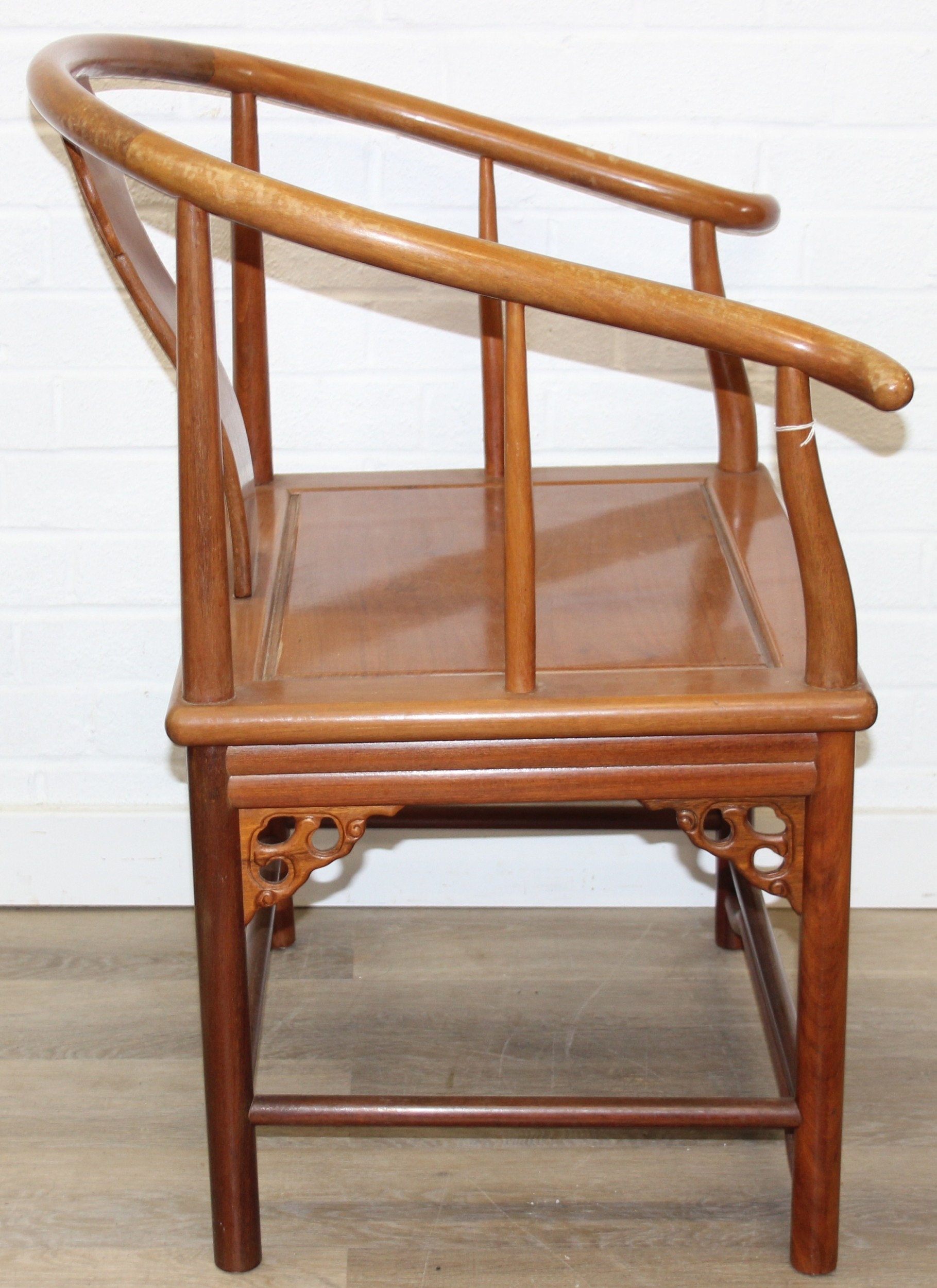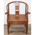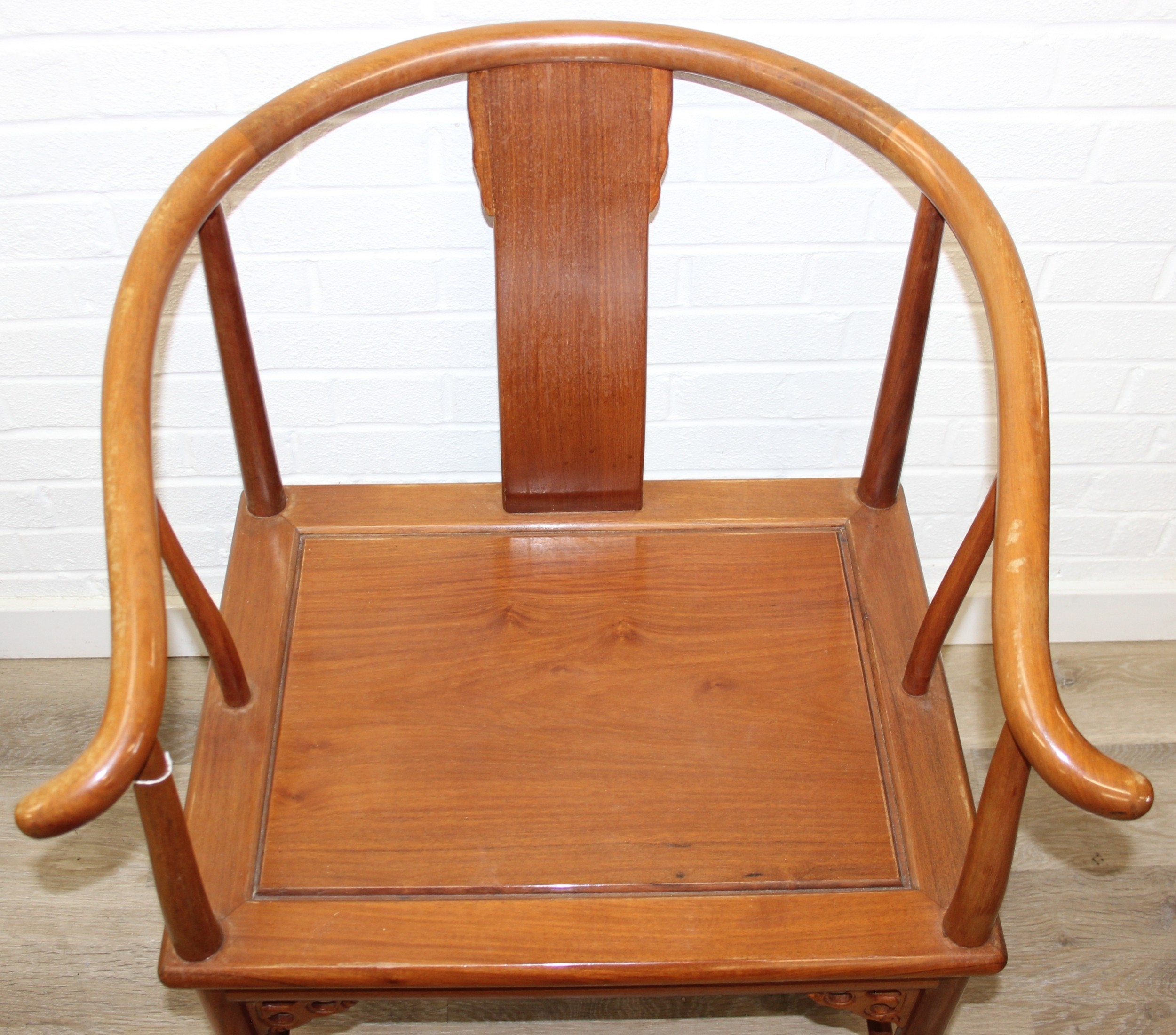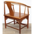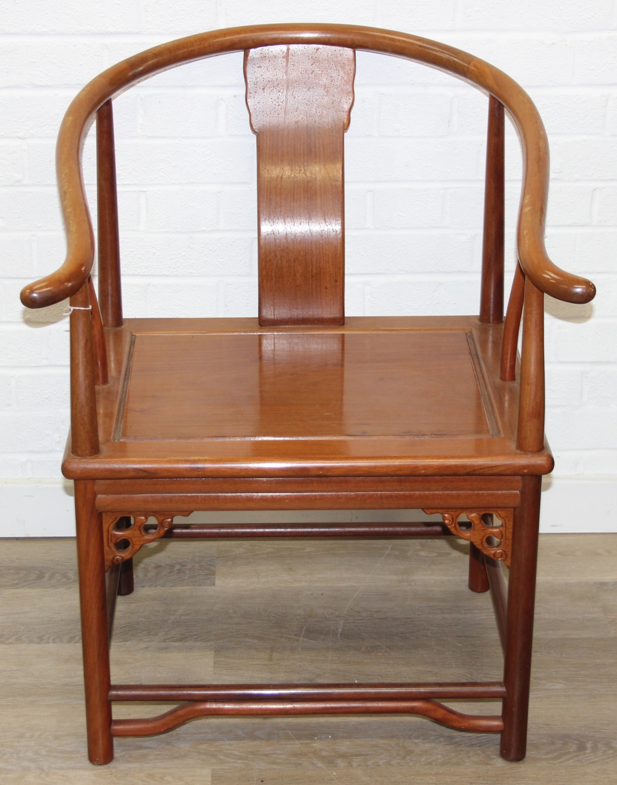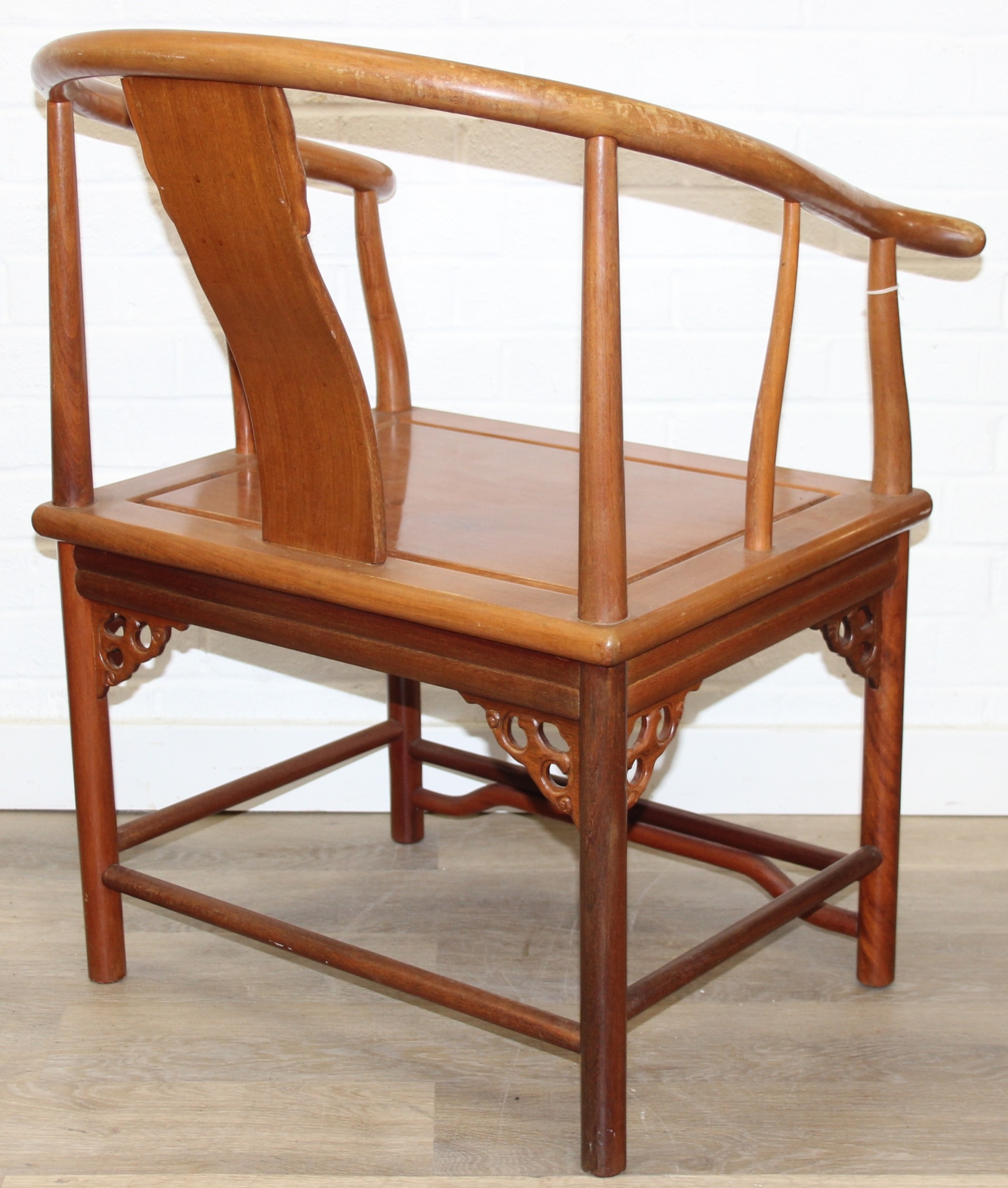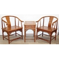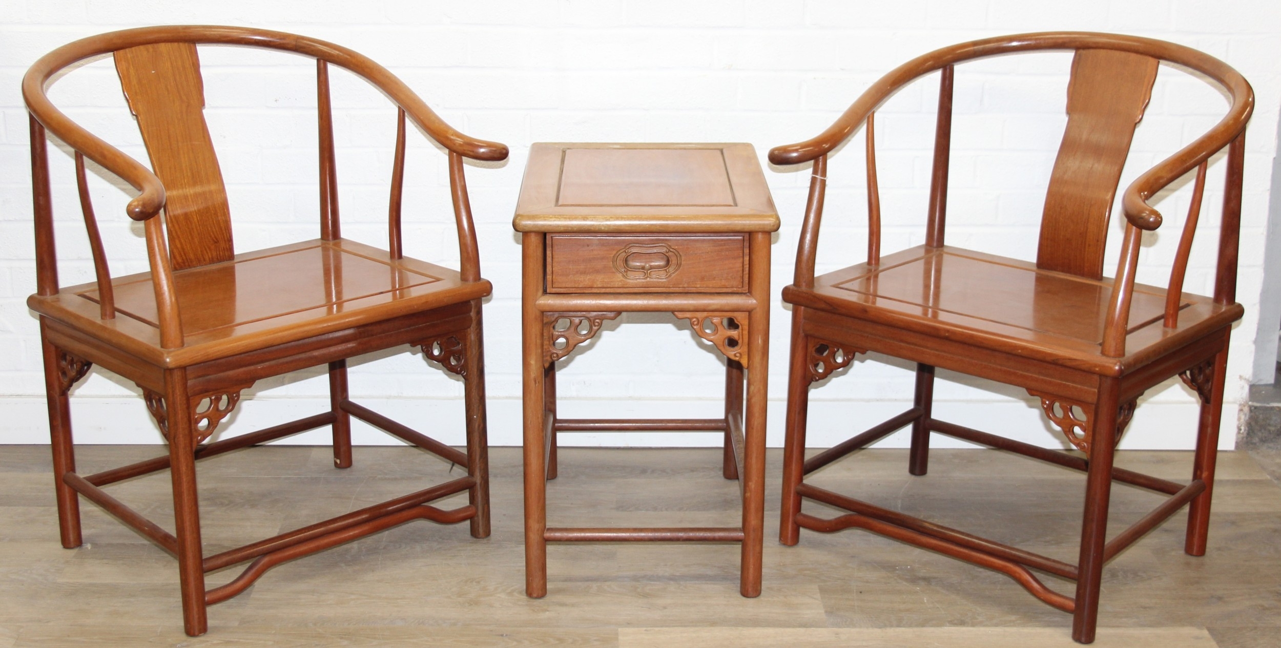 A pair of Chinese hardwood chairs with horseshoe back and a similar matching hardwood table, 20th century, the table 41cm x 56cm x 52cm [3 items]