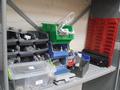 SHELF OF SCREWS, SCALPELS, NUTS, BOLTS, WASHERS AND STORAGE ETC.,