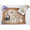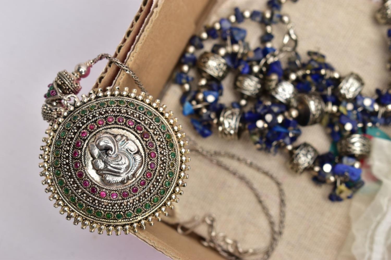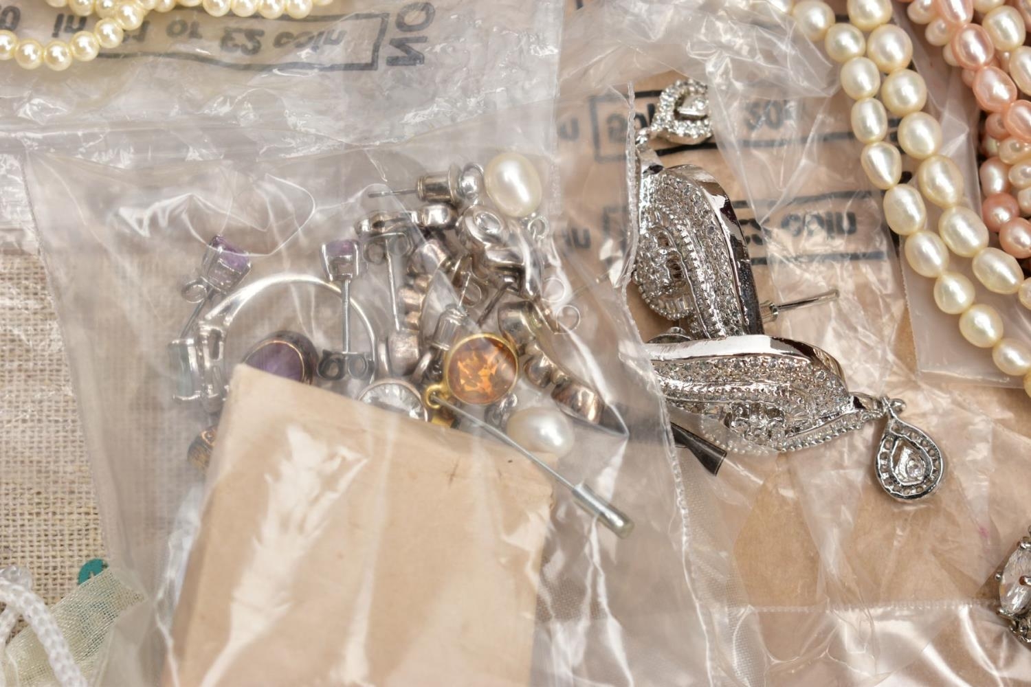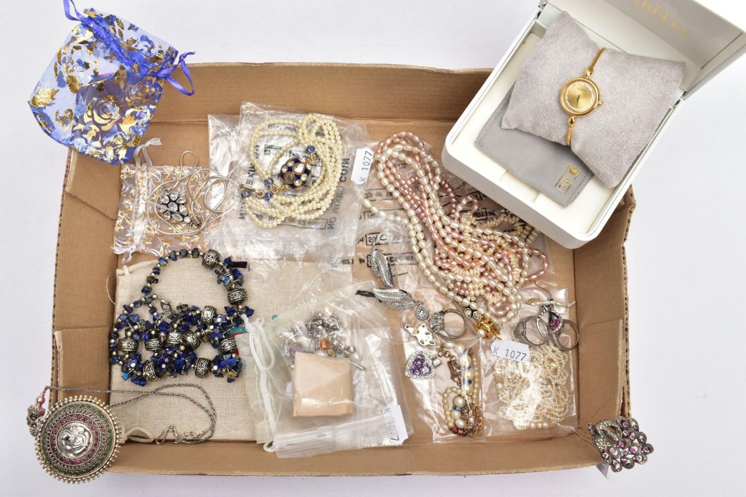 A SELECTION OF COSTUME JEWELLERY, to include four cultured pearl necklaces each fitted with a yellow metal clasp, a white metal Indian pendant necklace, set with synthetic rubies and green paste, a white metal and sodalite beaded necklace fitted with a white metal lobster claw clasp, an imitation pearl necklace fitted with a blue enamel ball pendant, a white metal and colourless paste set pendant necklace, stamped '925', colourless paste set drop earrings, a white metal marcasite and synthetic ruby ring stamped '925', various other white metal and paste set rings, a pair of white metal and citrine set drop earrings with fishhook fittings, stamped '925', a white metal amethyst and colourless paste set heart pendant, a white metal and aquamarine ring stamped '925', ring size M ½, white metal amethyst and synthetic ruby earrings, together with a parcel of loose synthetic rubies and green paste etc also with a lady's 'Michel Herbelin' bangle style wristwatch with original box
