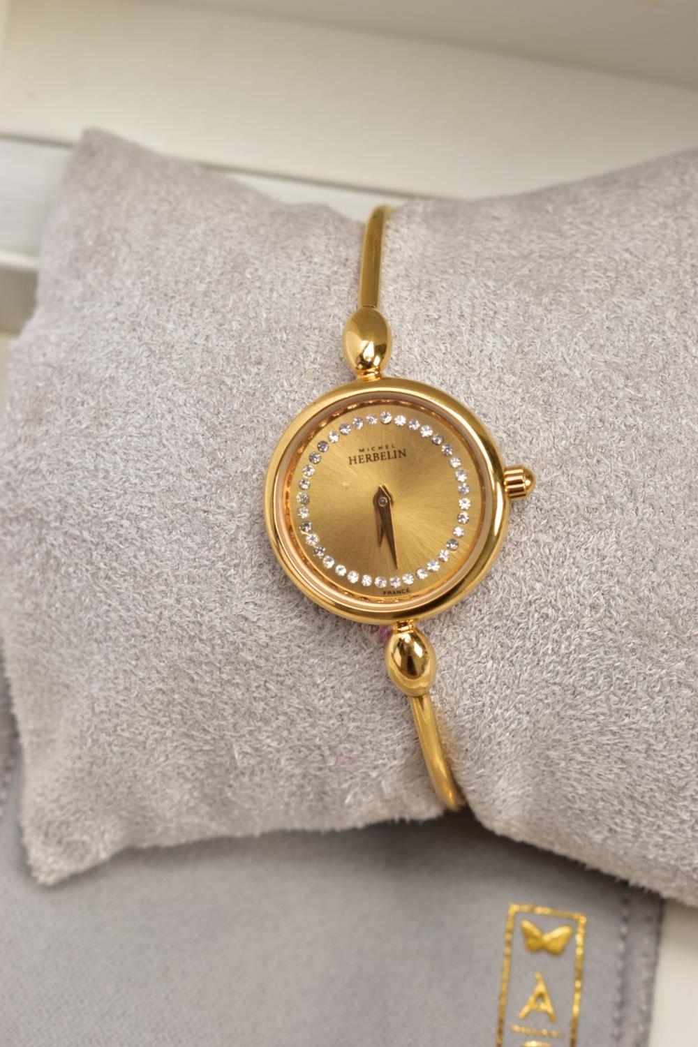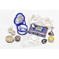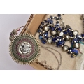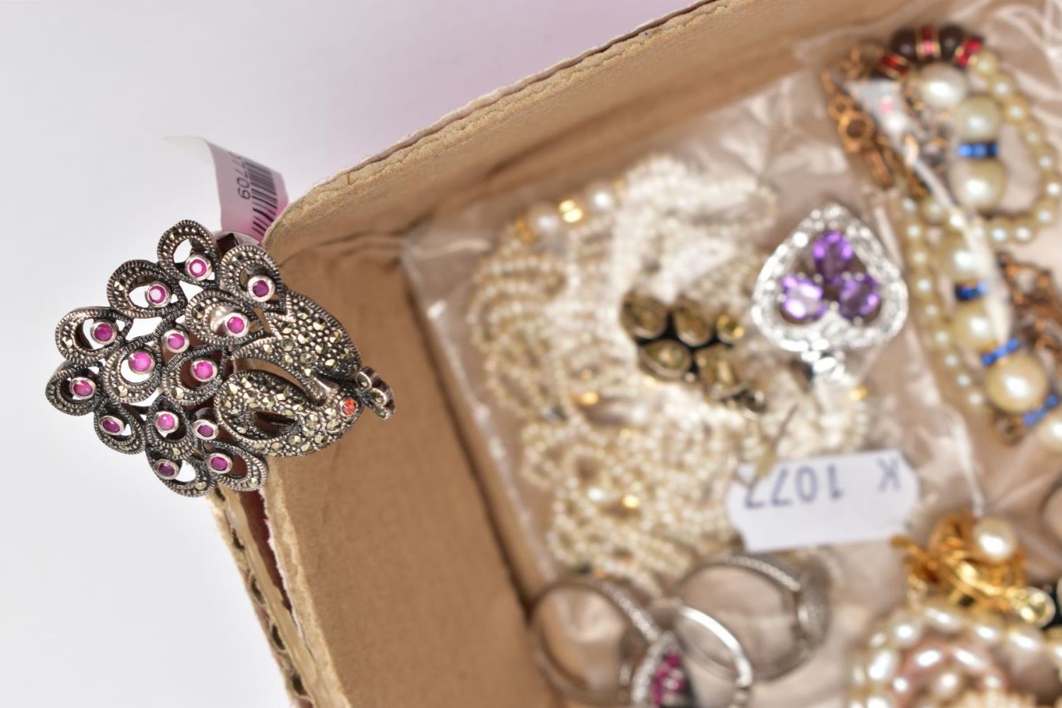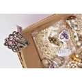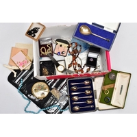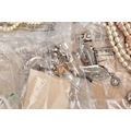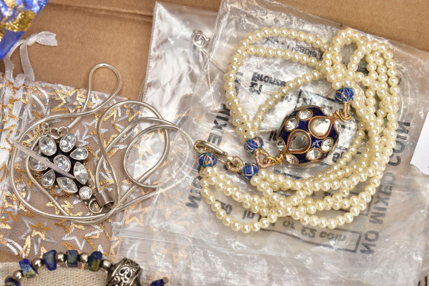 A SELECTION OF COSTUME JEWELLERY, to include four cultured pearl necklaces each fitted with a yellow metal clasp, a white metal Indian pendant necklace, set with synthetic rubies and green paste, a white metal and sodalite beaded necklace fitted with a white metal lobster claw clasp, an imitation pearl necklace fitted with a blue enamel ball pendant, a white metal and colourless paste set pendant necklace, stamped '925', colourless paste set drop earrings, a white metal marcasite and synthetic ruby ring stamped '925', various other white metal and paste set rings, a pair of white metal and citrine set drop earrings with fishhook fittings, stamped '925', a white metal amethyst and colourless paste set heart pendant, a white metal and aquamarine ring stamped '925', ring size M ½, white metal amethyst and synthetic ruby earrings, together with a parcel of loose synthetic rubies and green paste etc also with a lady's 'Michel Herbelin' bangle style wristwatch with original box