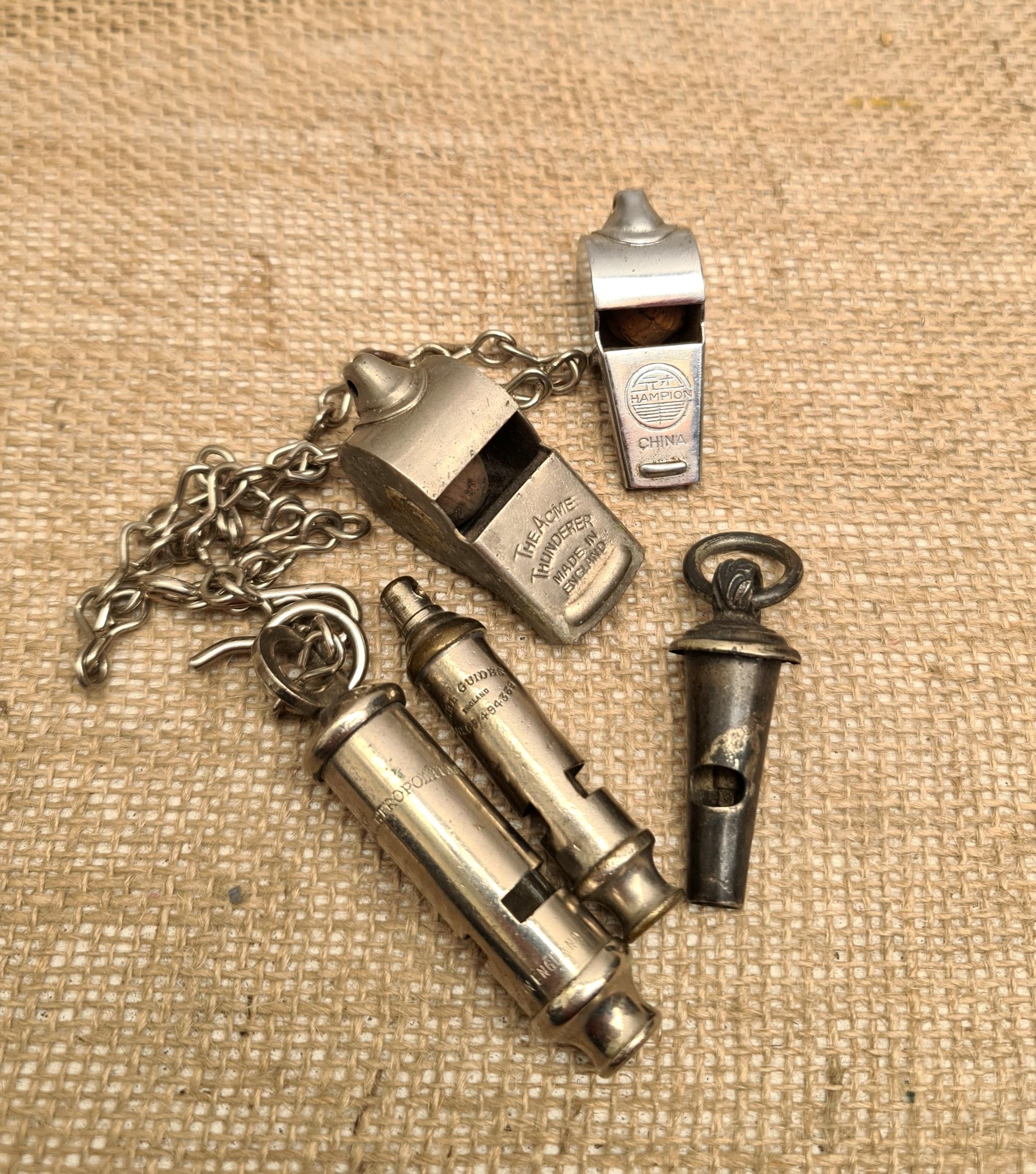 Antique and Vintage Parcel of Whistles. Five in Total. Includes Gil Guides Whistle c1930's, The Metropolitan Police Whistle With Chain, The Acme Thunderer Whistle and Two Others. Shipping is available. Please ask for a quote before bidding. Where possible we combine shipping costs. Remember, if you are the highest bidder above reserve on this Lot you have bought the item and are legally responsible for the item. Viewing is recommended in either person or via video link. Contact us to arrange.