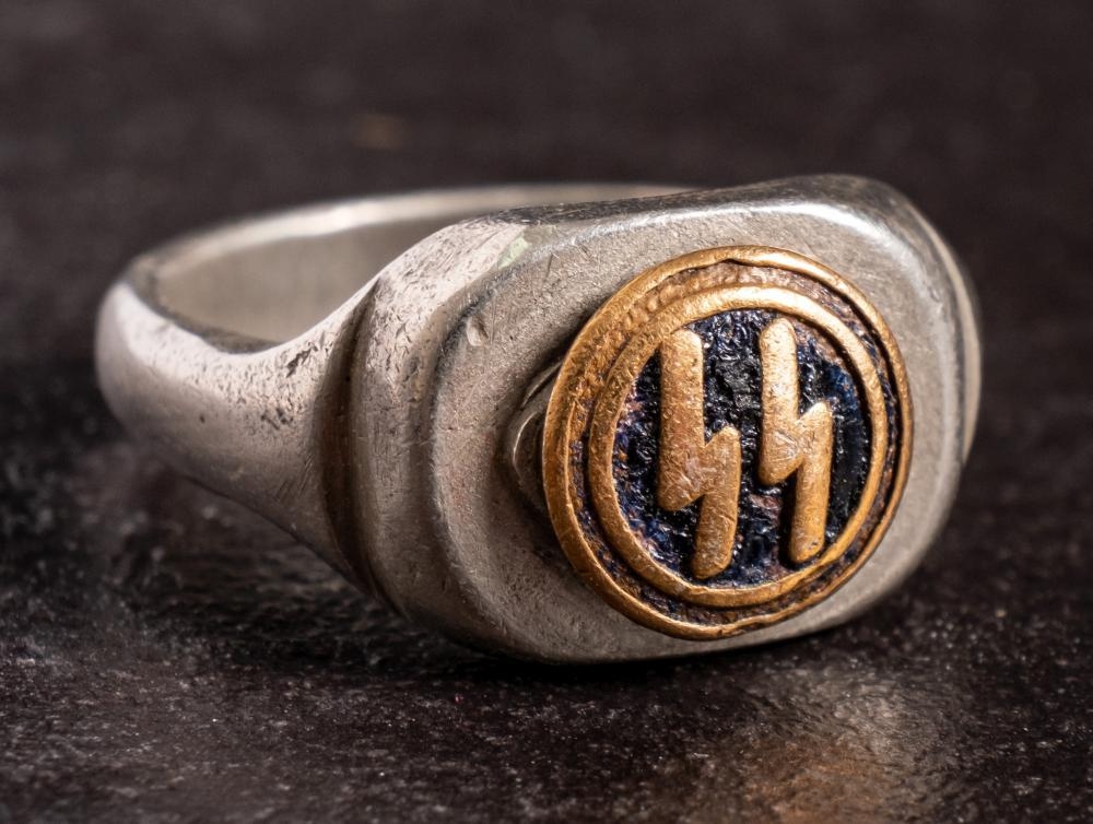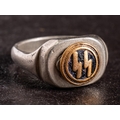 A German SS signet ring: in silver coloured metal with circular black and gilt enamel motif.
