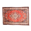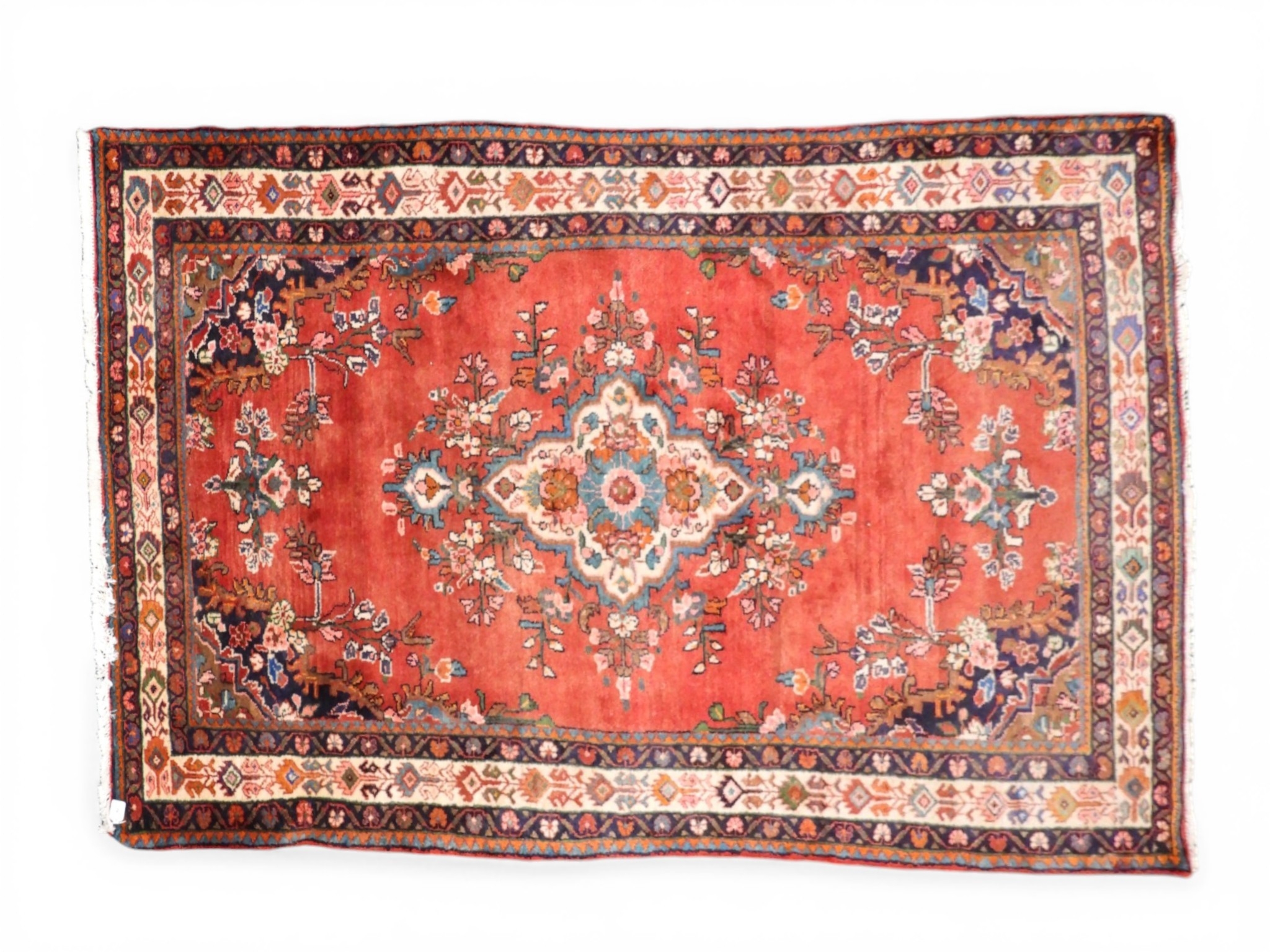 A red ground Lilian rug with cream and blue floral central medallion and dark blue spandrels on a plain ground within cream and dark blue floral geometric border, 251cm long x 158cm wide
