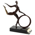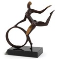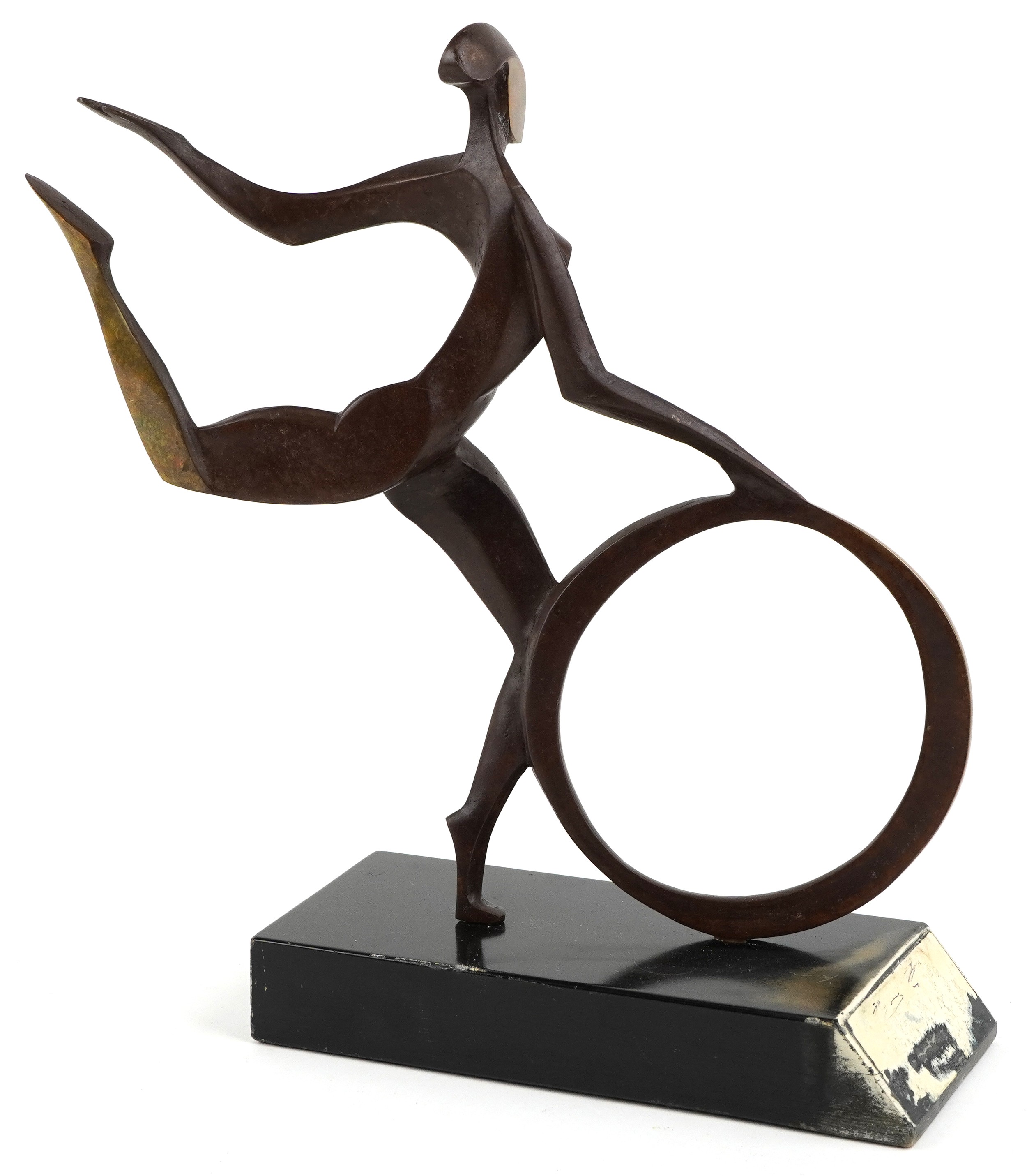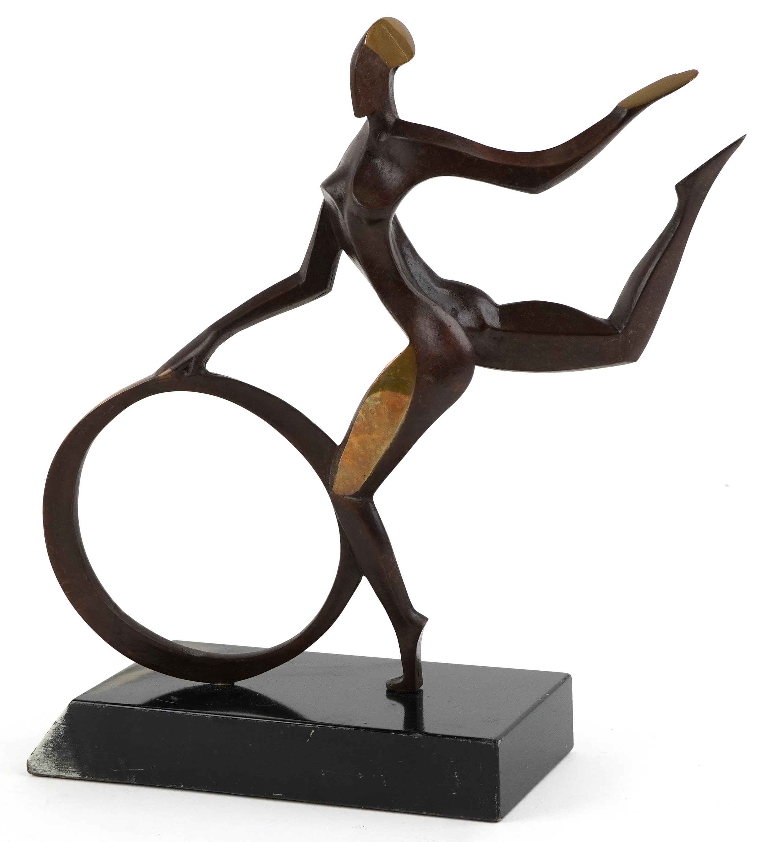 John Huggins - Girl with hoop, 20th century British school bronze sculpture, mounted on a black lacquered wooden base, 33cm high.