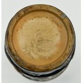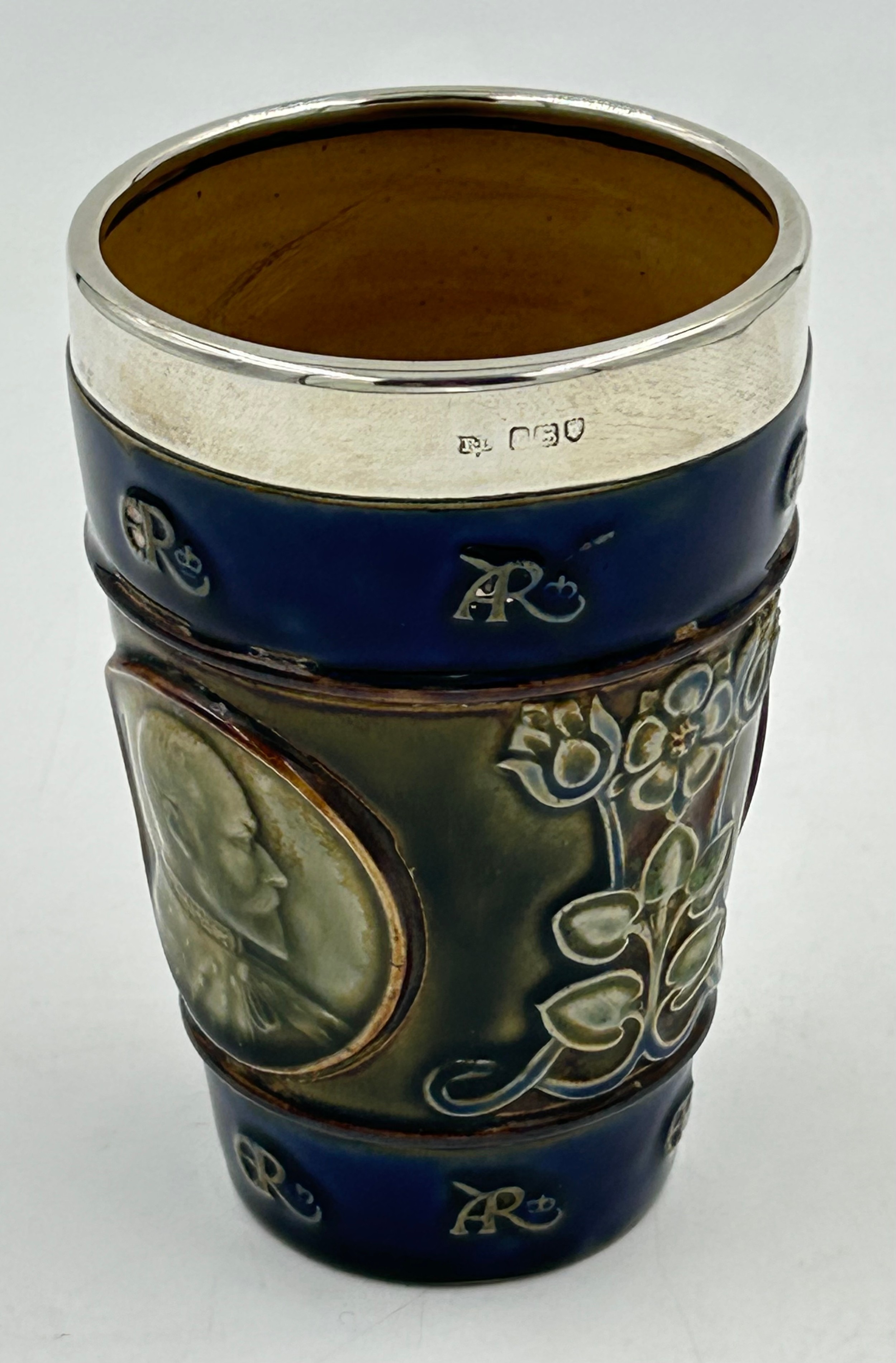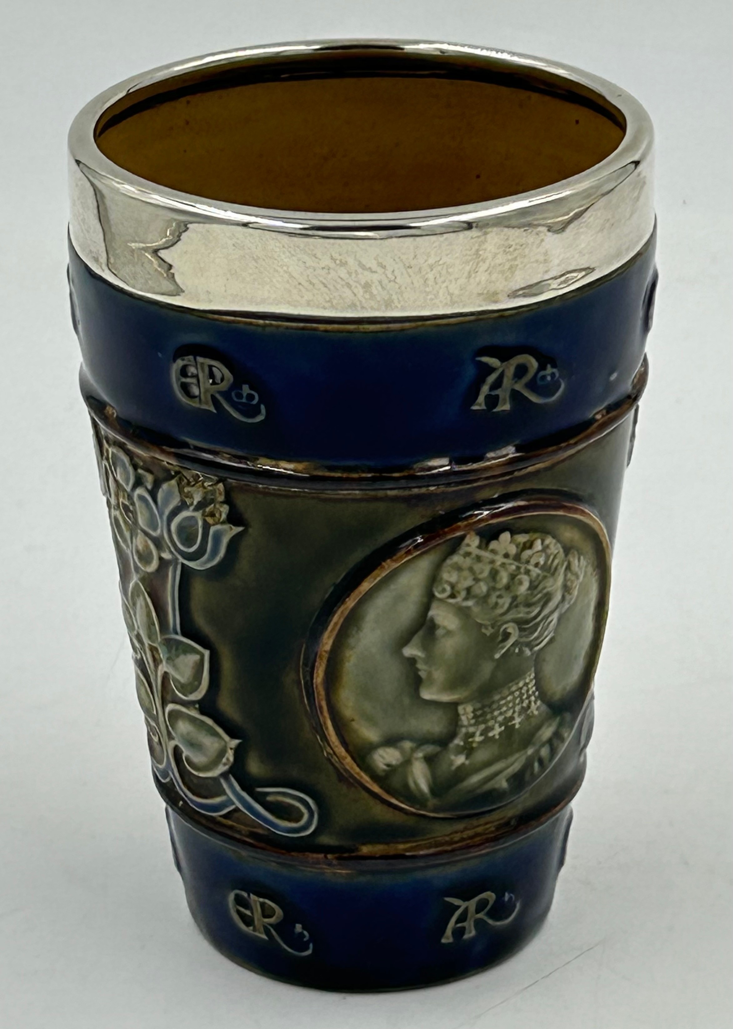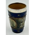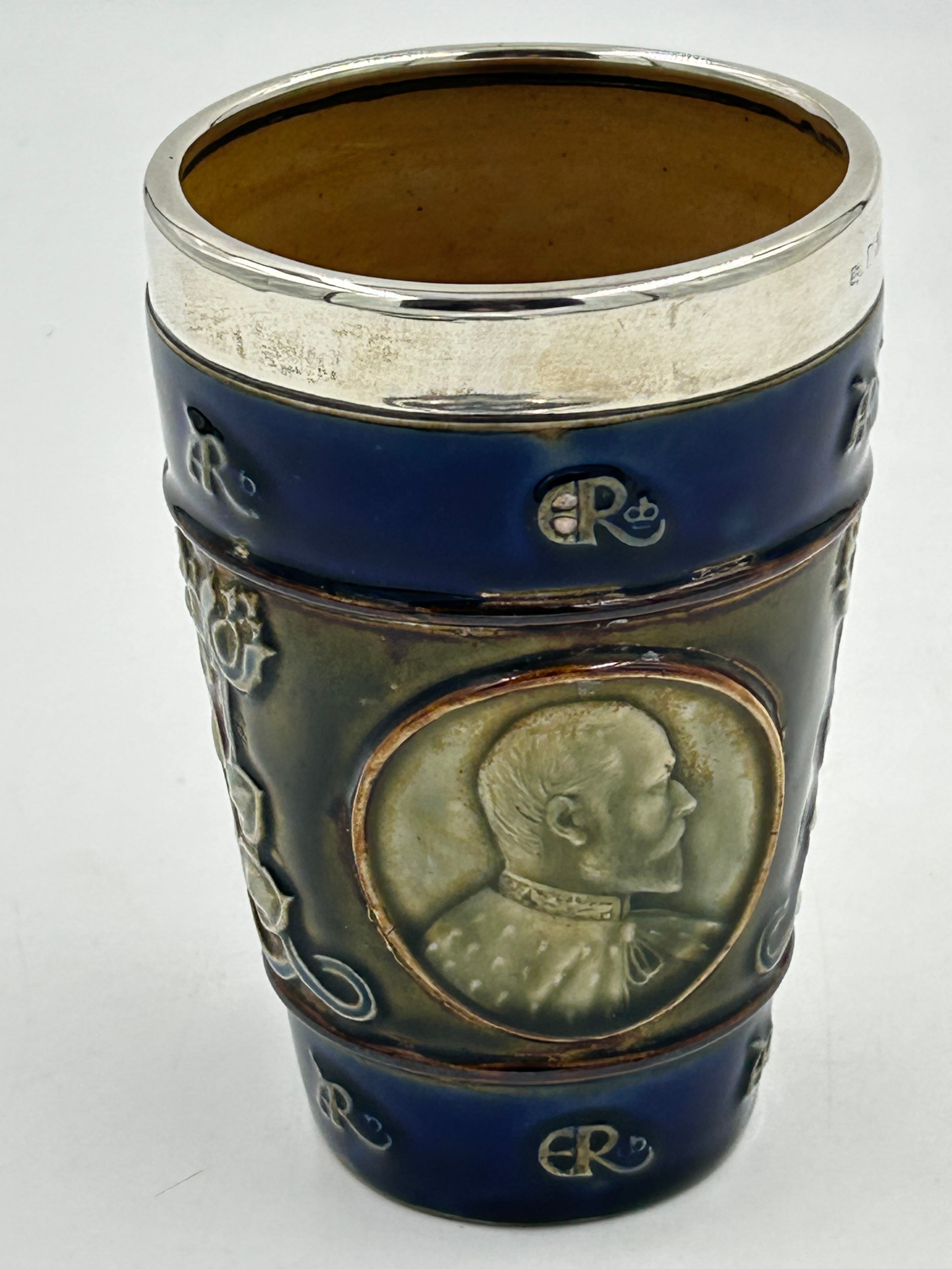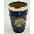 A hallmarked silver rimmed Doulton Lambeth coronation beaker for King Edward VII and Queen Alexandra, 13cm h.