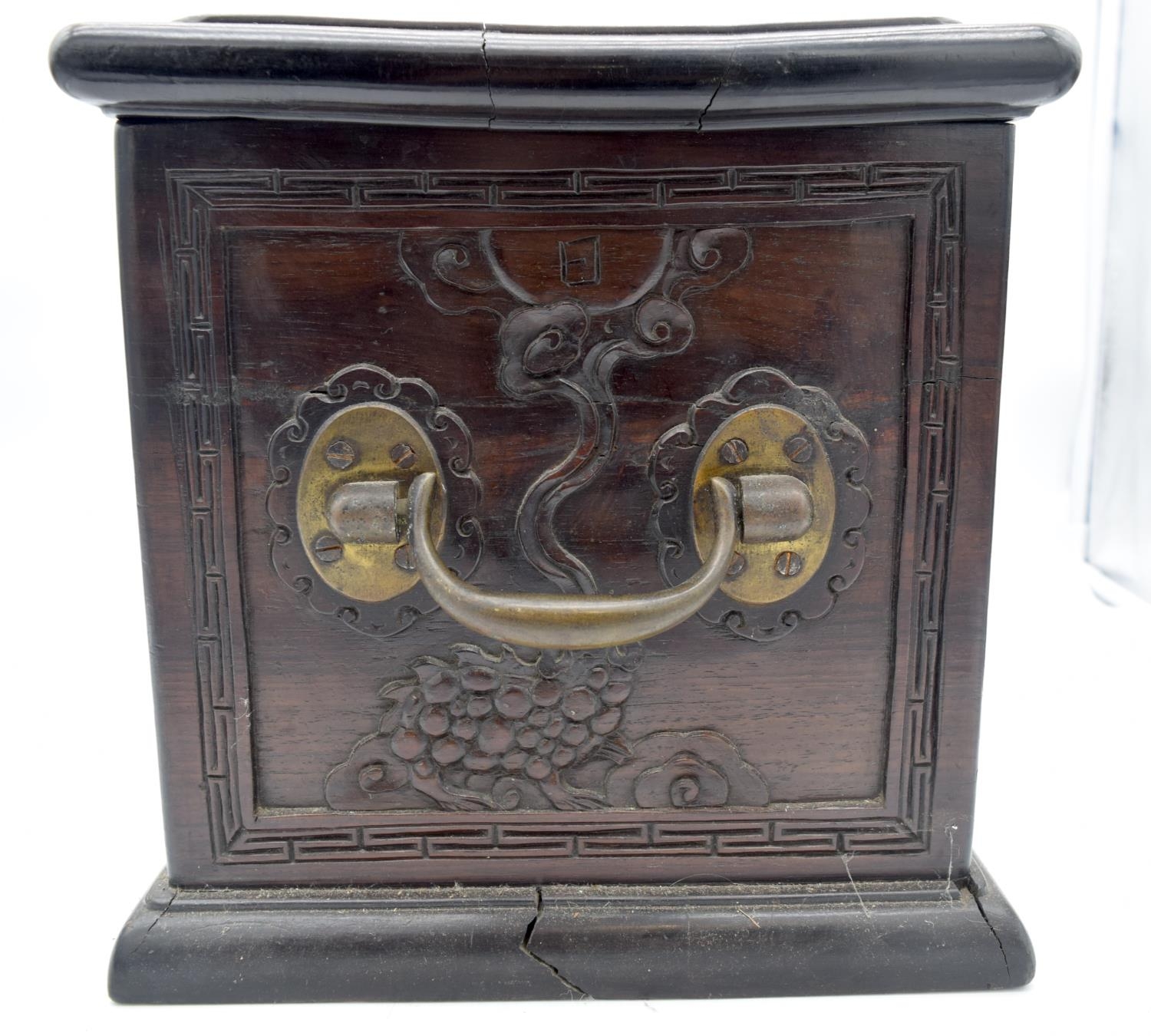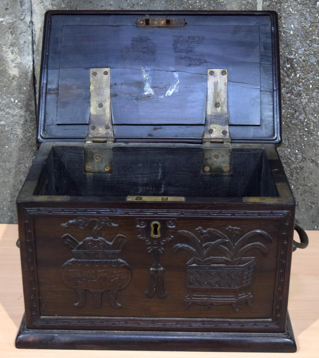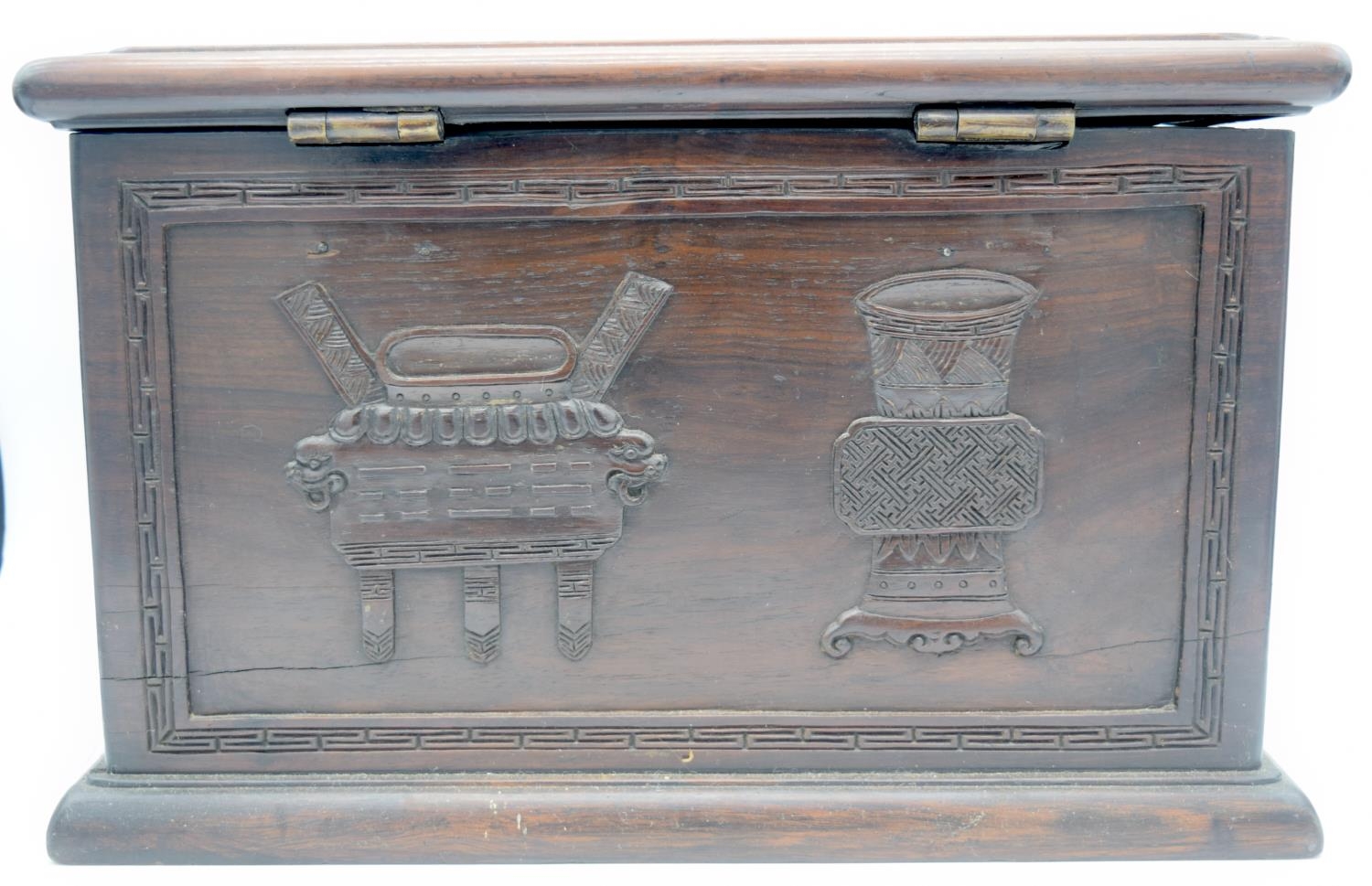 A GOOD 19TH CENTURY CHINESE CARVED HONGMU HARDWOOD DOCUMENT STORAGE CHEST Qing, decorated with urns, foliage and precious objects. 30 cm x 44 cm x 30 cm.