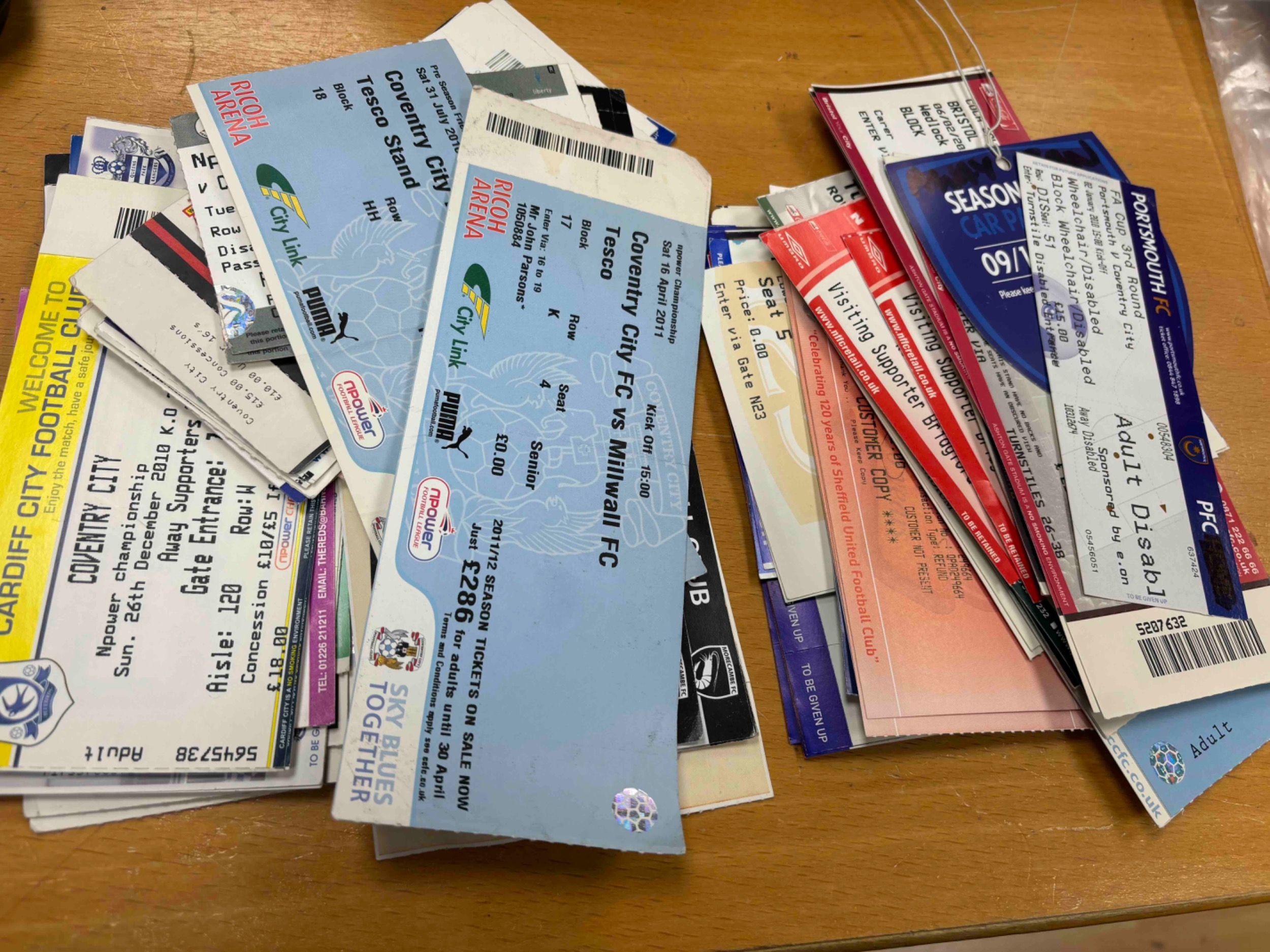 Coventry City Tickets 2009/10 x 16 home and Away (Mostly Away), 2010/11 x 22 (Majority away and some have duplicates), most games have more than one ticket, so the amount of tickets is likely to be around 70+
