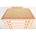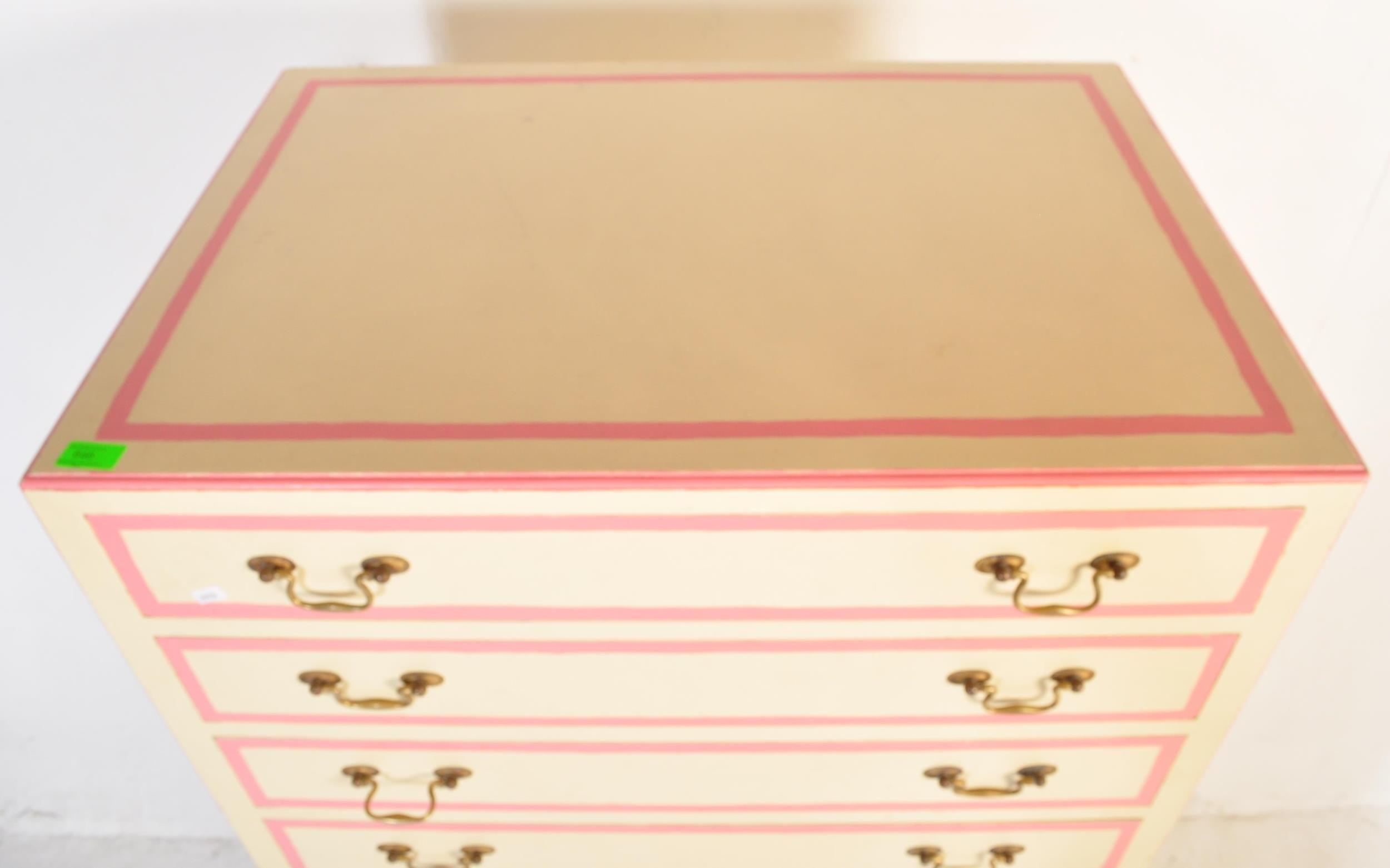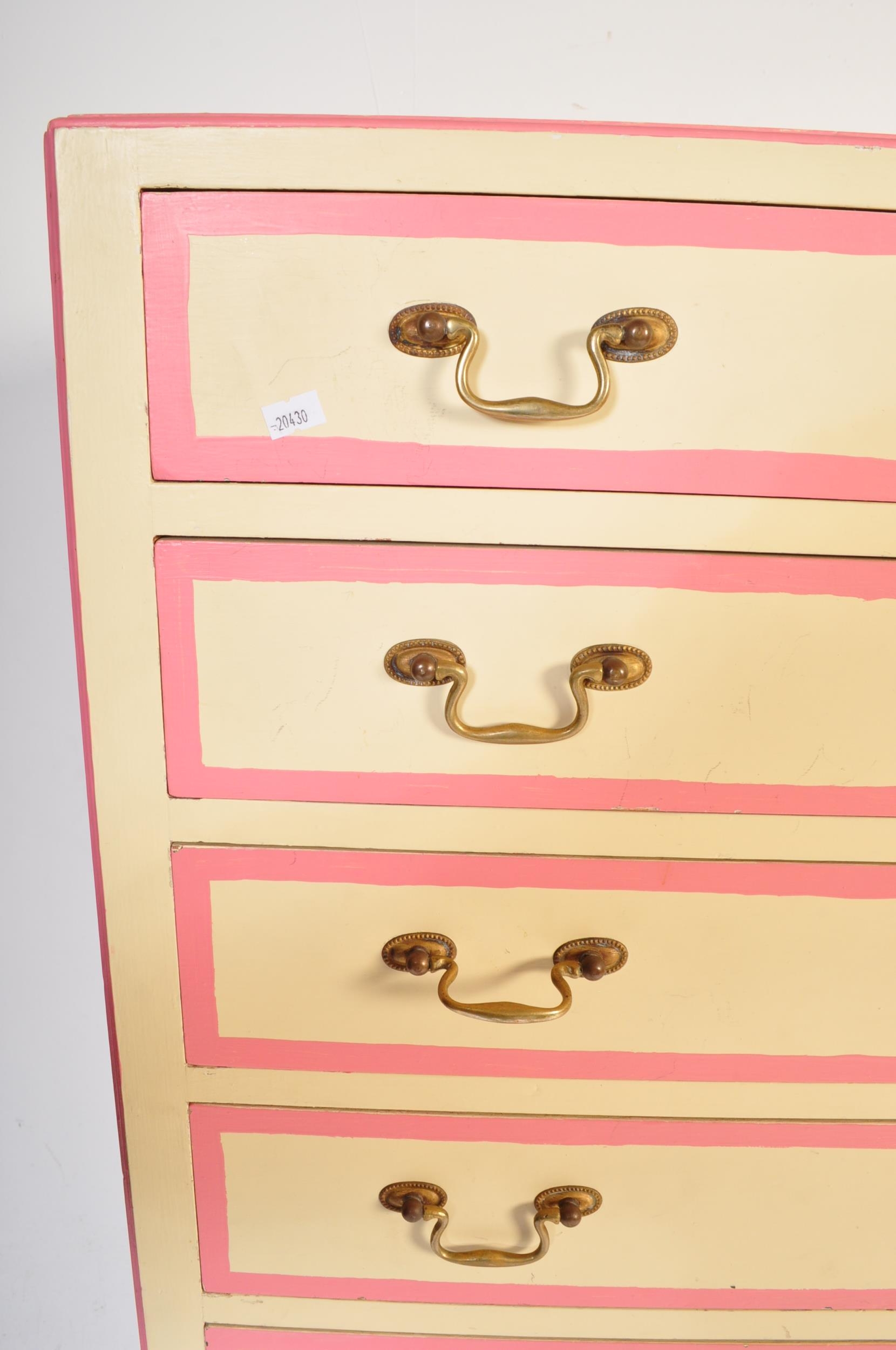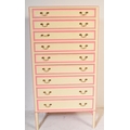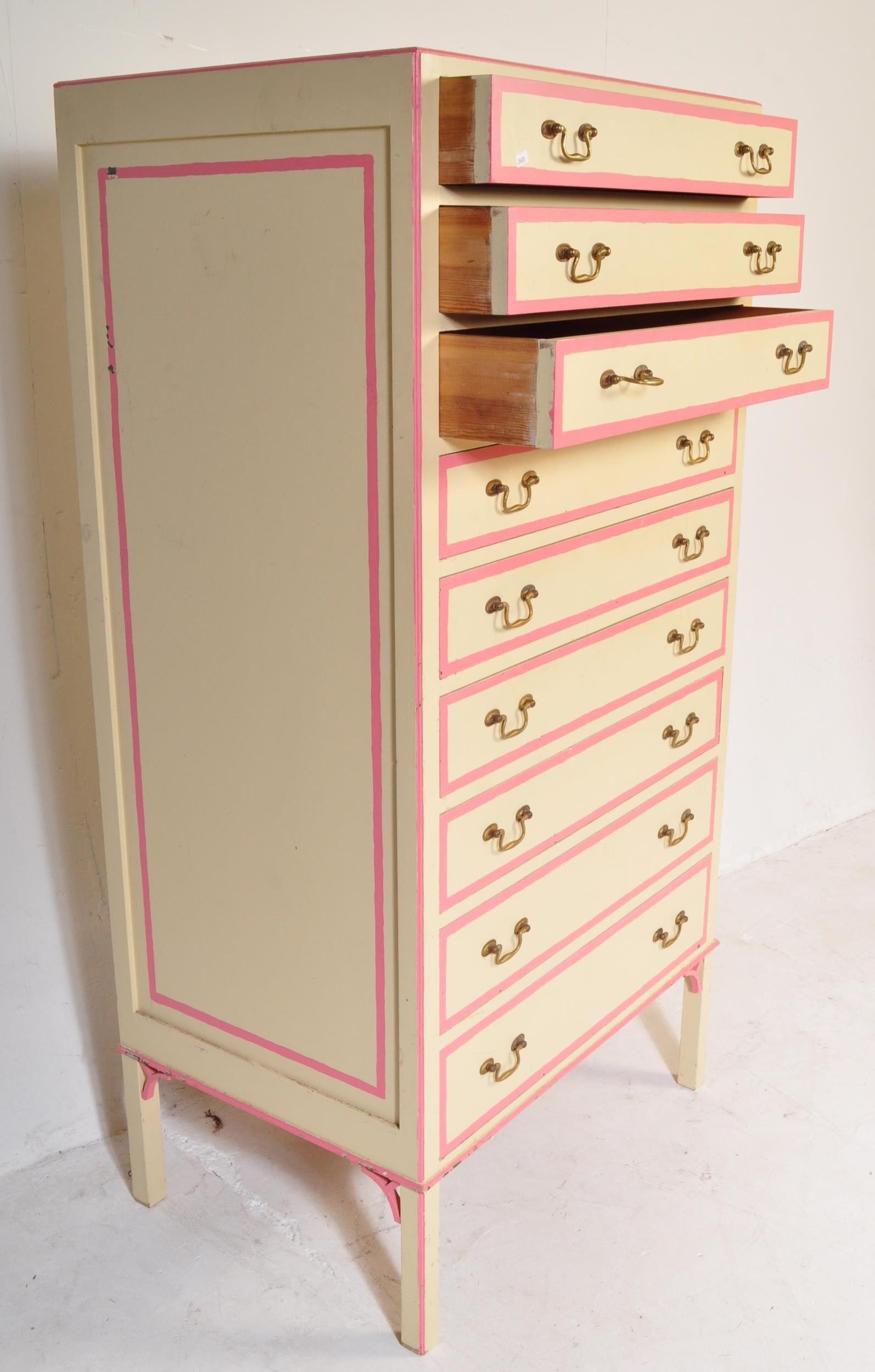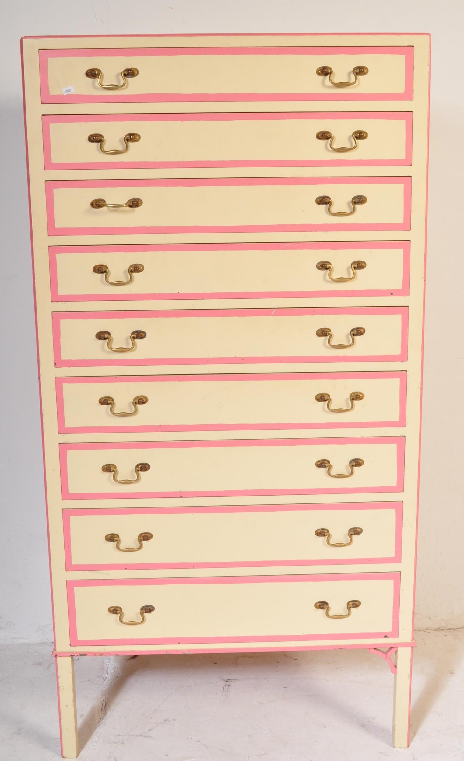 A retro vintage 20th century wooden painted tall chest of drawers. The tallboy having a series of nine narrow drawers with drop brass handles. Painted in a white & pink colourway. Raised on straight supports. Measures approx; 153cm x 78cm x 53cm.