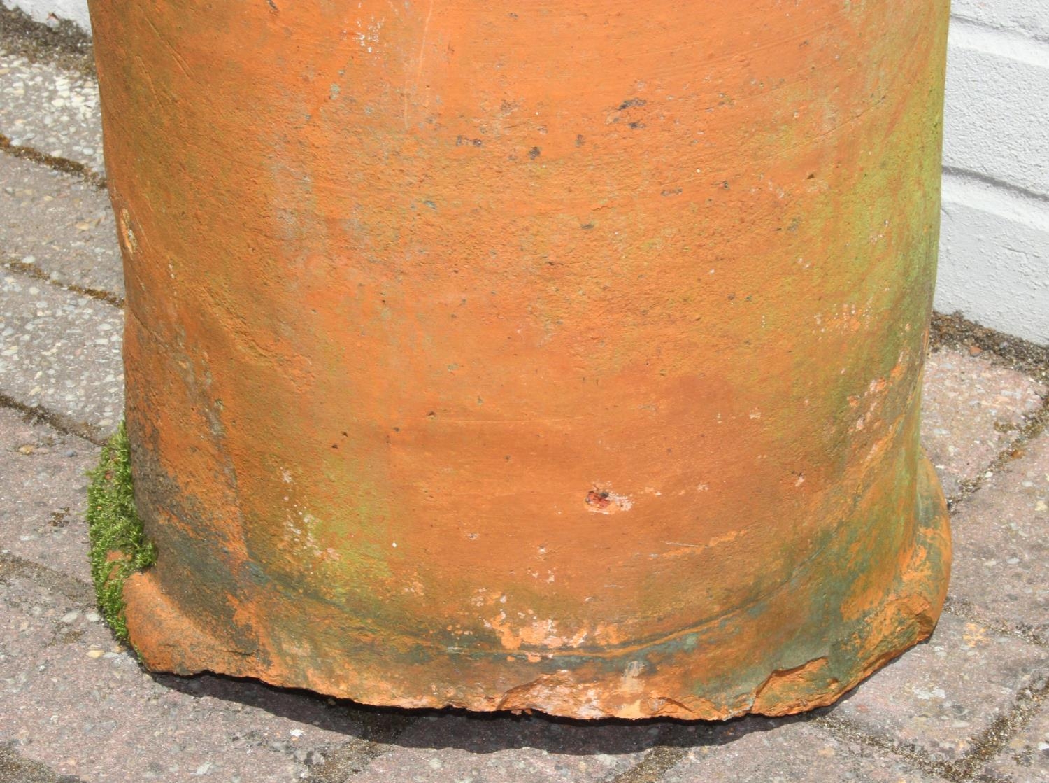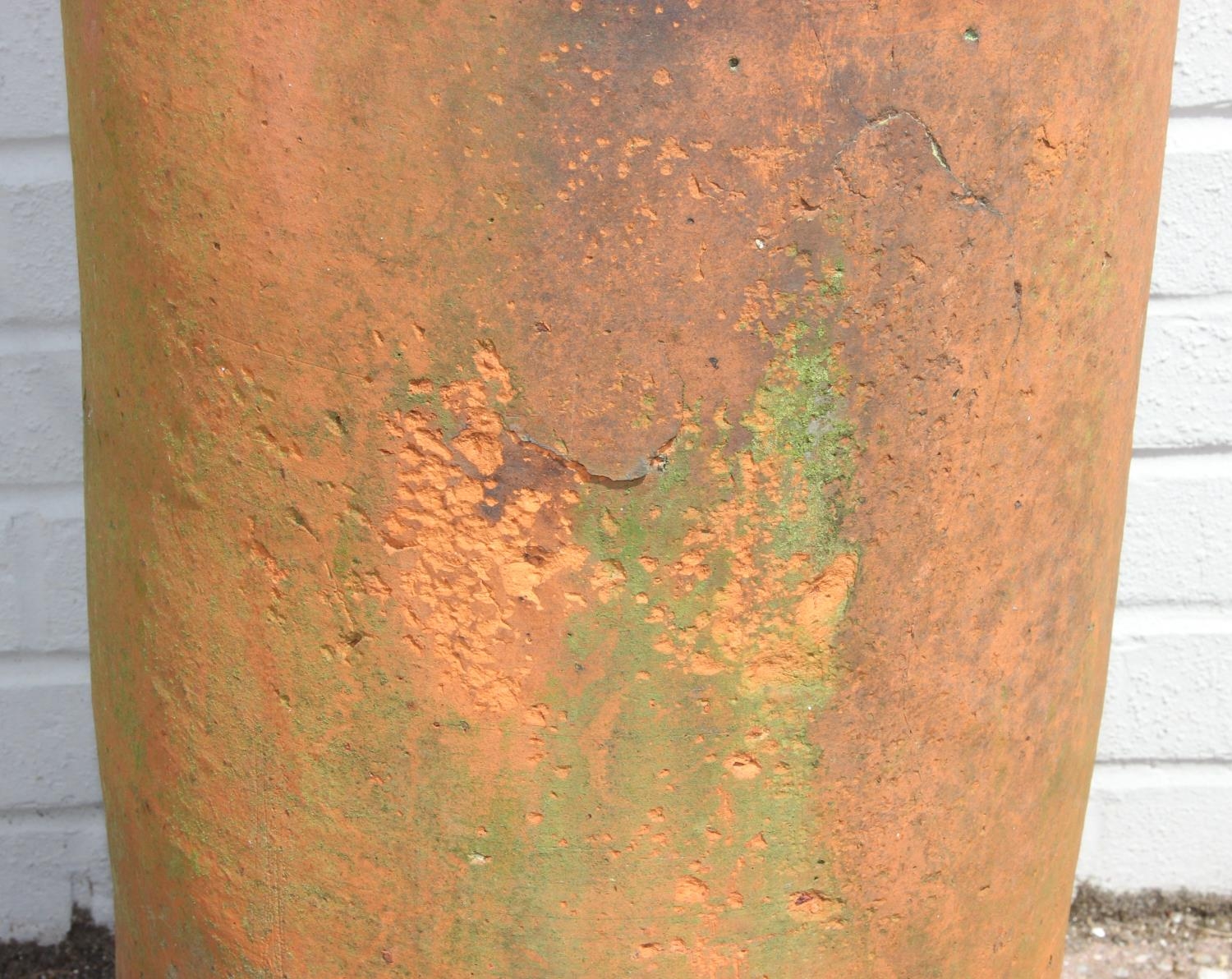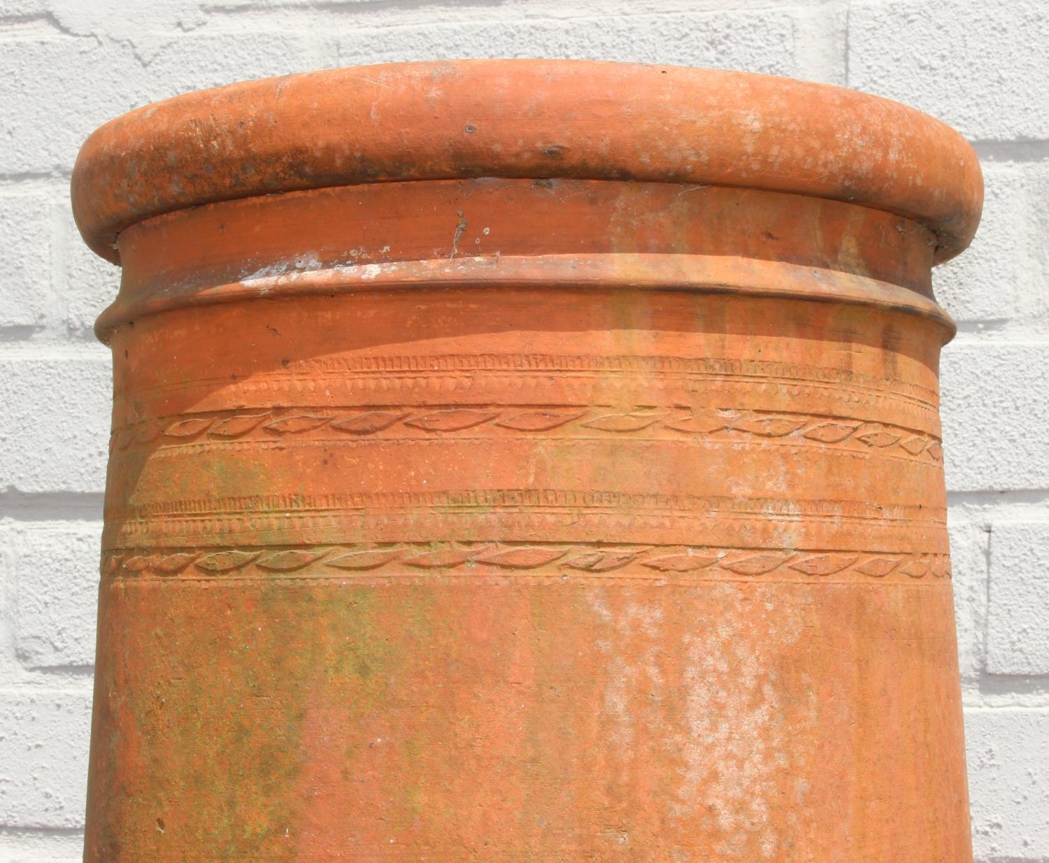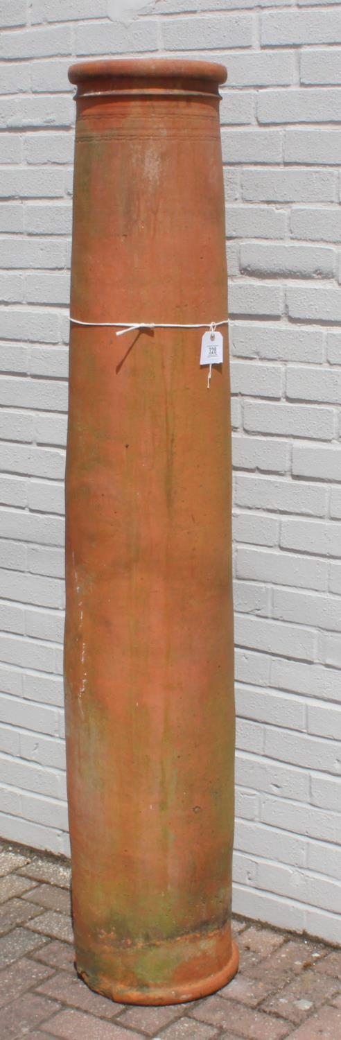 Very tall terracotta chimney pot with impressed detail near rim, 180cm tall