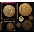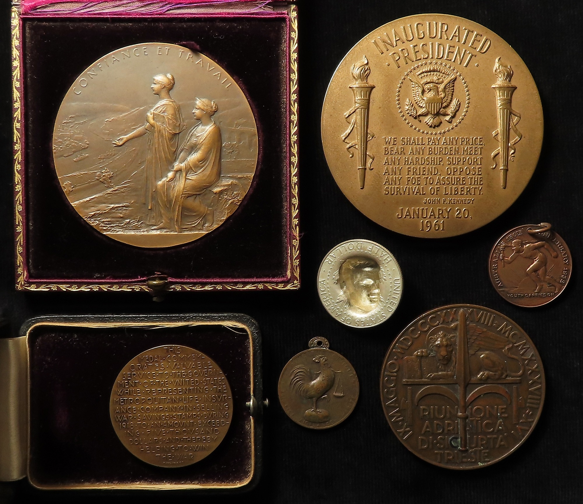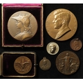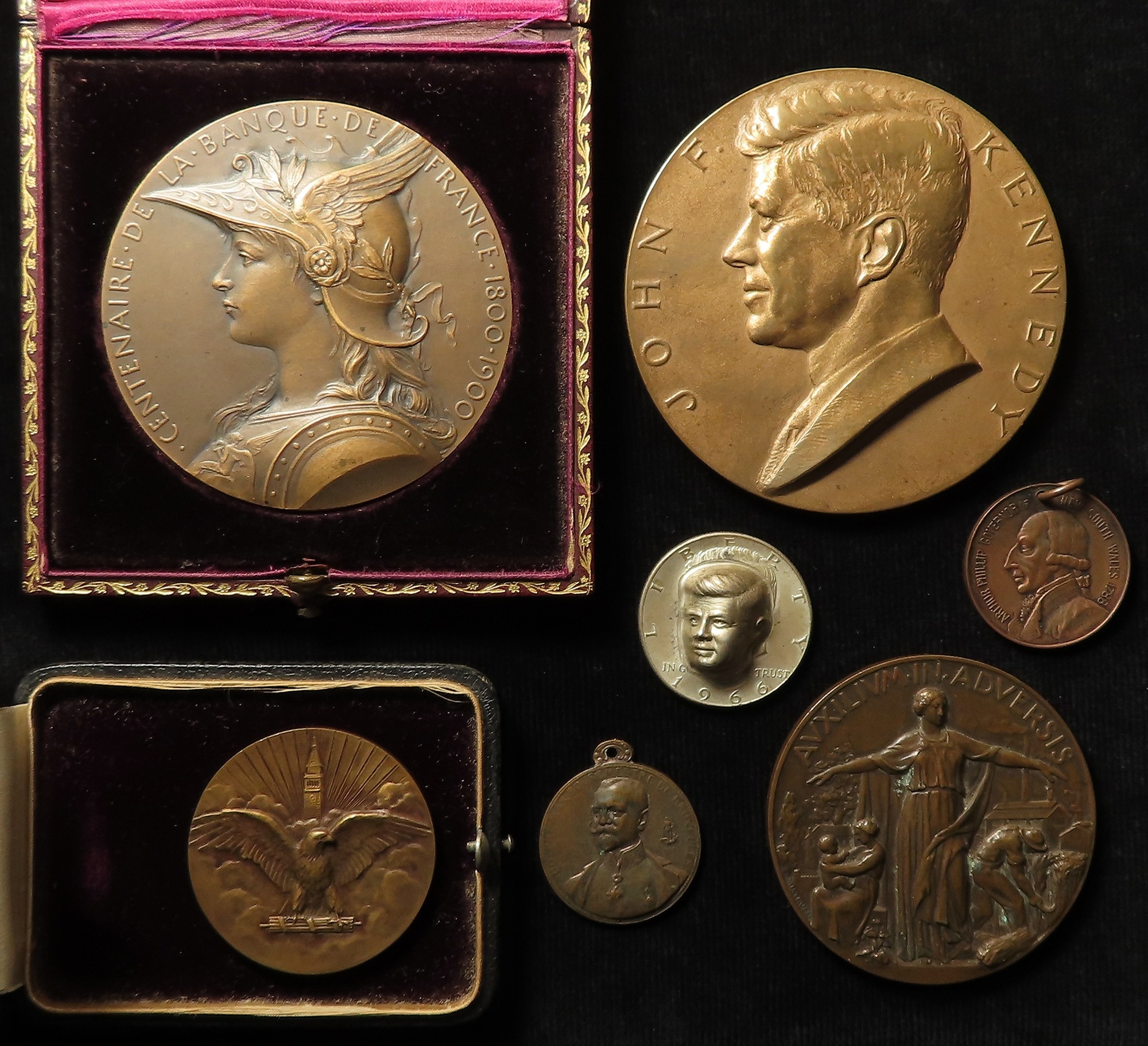 World Commemorative Medals etc (7): France, Centenaire de la Banque de France 1800-1900 large bronze medal d.68mm by O. Roty, EF; Italy, Adriatic Security Meeting 1938 medal, bronze d.56mm by Mistruzzi, aEF; USA, John F. Kennedy Inaugurated President 1961 large bronze medal d.75.5mm by Gilroy Roberts, EF; a Kennedy Half Dollar 1966 with a high relief indentation of JFK's face in centre, EF; New York Metropolitan Life Insurance medal for selling $5000+ of War Savings Stamps 1918, bronze d.41mm by Tiffany & Co., EF with a New York jeweller's case; Australia, 150th Anniversary 1938 bronze medalet d.29mm, VF, holed with suspension ring; and a Brussels shooting 1914 bronze medalet d.28mm, VF with loop.