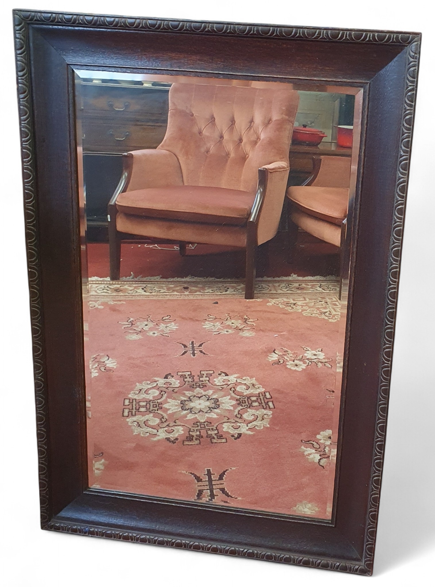 An early 20th Century Oak rectangular Mirror with bevelled mirror glass. Of good size. H 97 x 66 cm approx.
