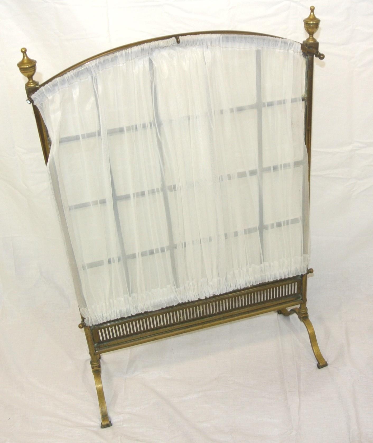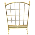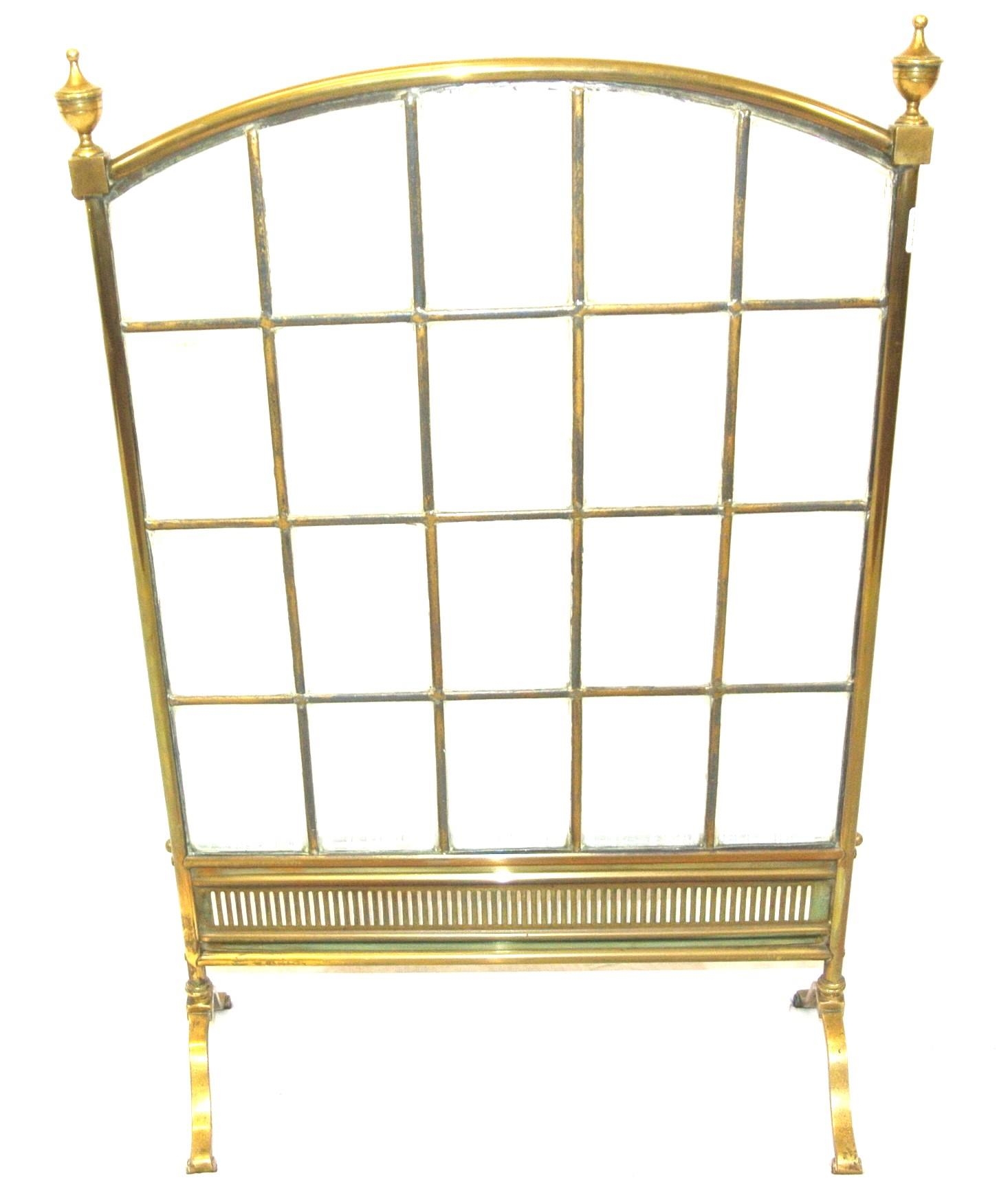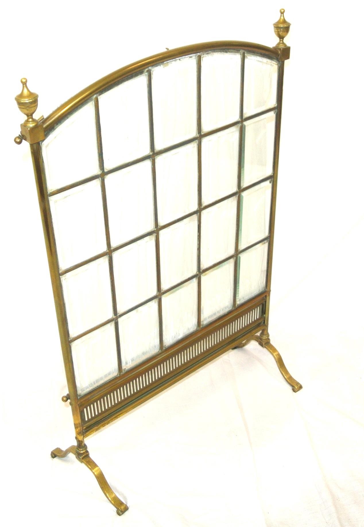 Edwardian brass framed meshed firescreen with bevelled glass insets, on bracket feet