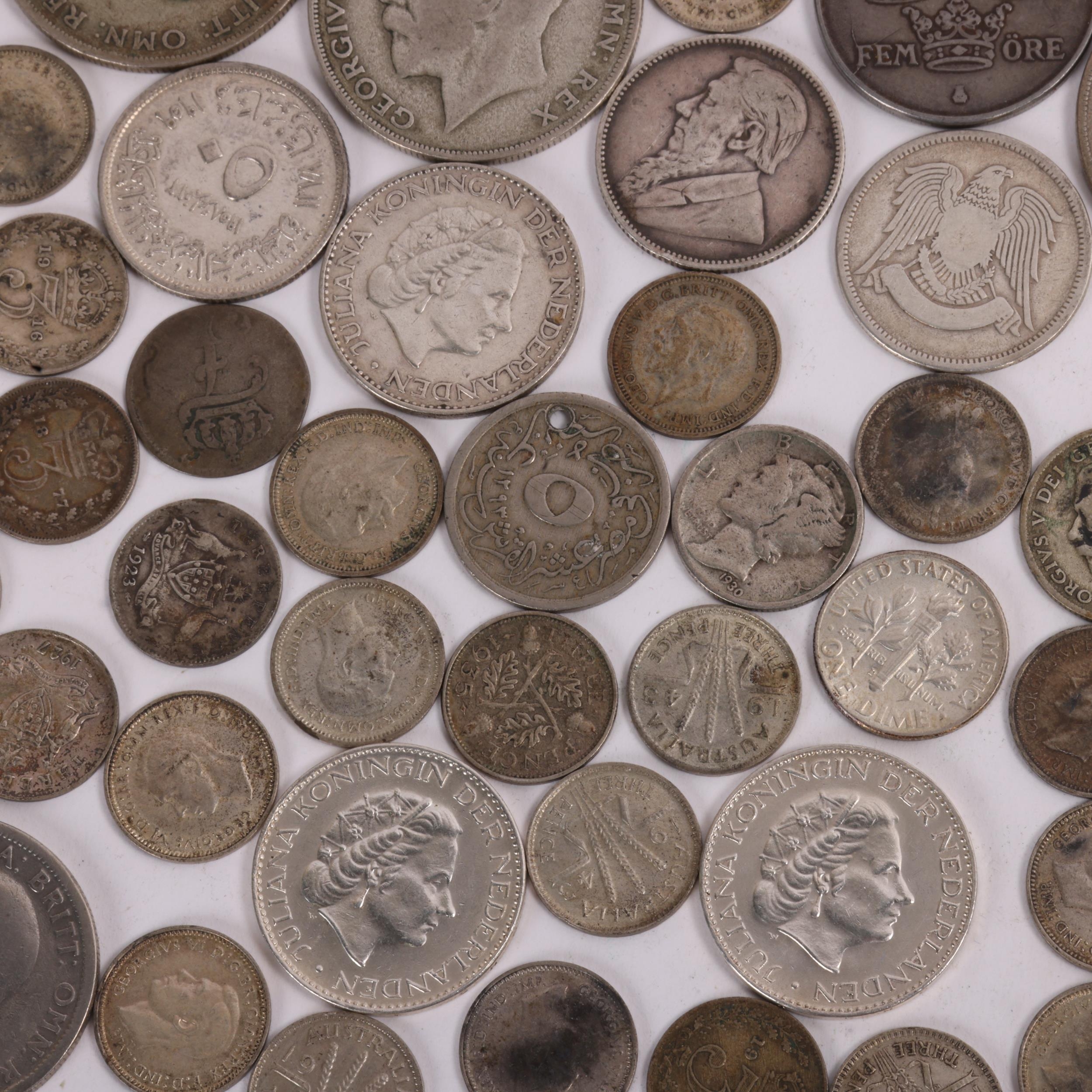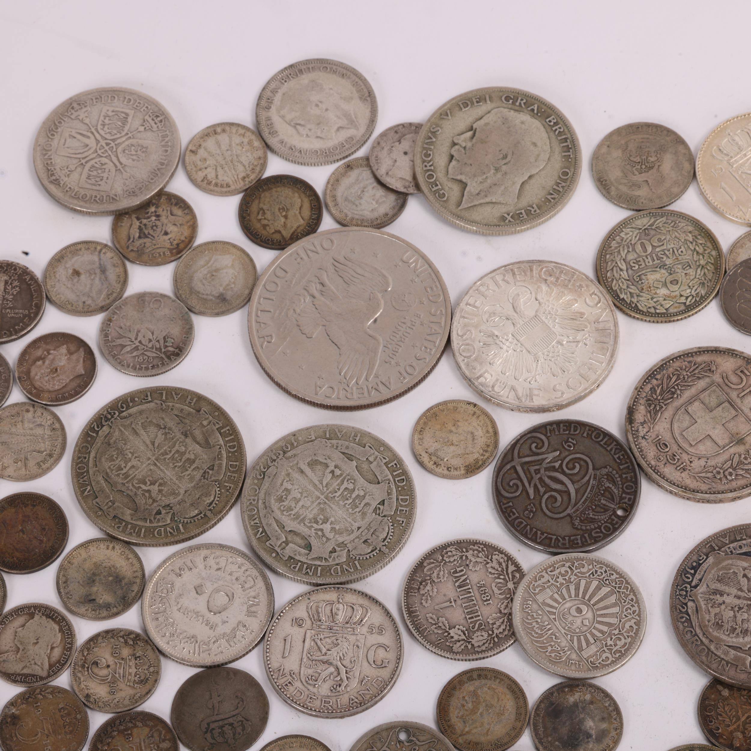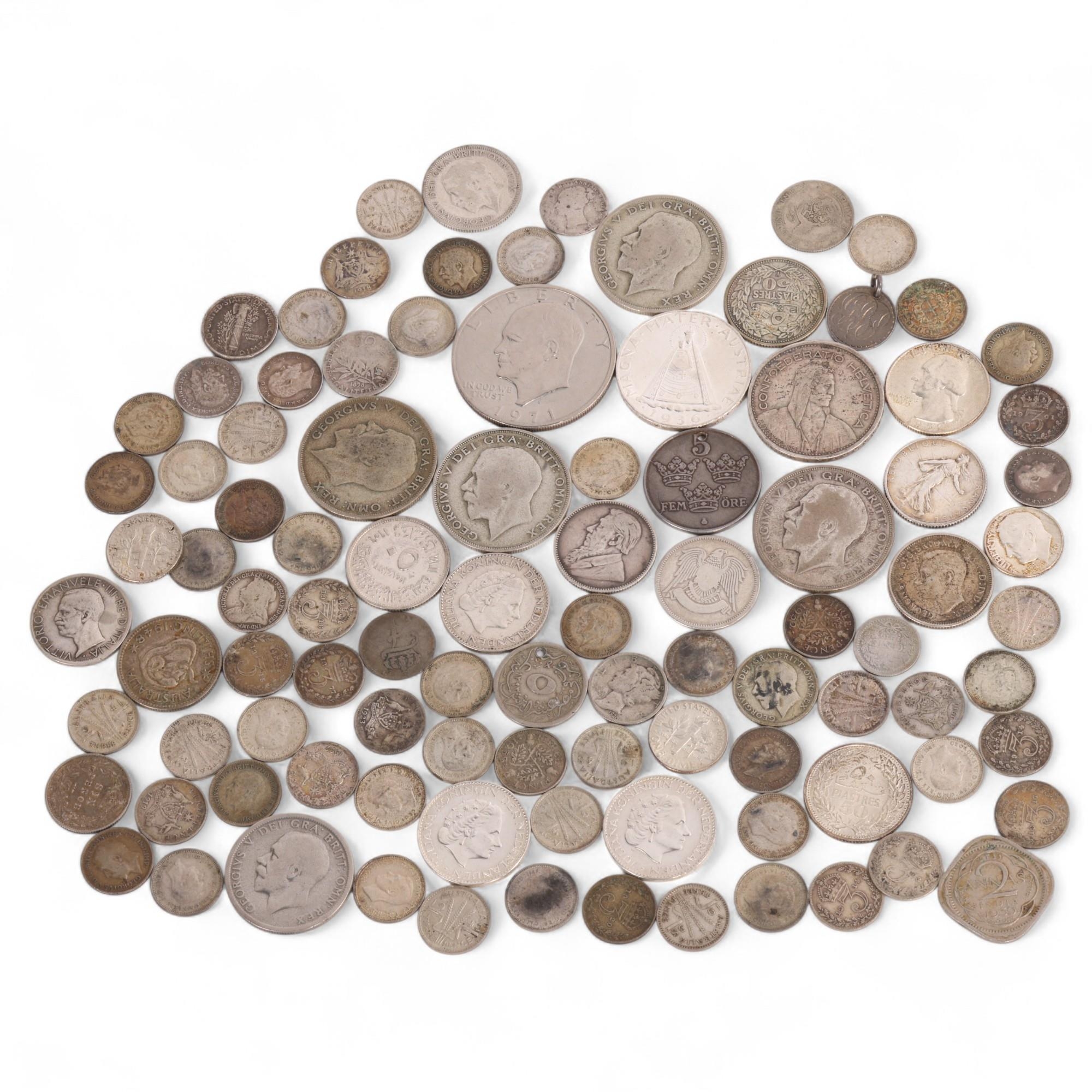 A collection of British and world silver coinage, including many British pre 1947 some pre 1920, a 1971 US Dollar (Denver Mint), others with silver content, total weight 325g