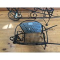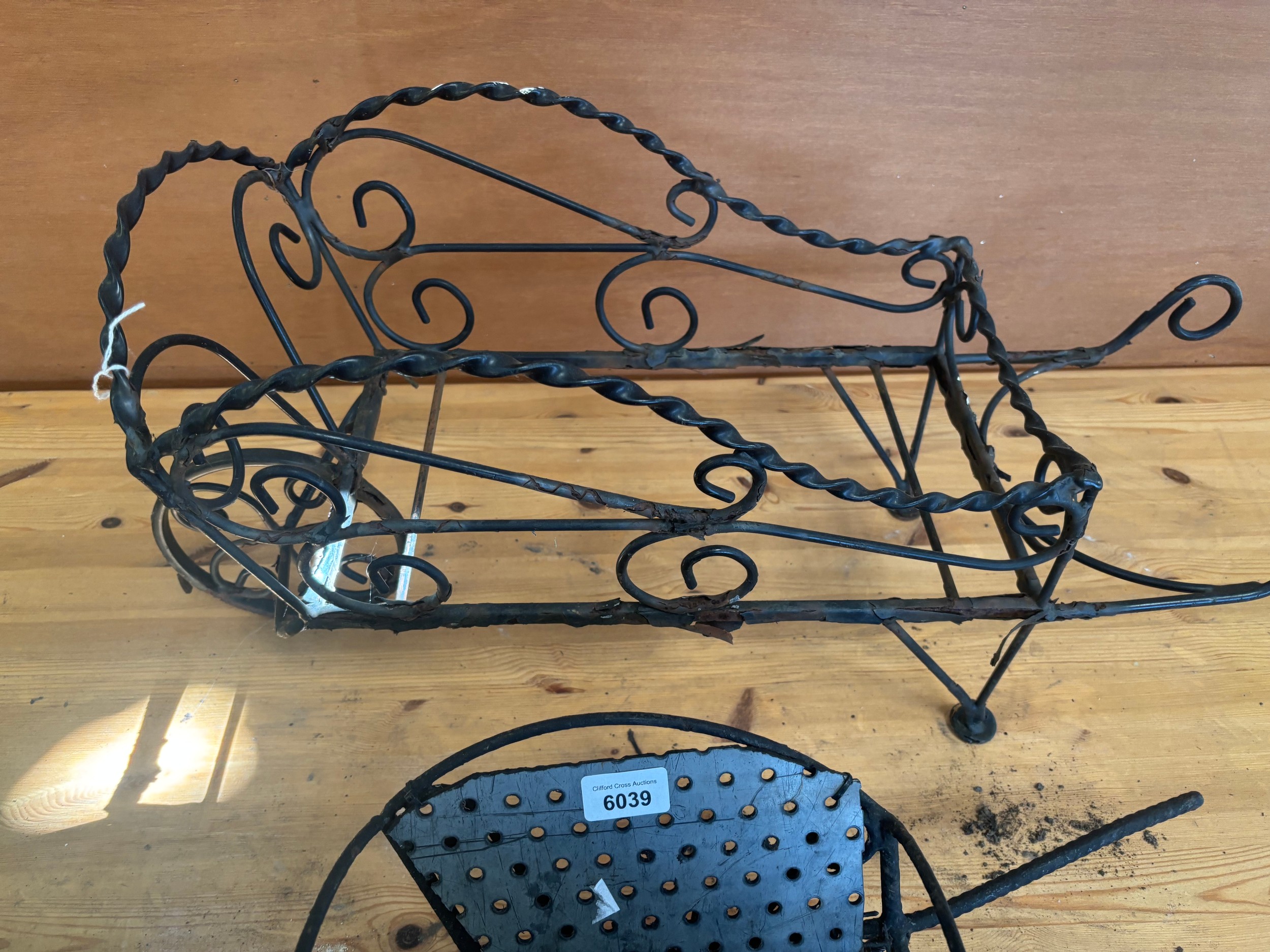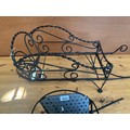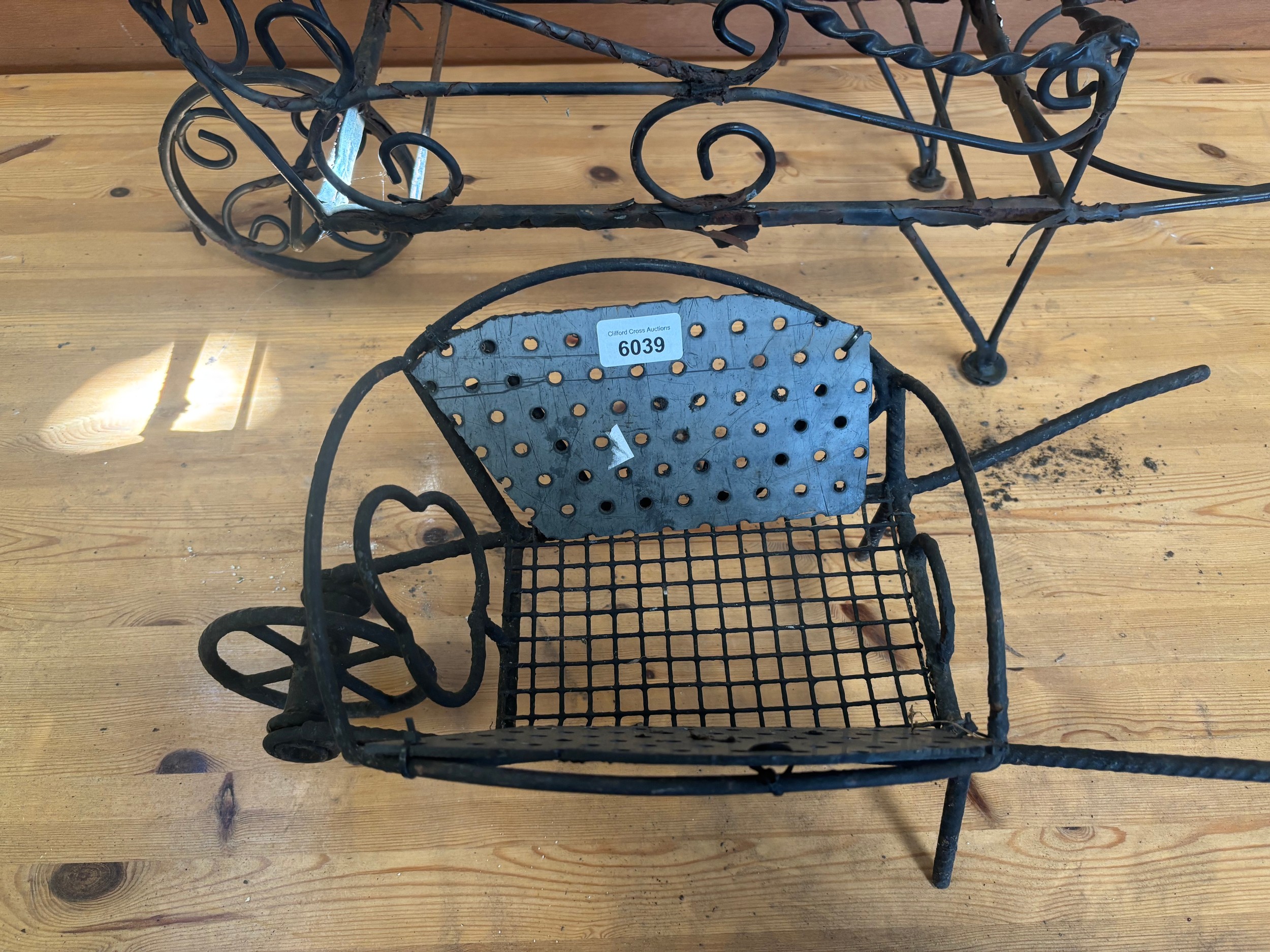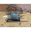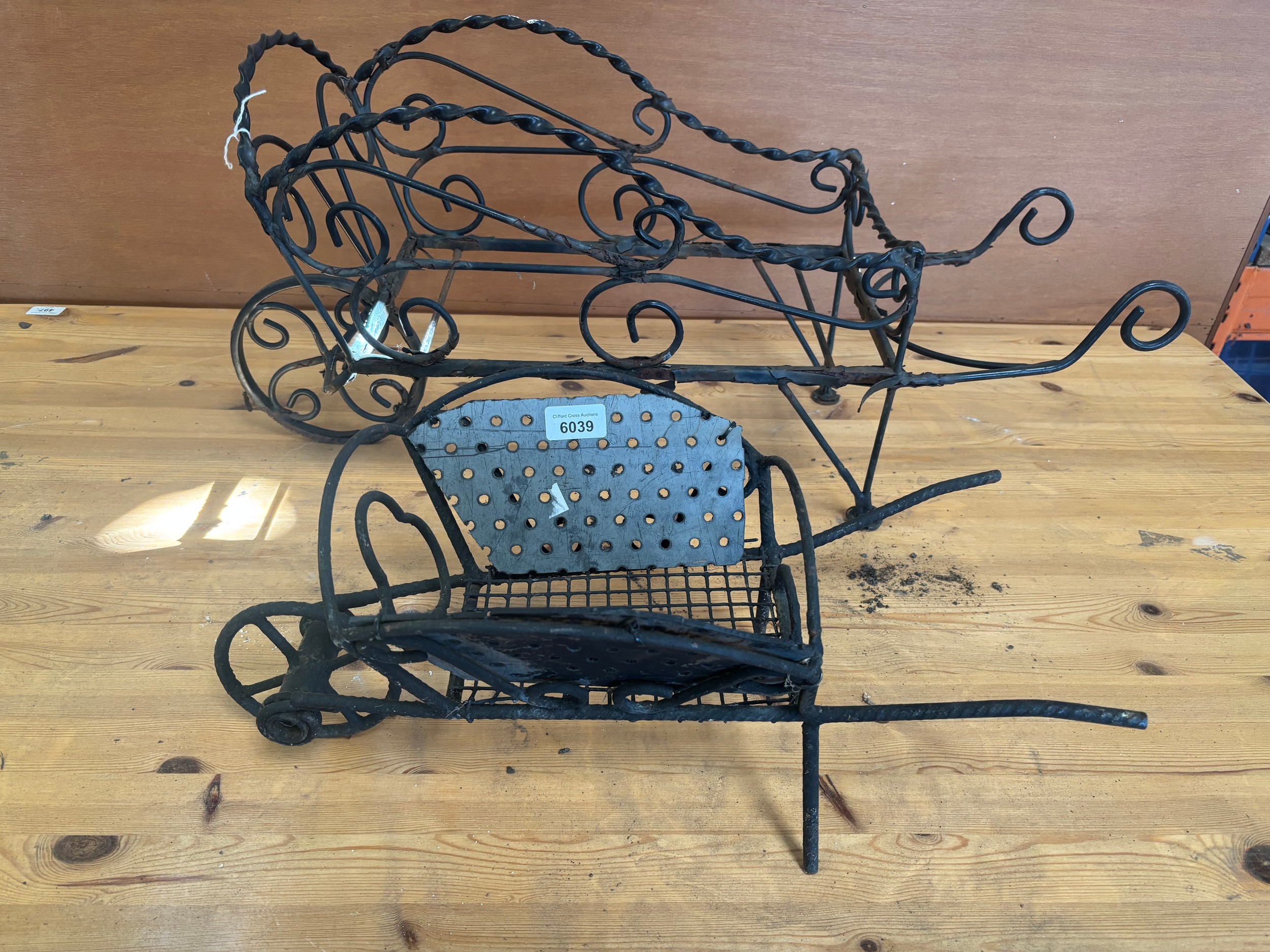 A small and a large wrought iron wheelbarrow planters.