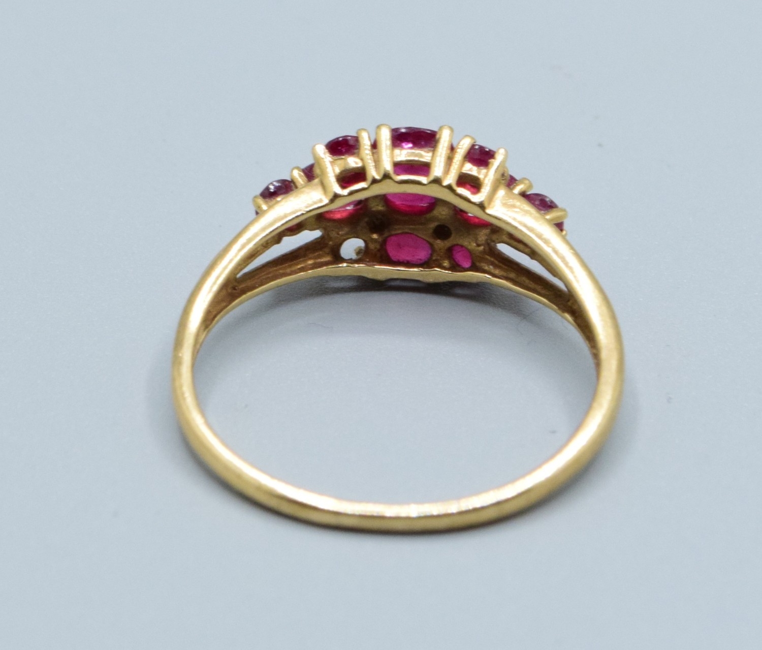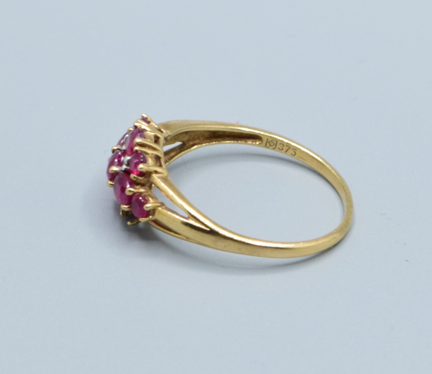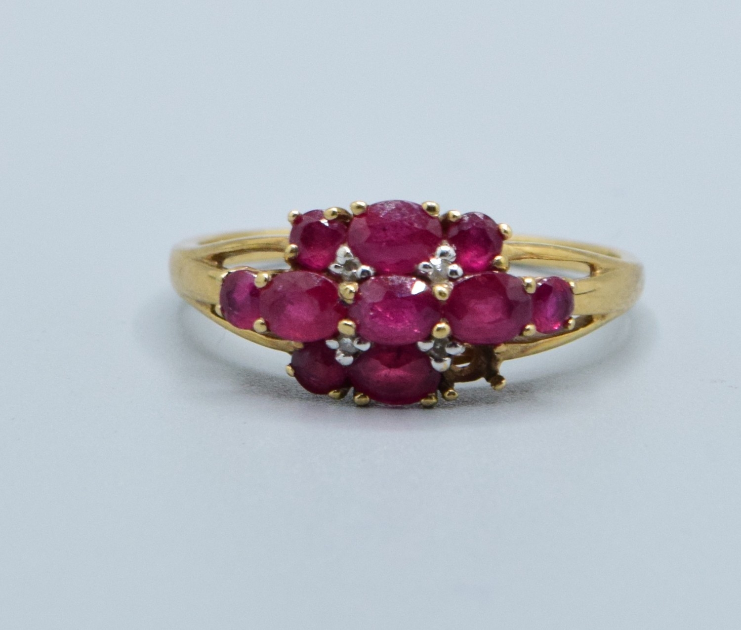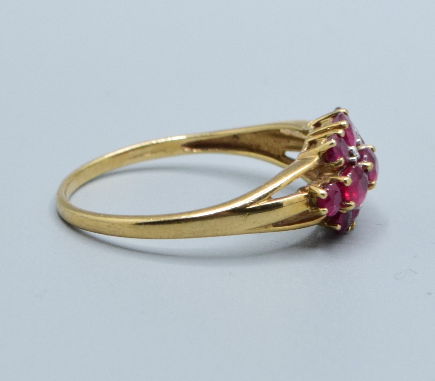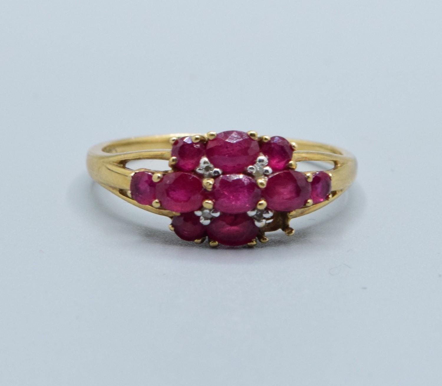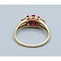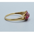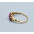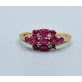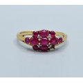 9ct gold ladies vintage Ruby and Diamond triple row statement ring the head being 16mm across, 9mm wide size T2.5grams