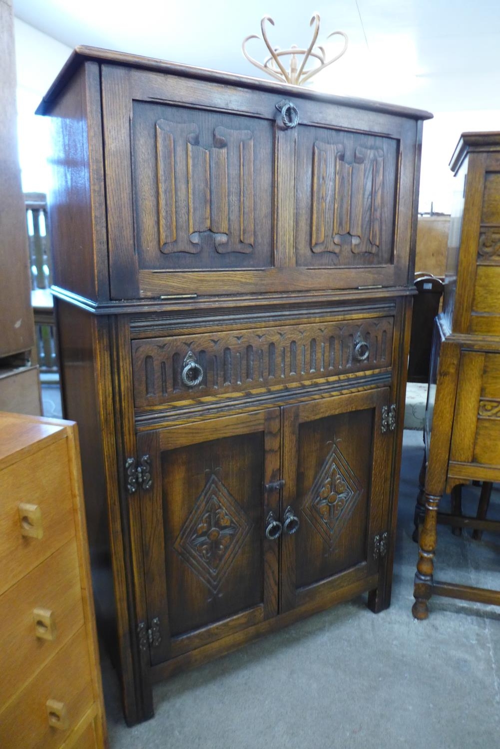 A carved oak linenfold cocktail cabinet