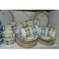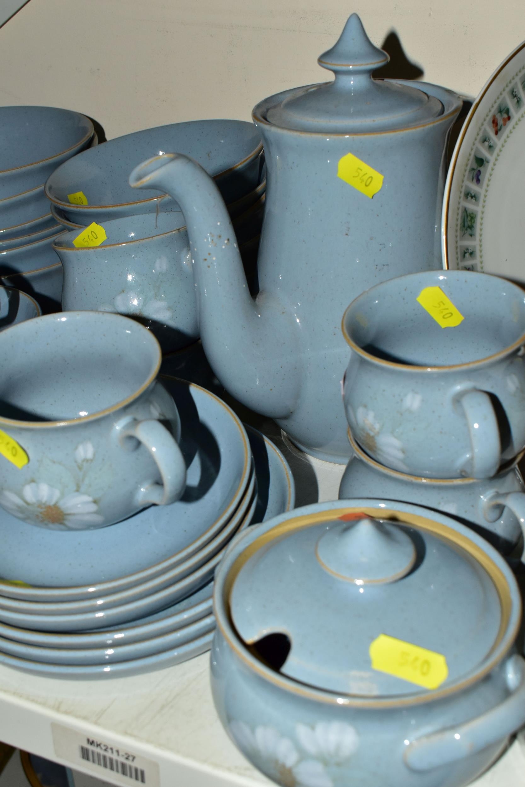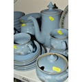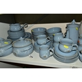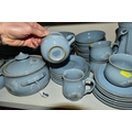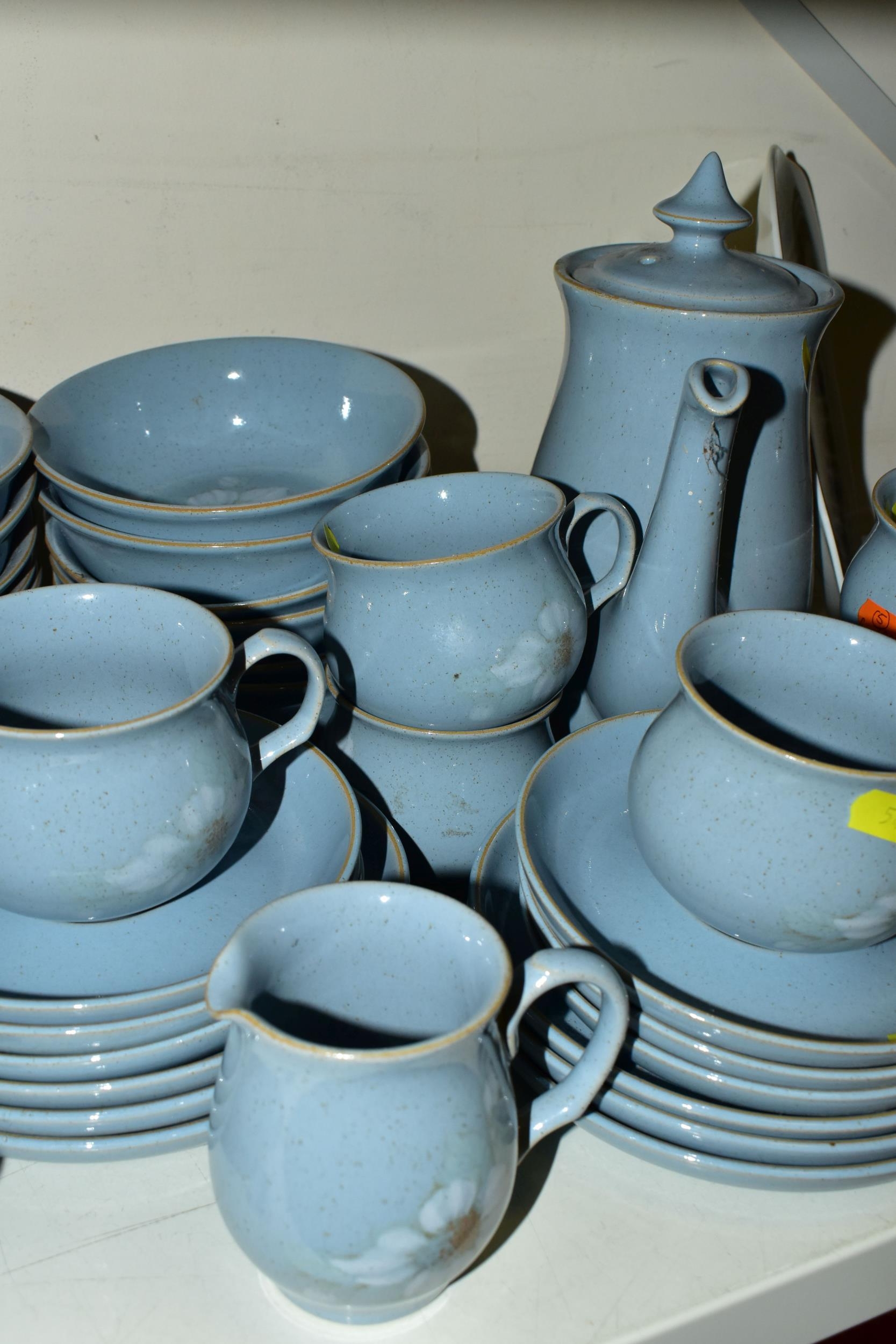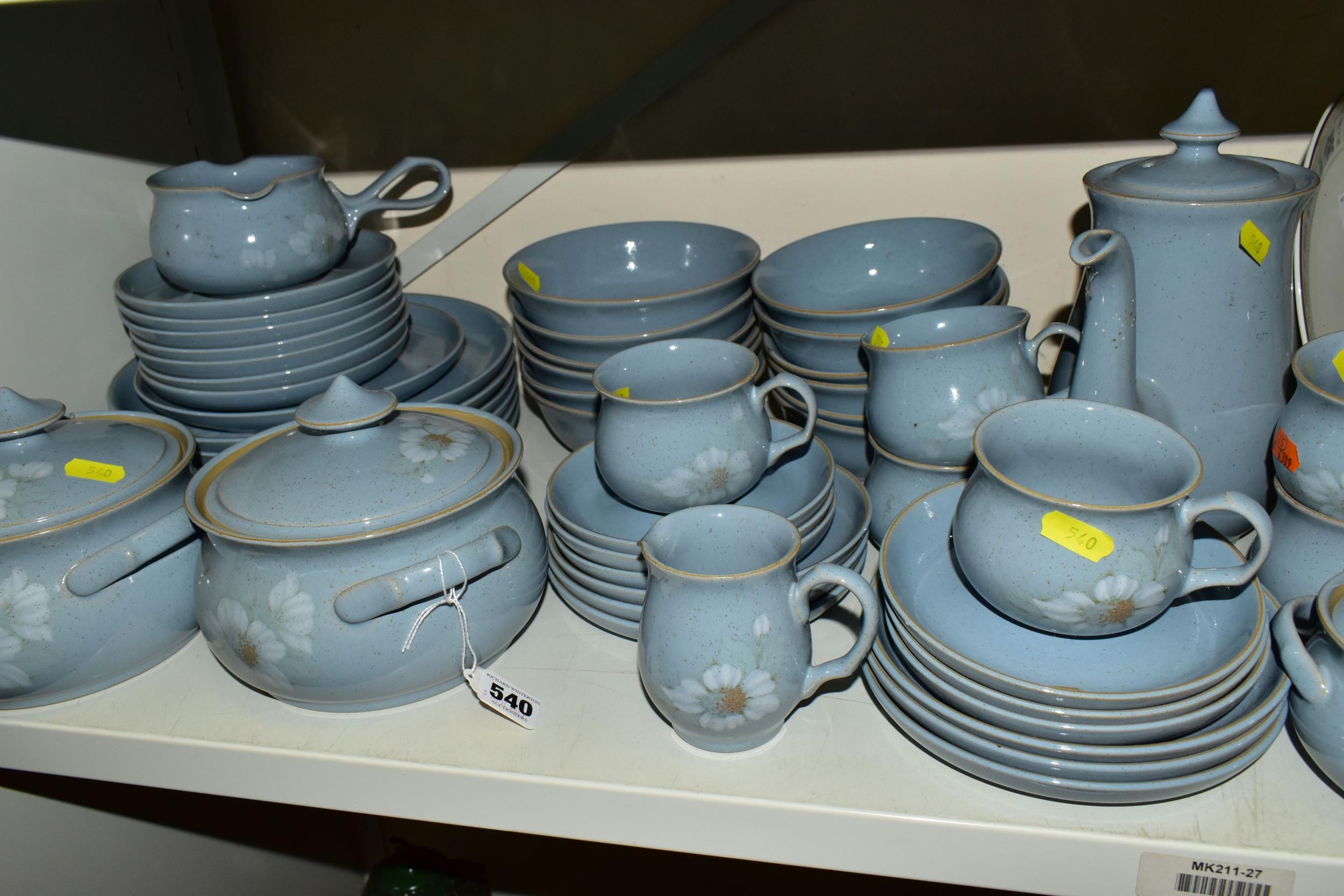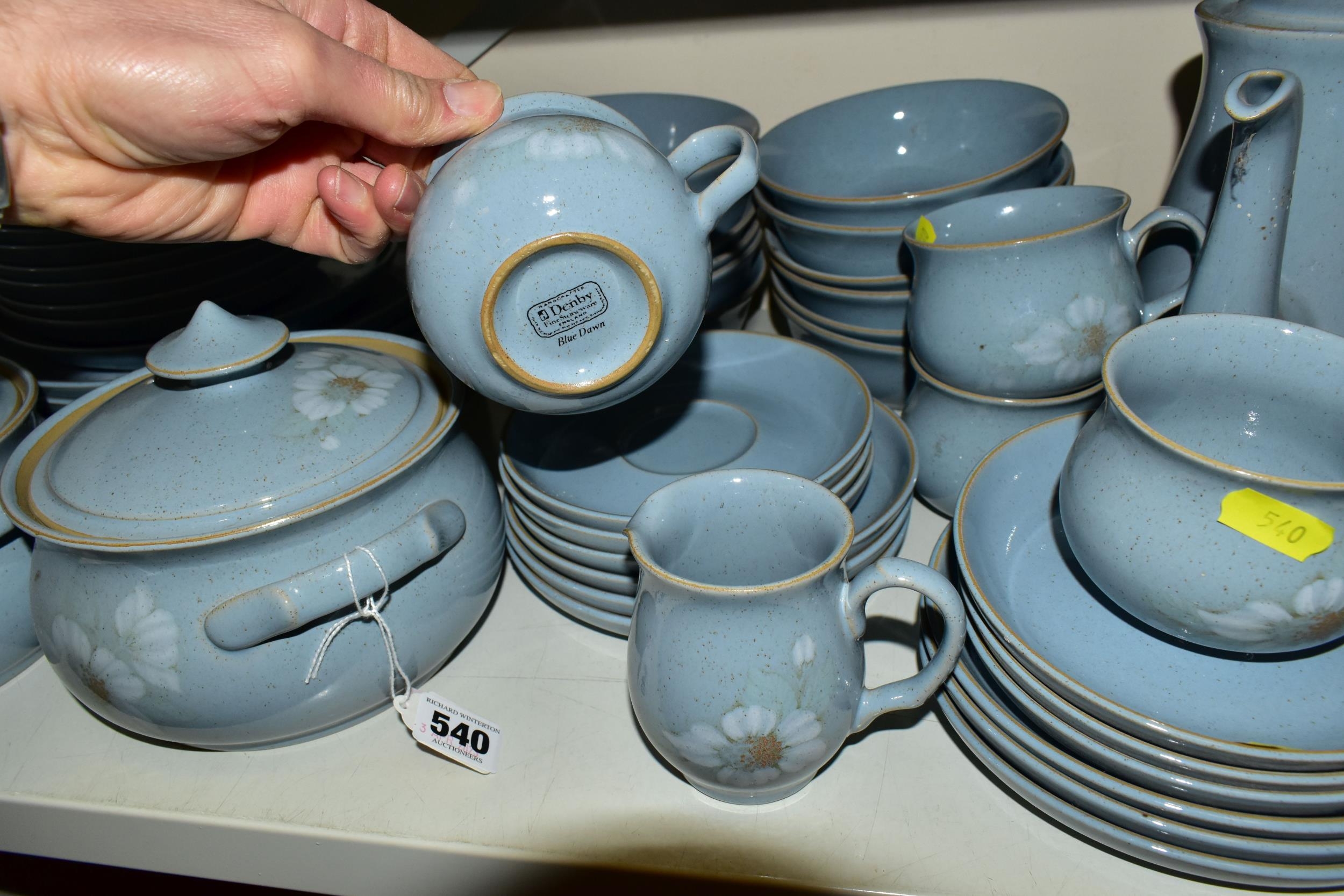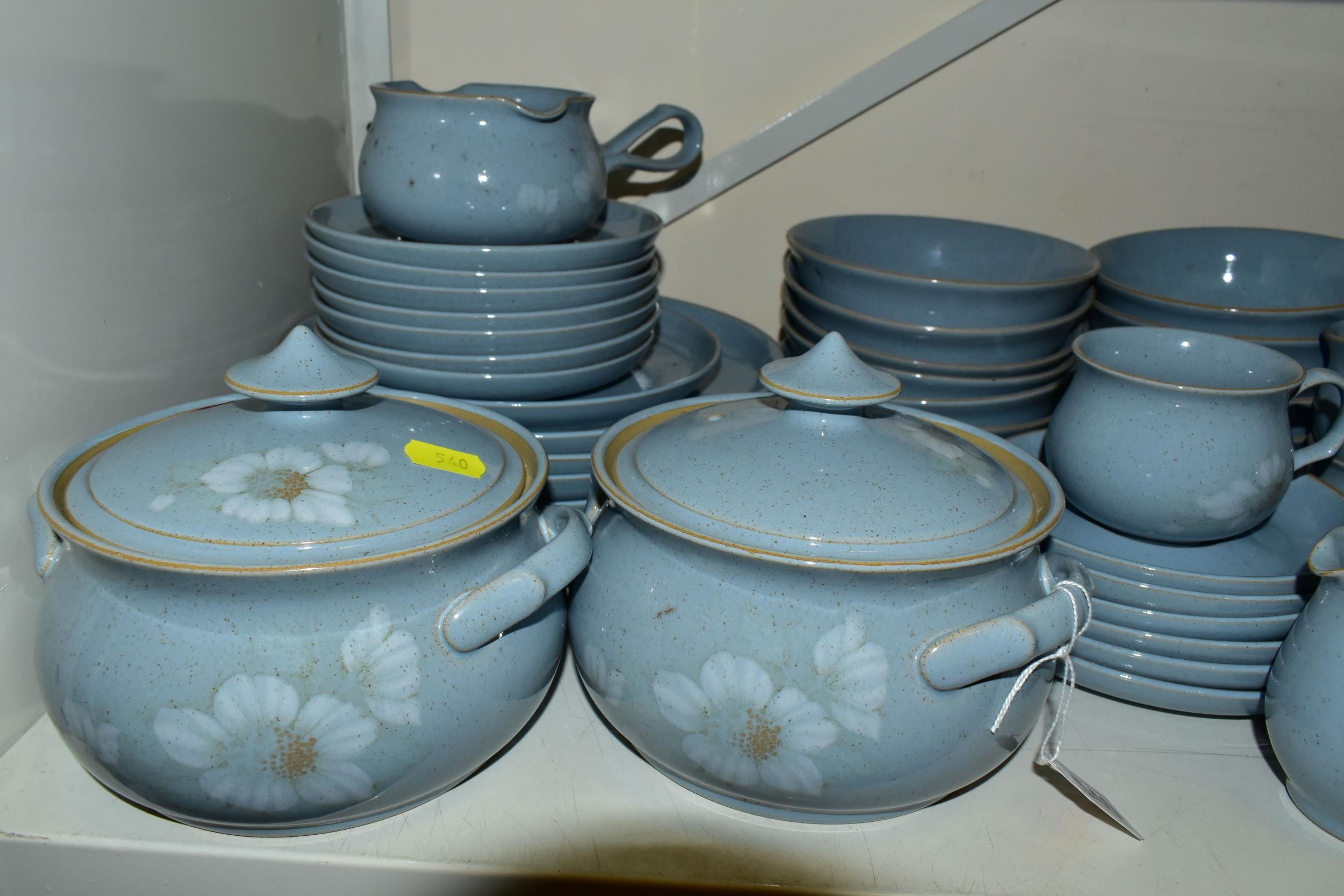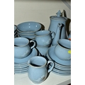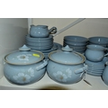 A DENBY 'BLUE DAWN' PATTERN DINNER SERVICE, comprising coffee pot and cover, cream jug, sugar bowl, six coffee cups, six saucers, twelve side plates, six dessert / cereal bowls, six soup bowls, a 21cm plate, six dinner plates, two twin handled tureens and covers and a sauceboat on stand (50) (Condition Report: in good condition overall but would benefit from a clean)