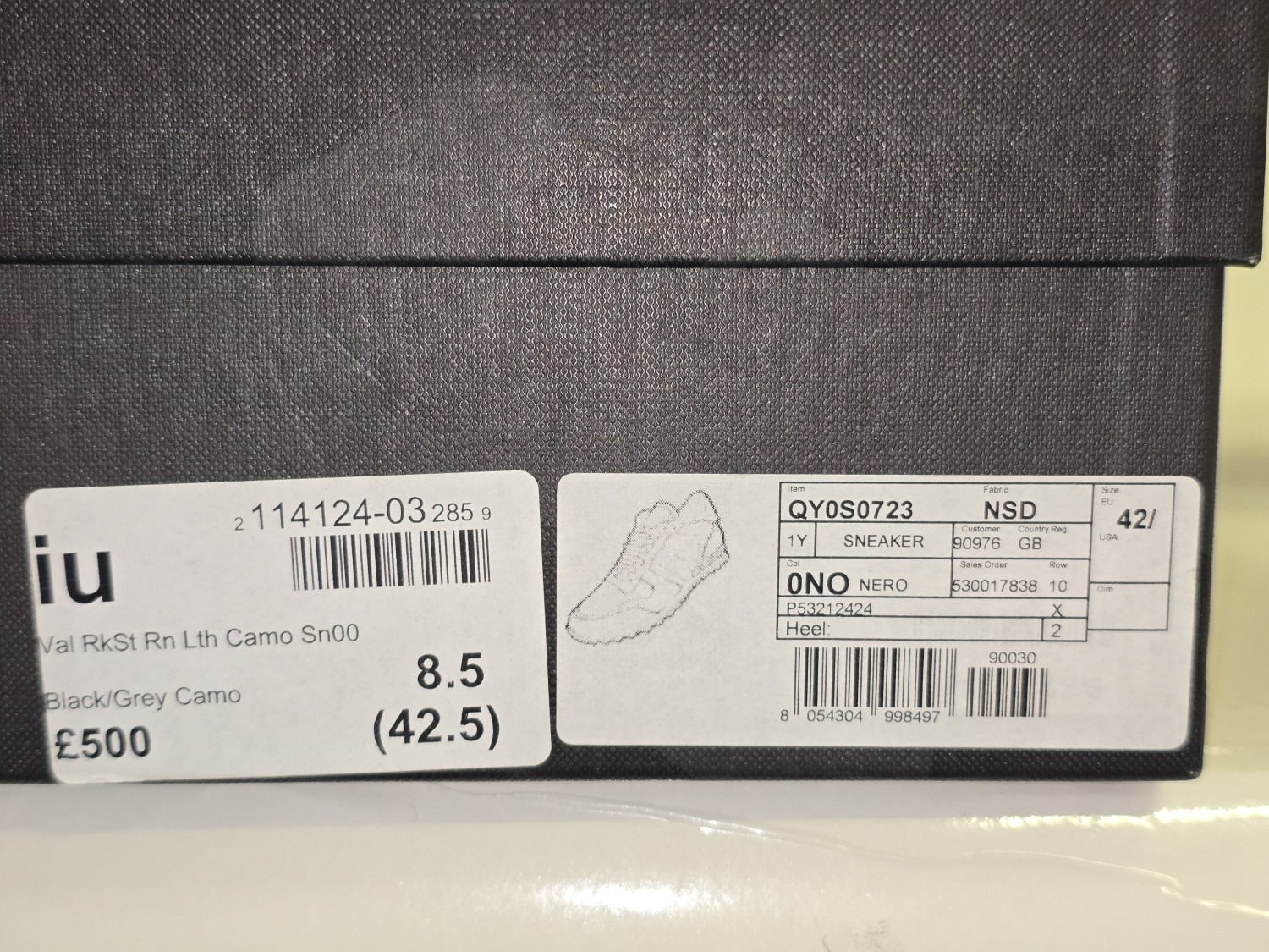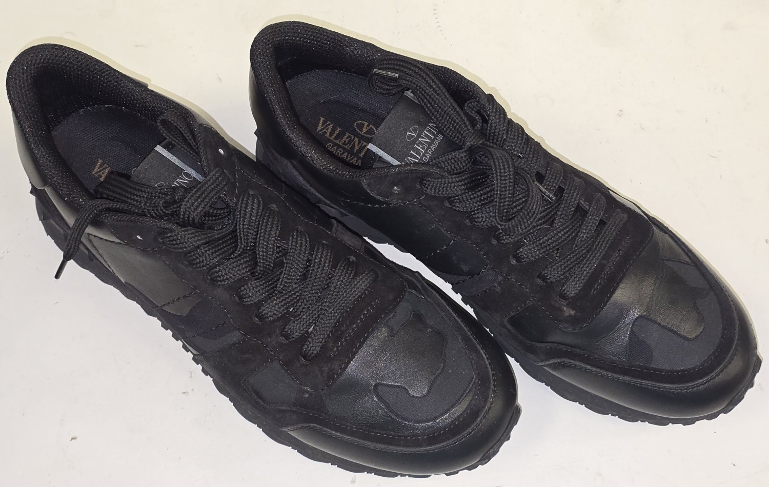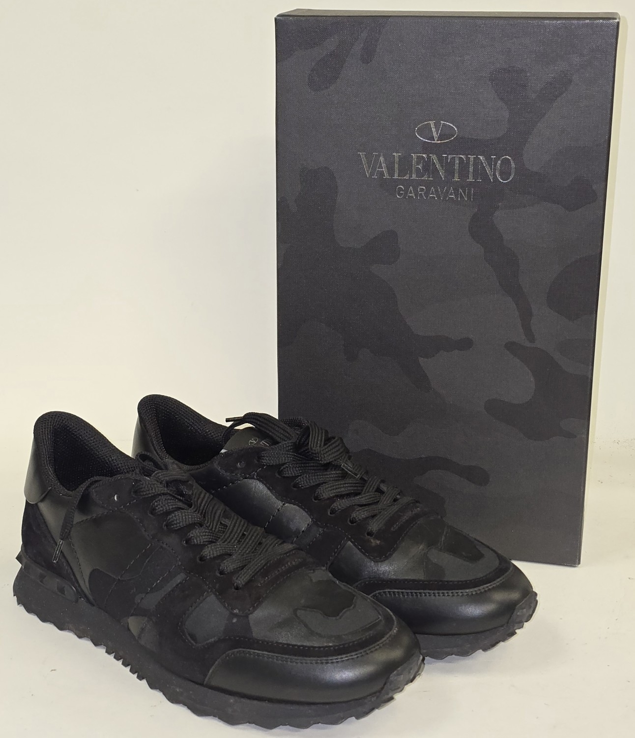Valentino Garavani designer Black/Grey Camo sneakers size 8.5. Sold as pre-owned/used condition (REF P2).