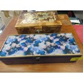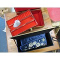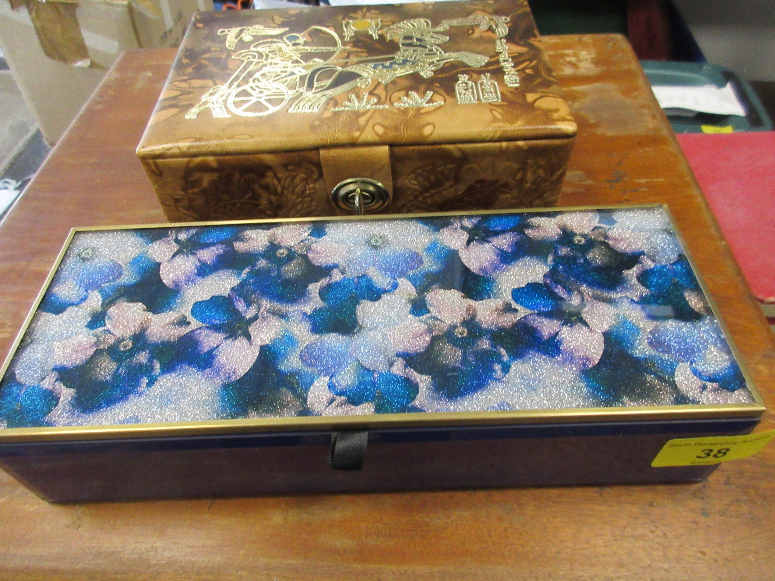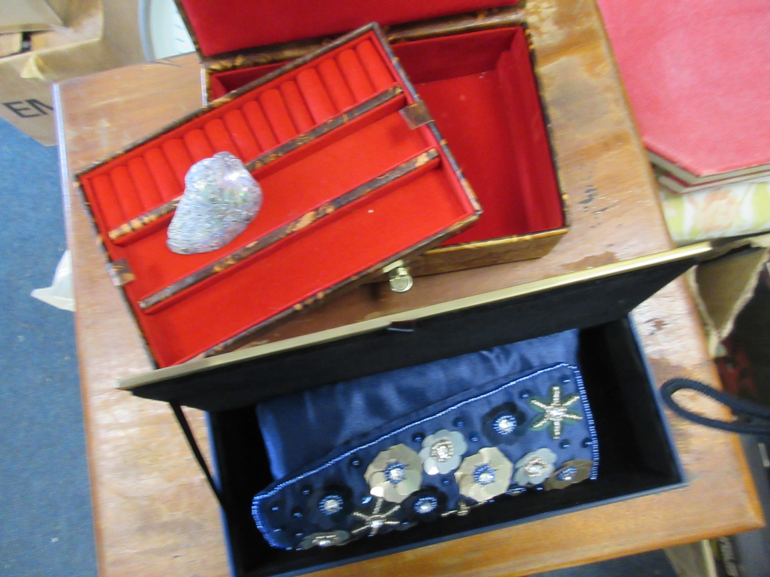 A Marks & Spencer blue jewellery box with hinged lid, a leather-effect jewellery box with lift-out tray and Egyptian style embossed decoration, and a blue silk jewellery pouch with two zipped pockets